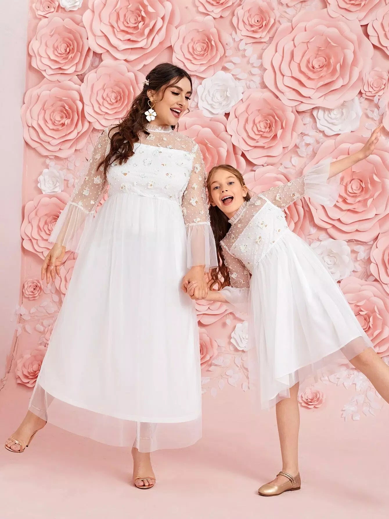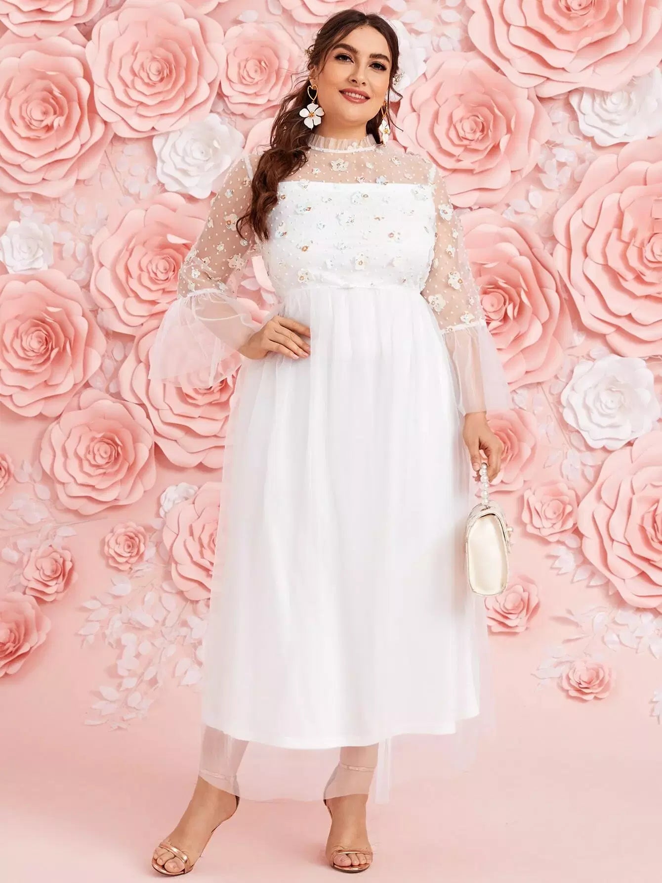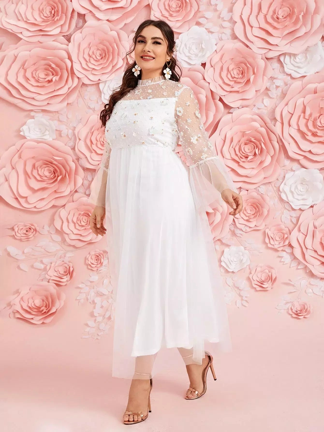 Plus 1 PC Floral Appliques Frill Neck Organza Overlay Dress