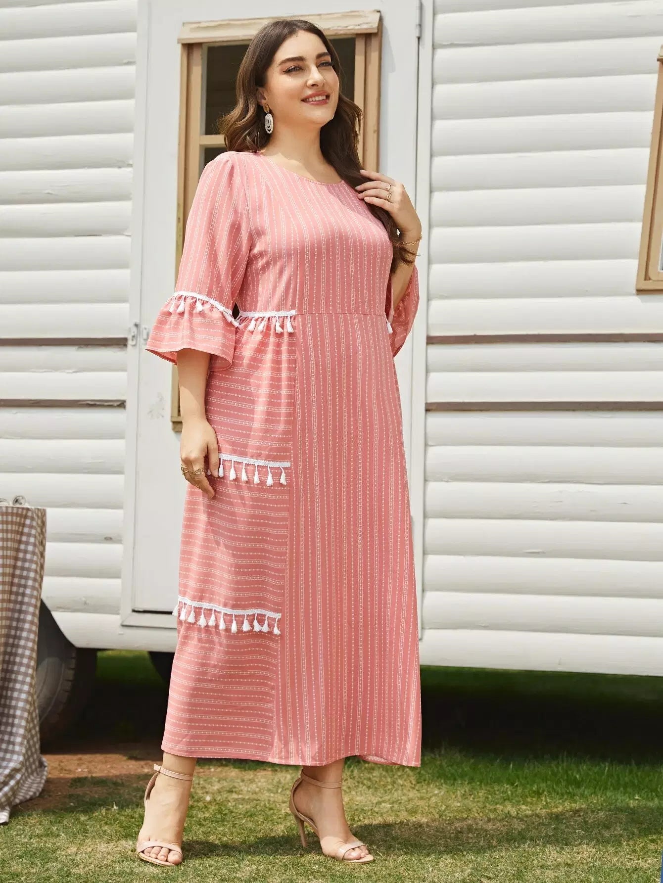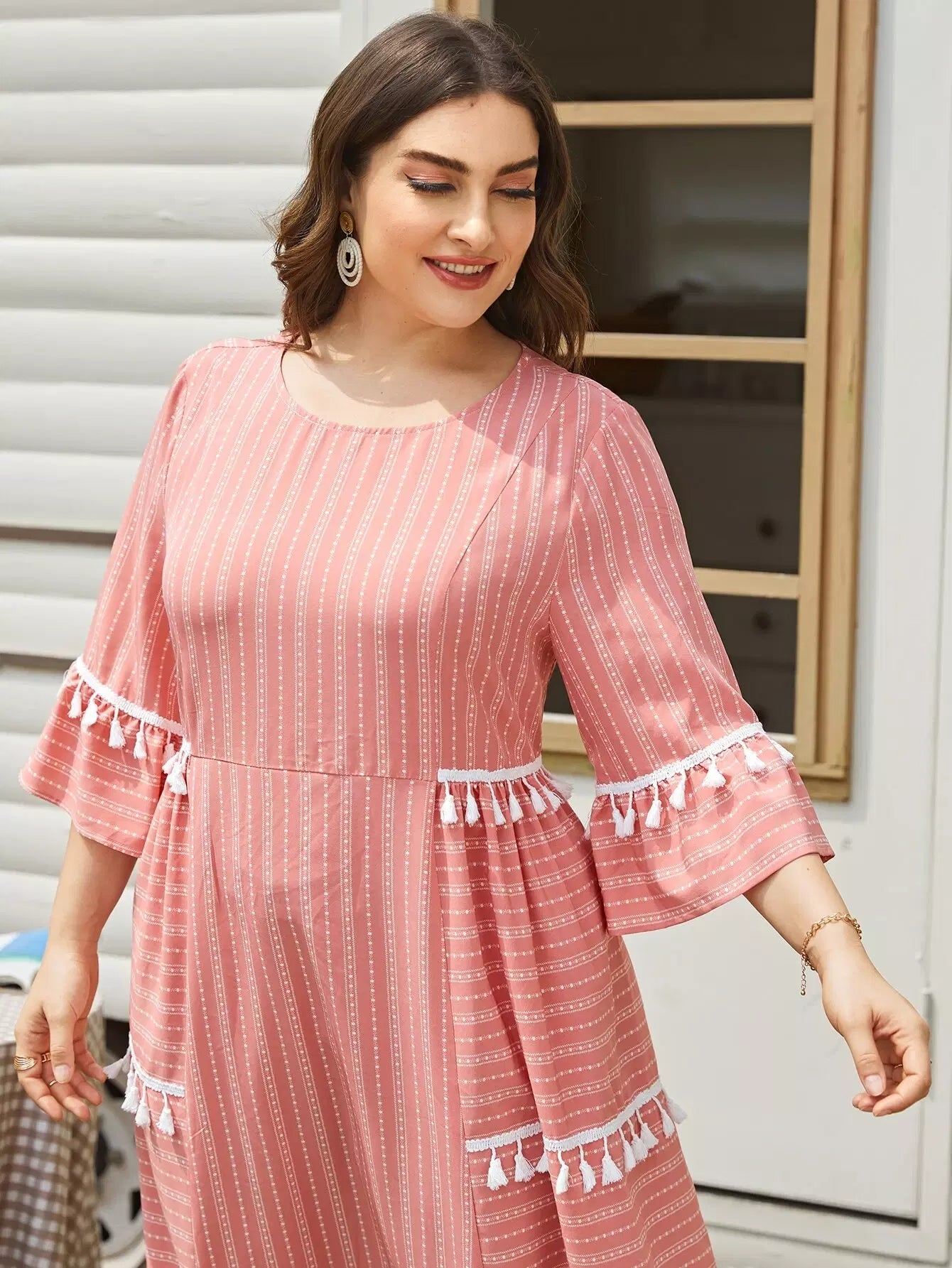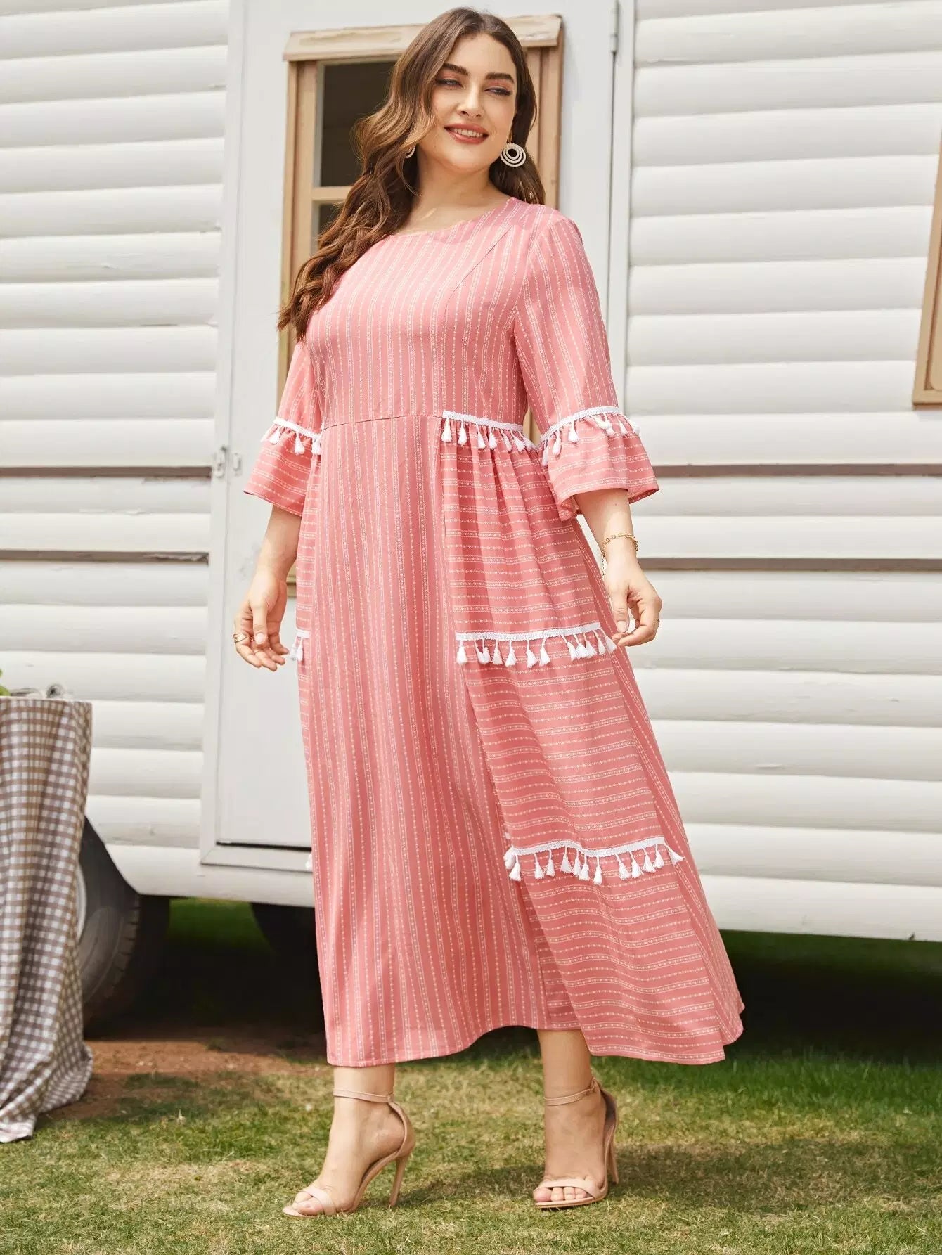 Plus 1PC Flounce Sleeve Contrast Tassel Detail Dress