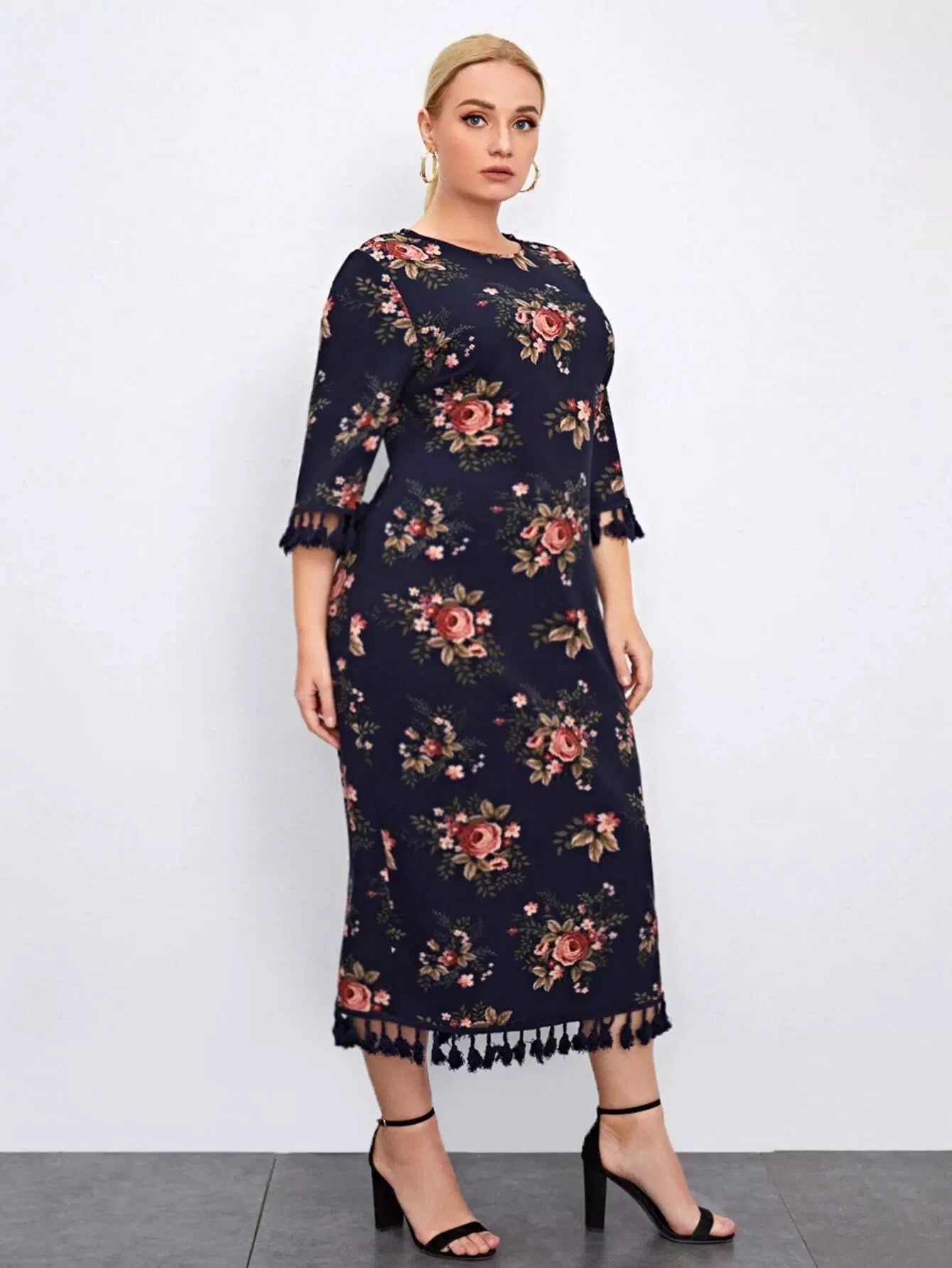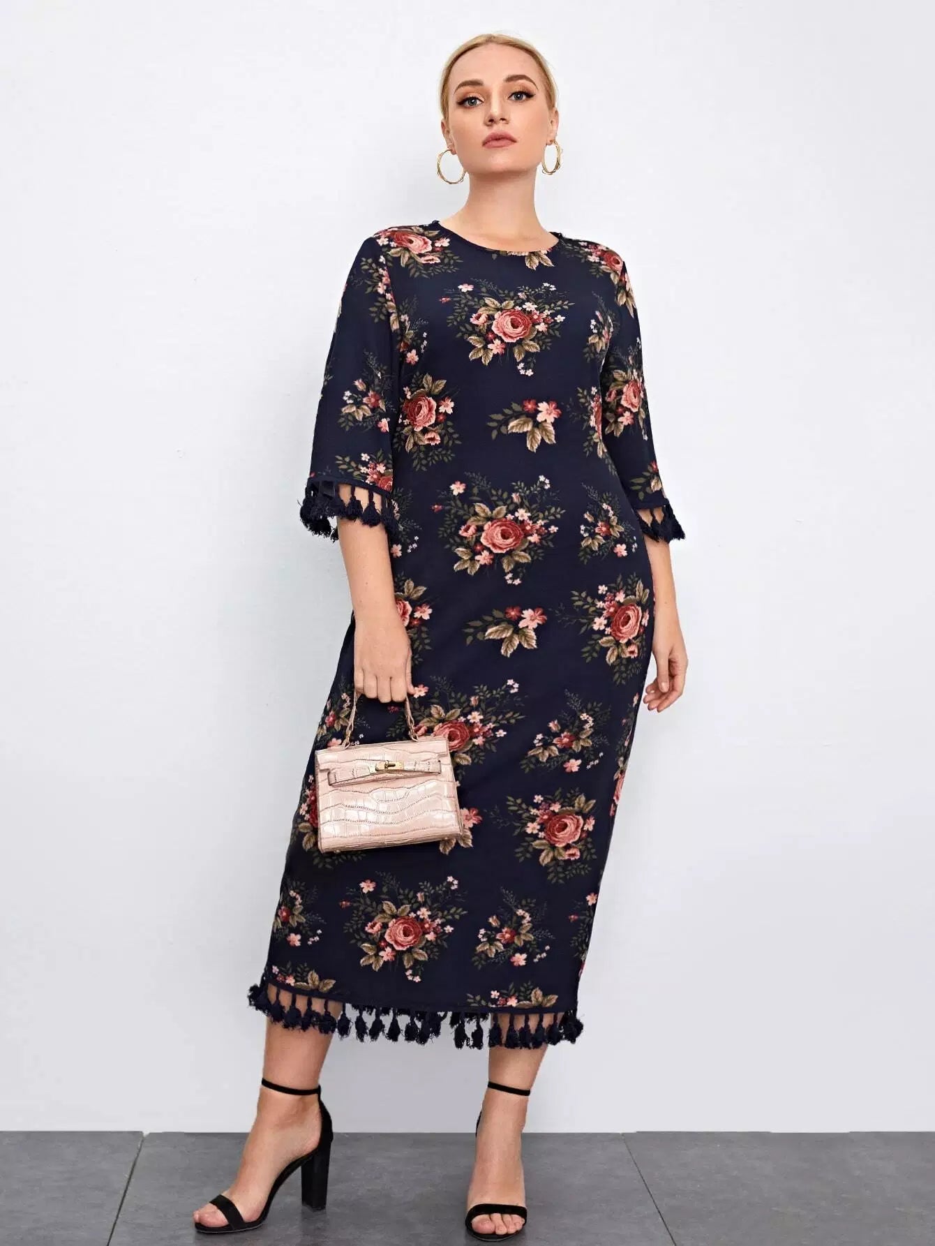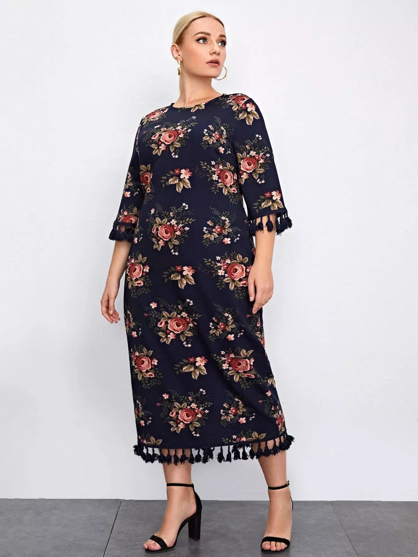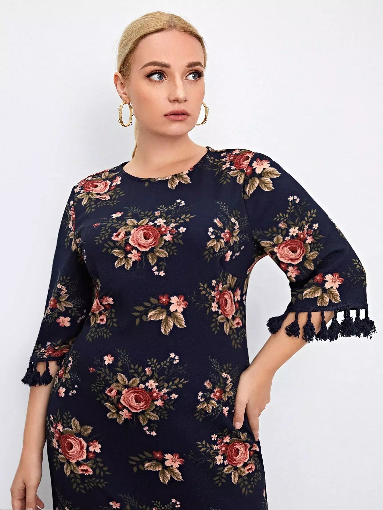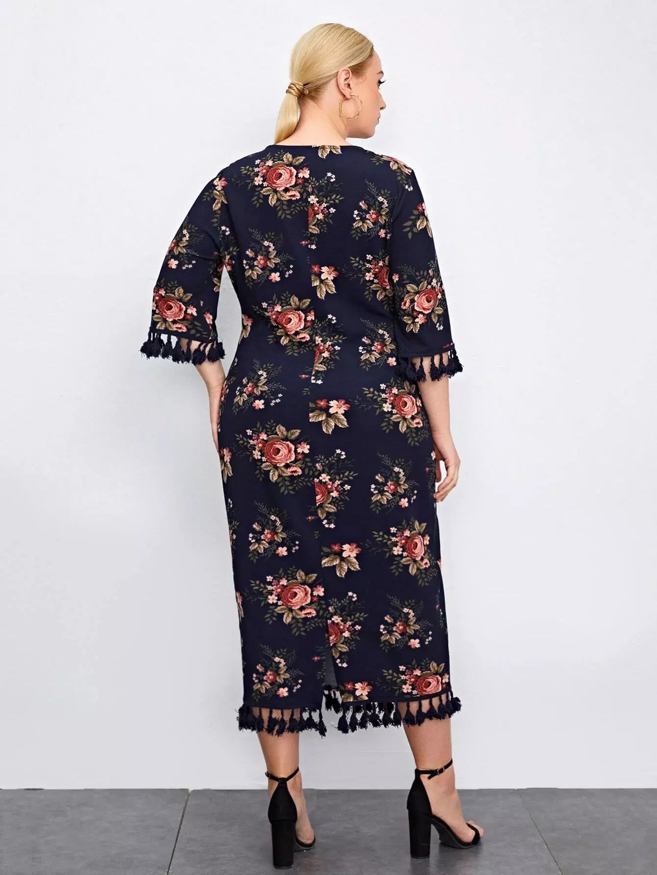Plus Allover Floral Print Tassel Trim Split Hem Dress