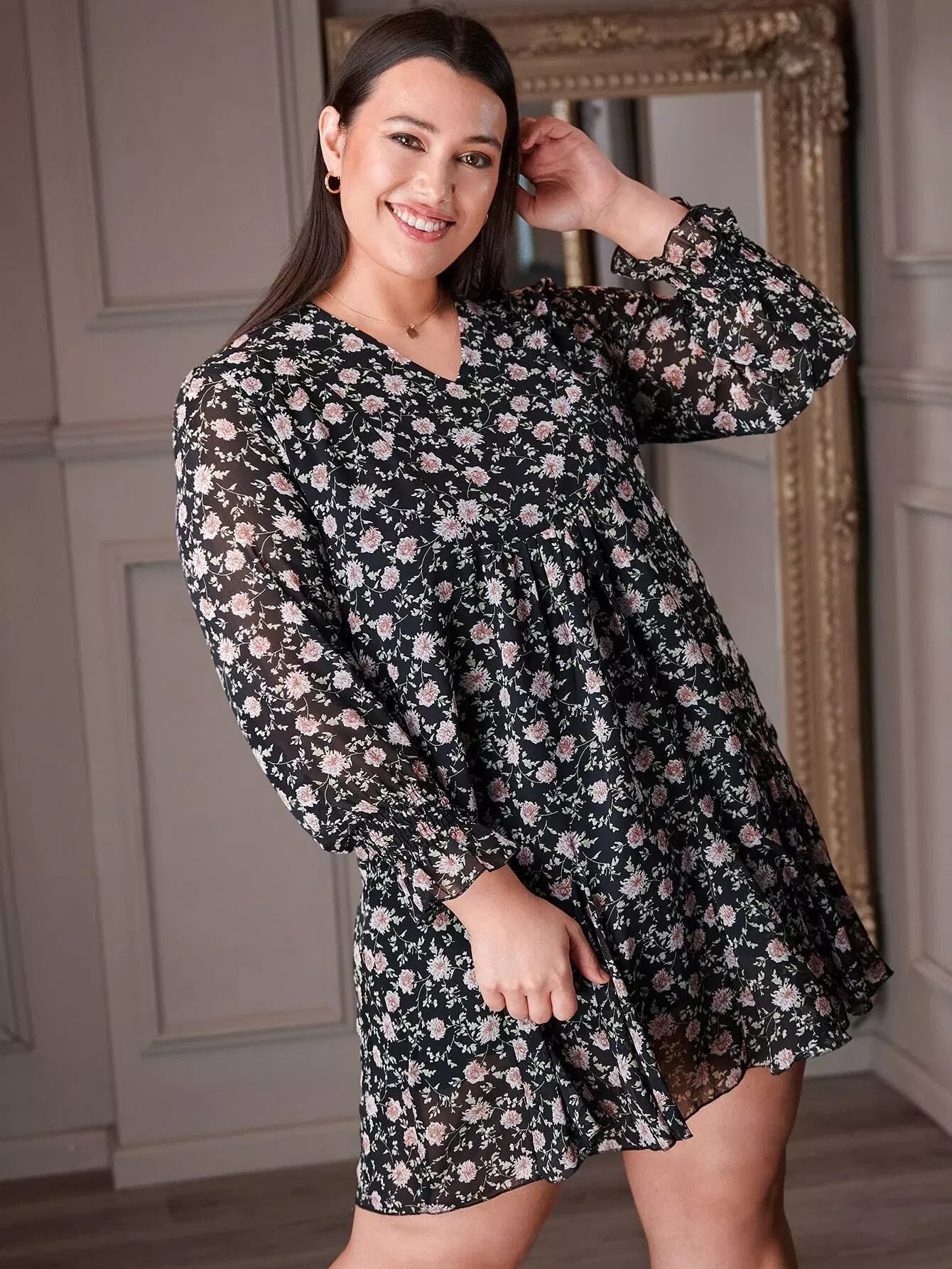 Plus Allover Floral Print V-neck Dress