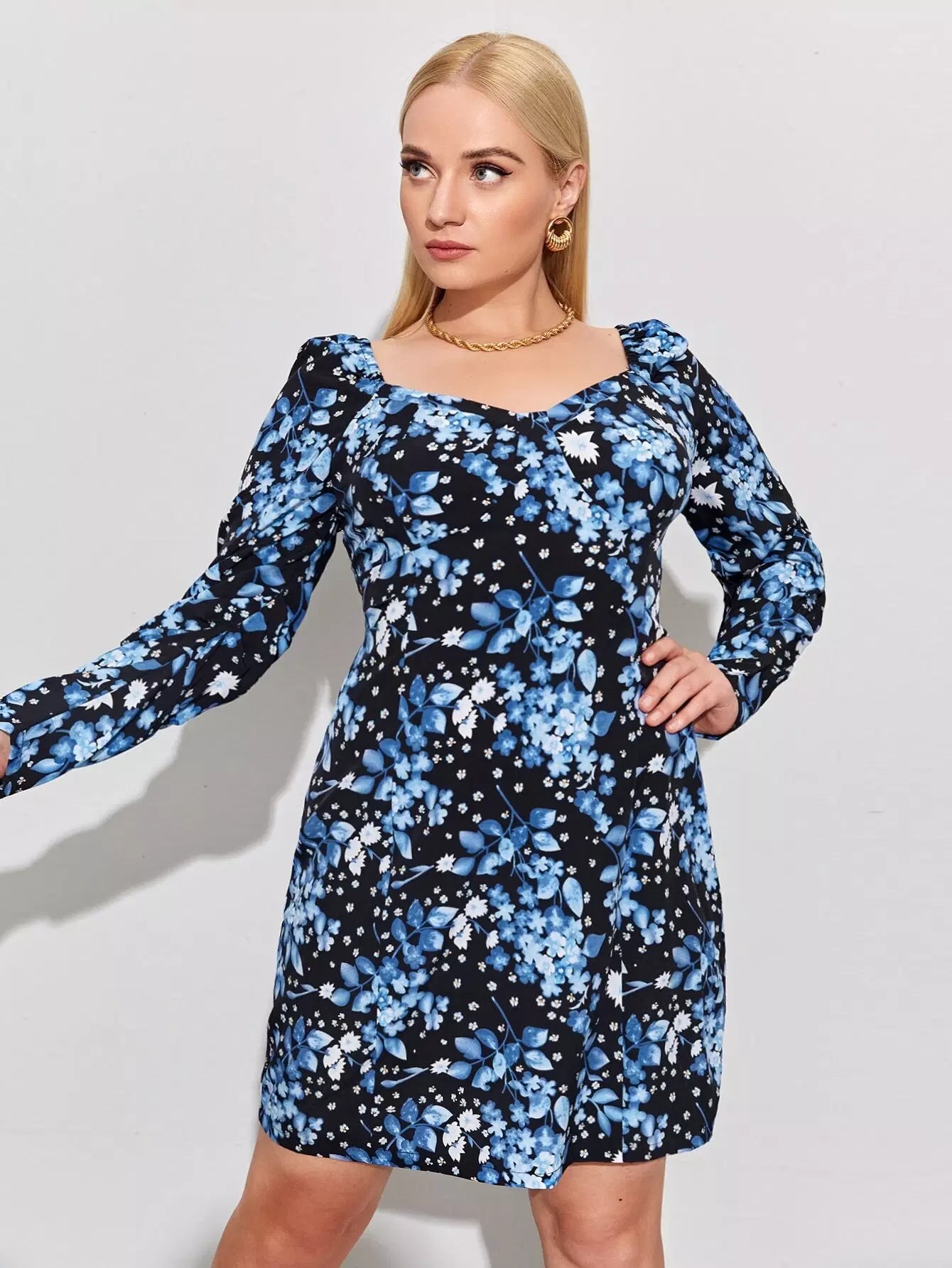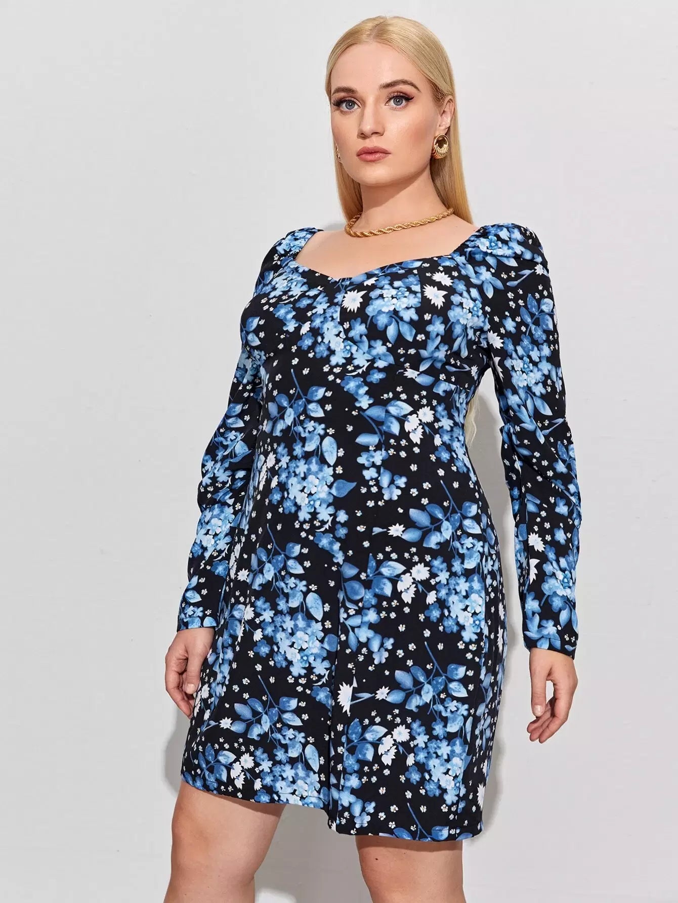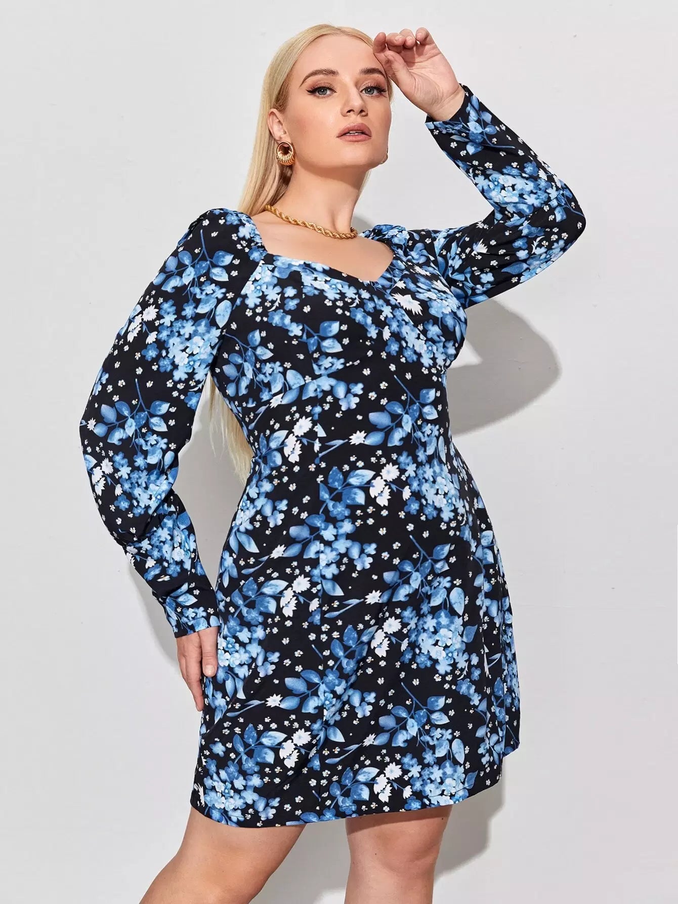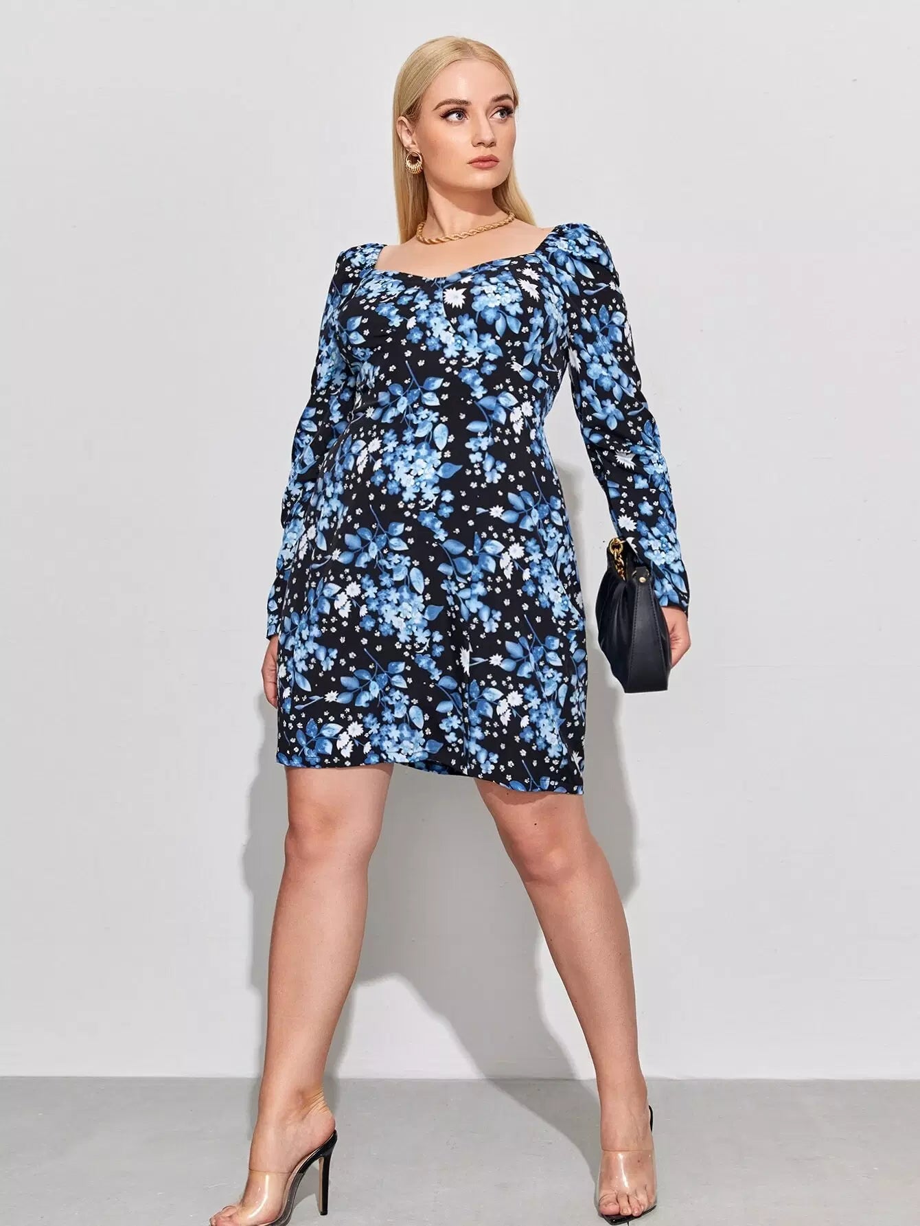 Plus Allover Floral Sweetheart Neck Milkmaid Dress