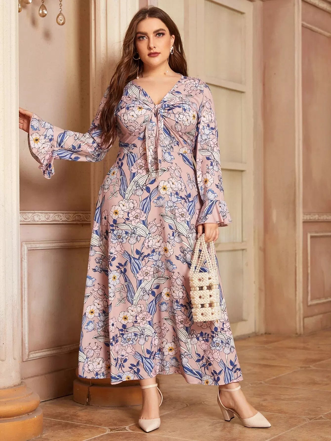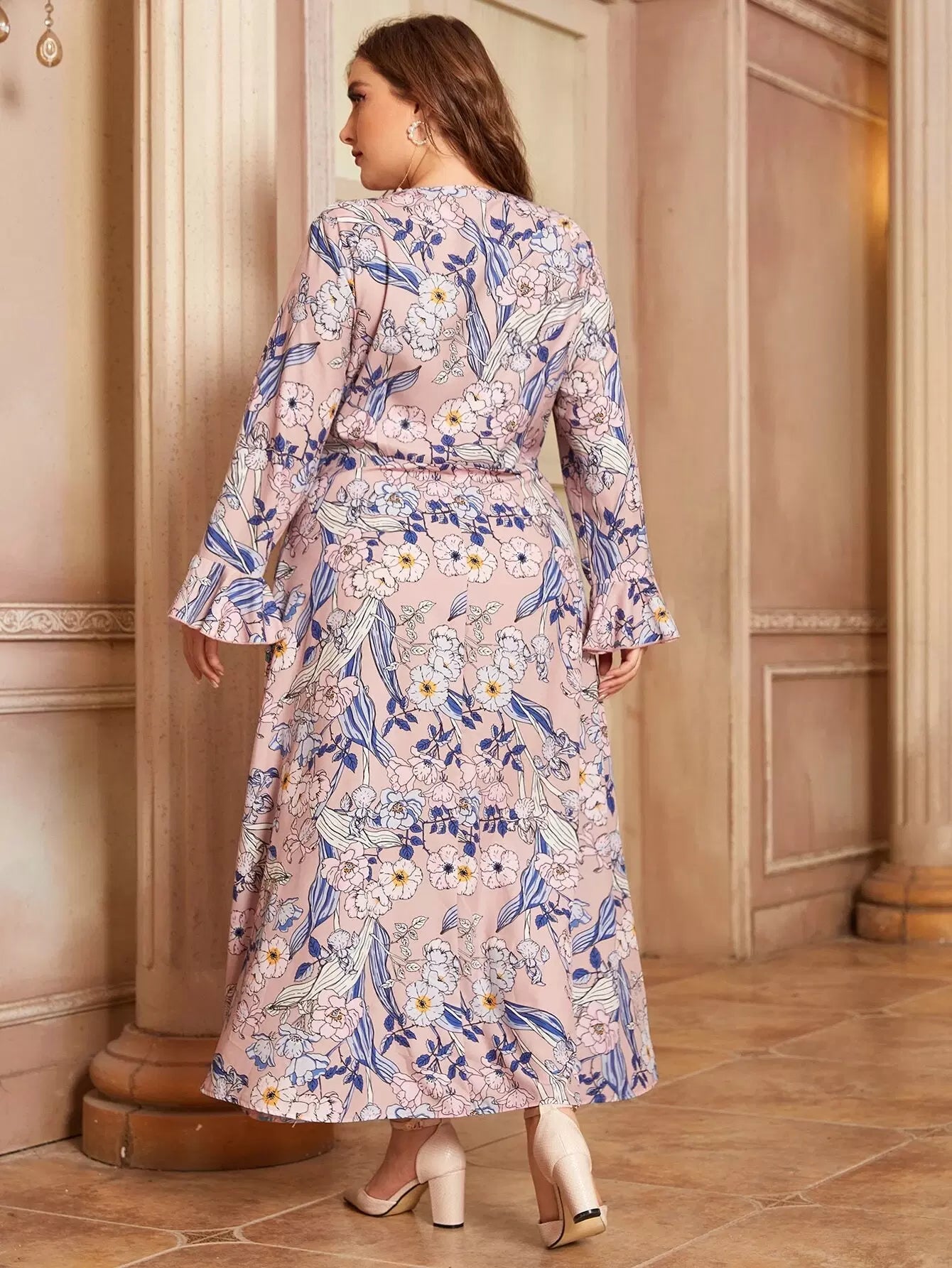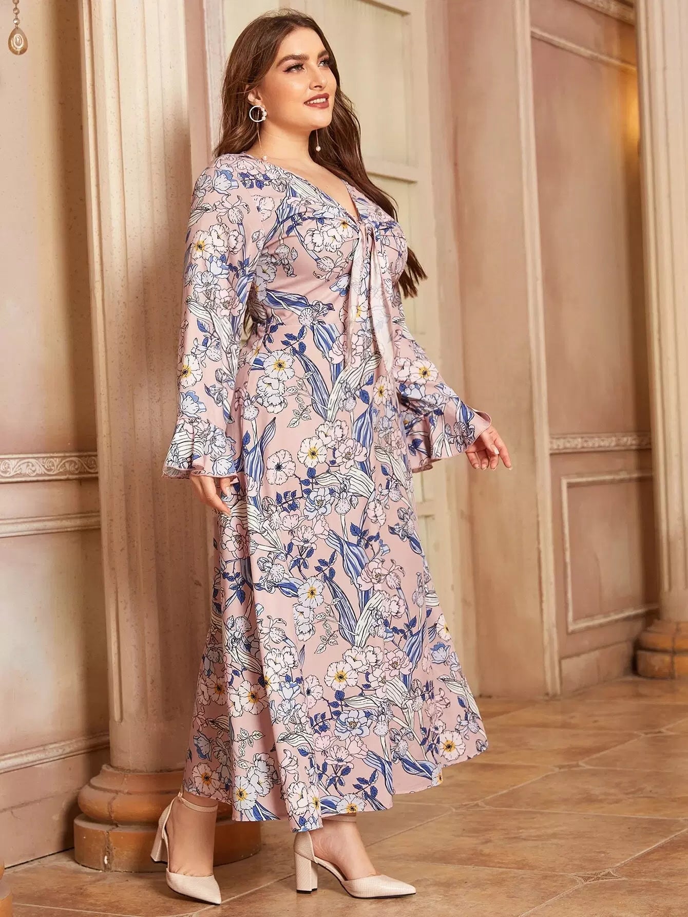 Plus Allover Floral Tie Front Flounce Sleeve Dress