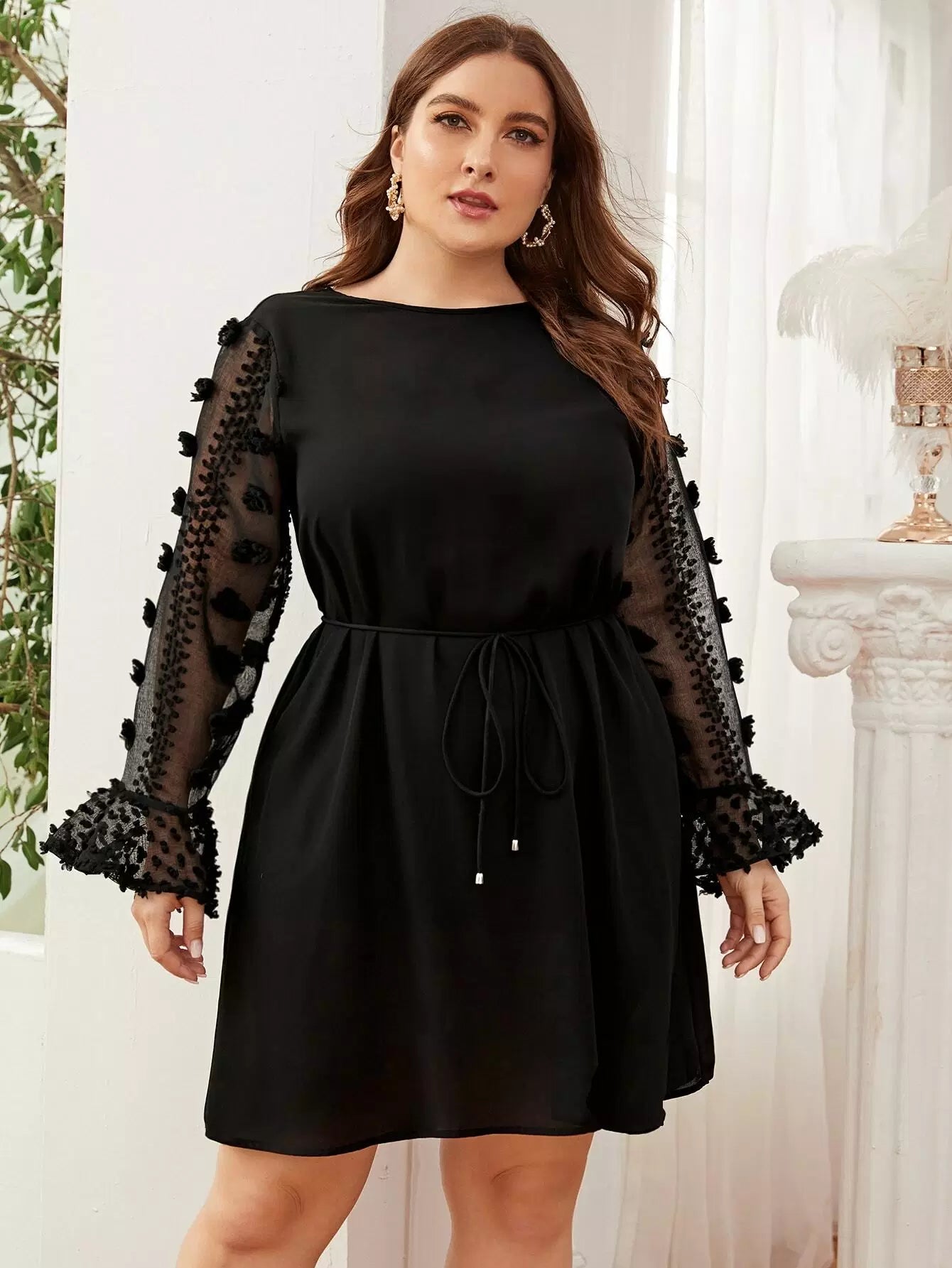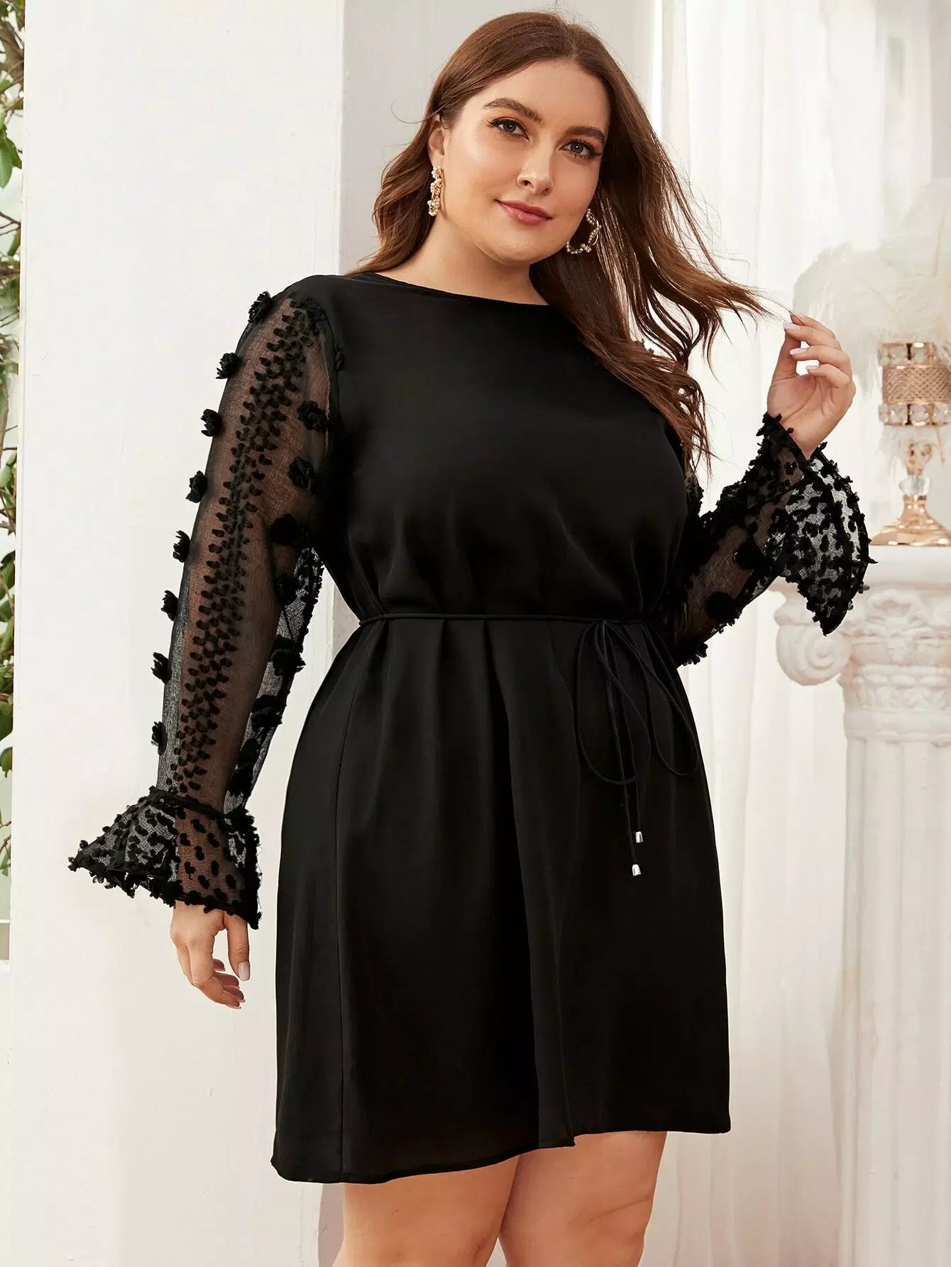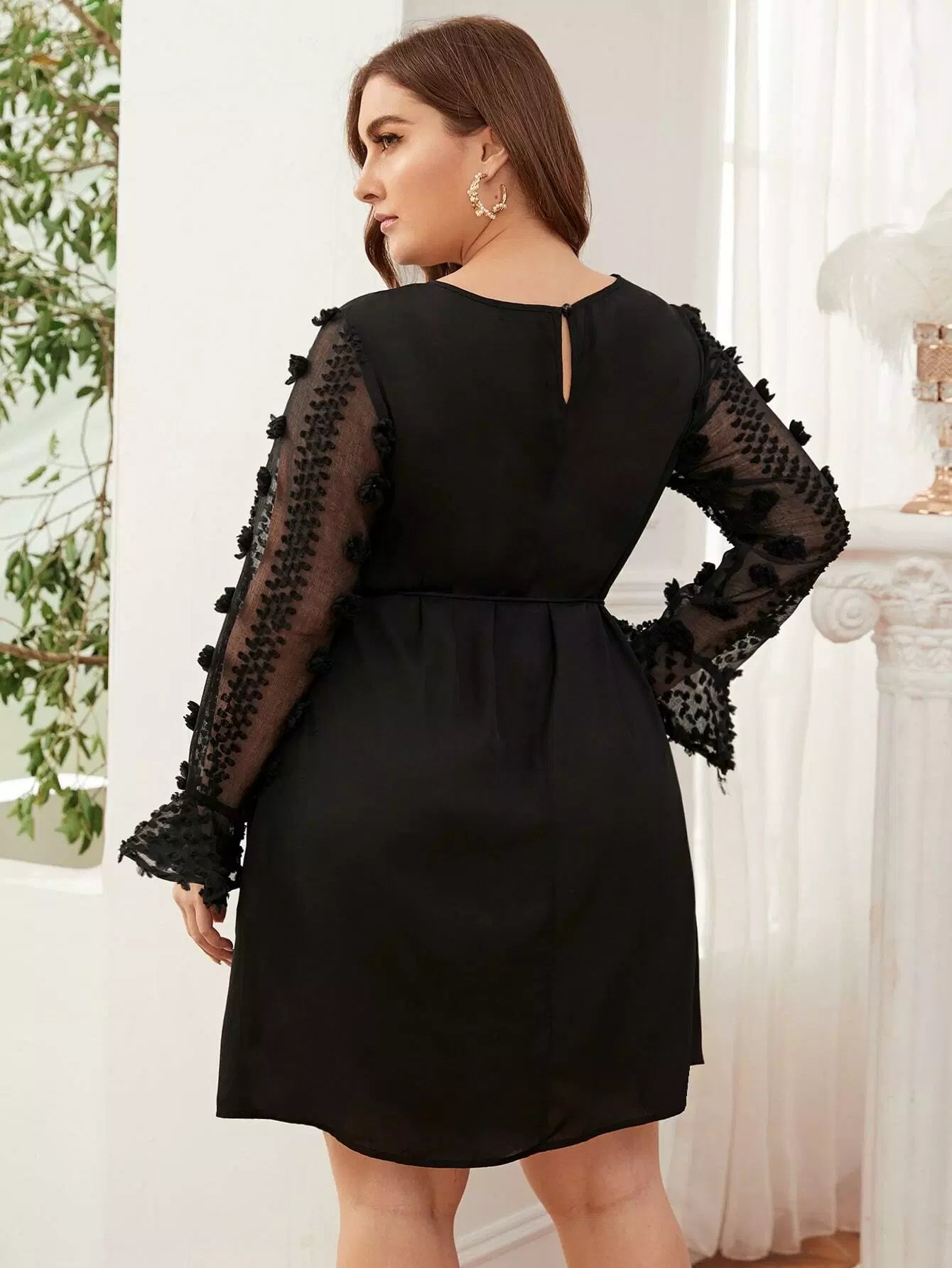 Plus Applique Detail Sheer Flounce Sleeve Dress Without Belt