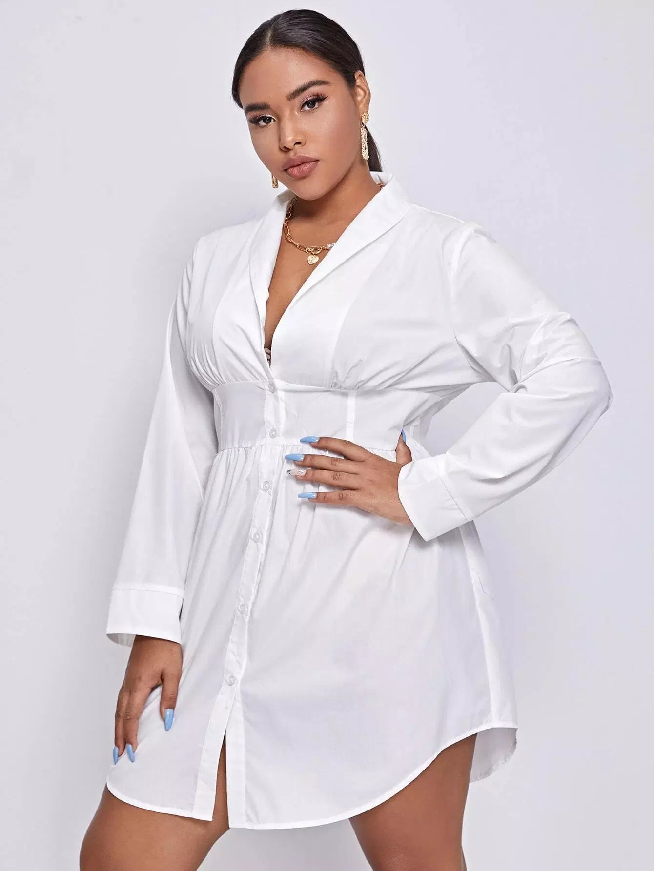 Plus Binded Waist Button-Front Mini Shirt Dress