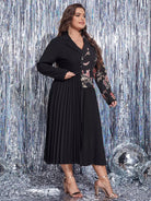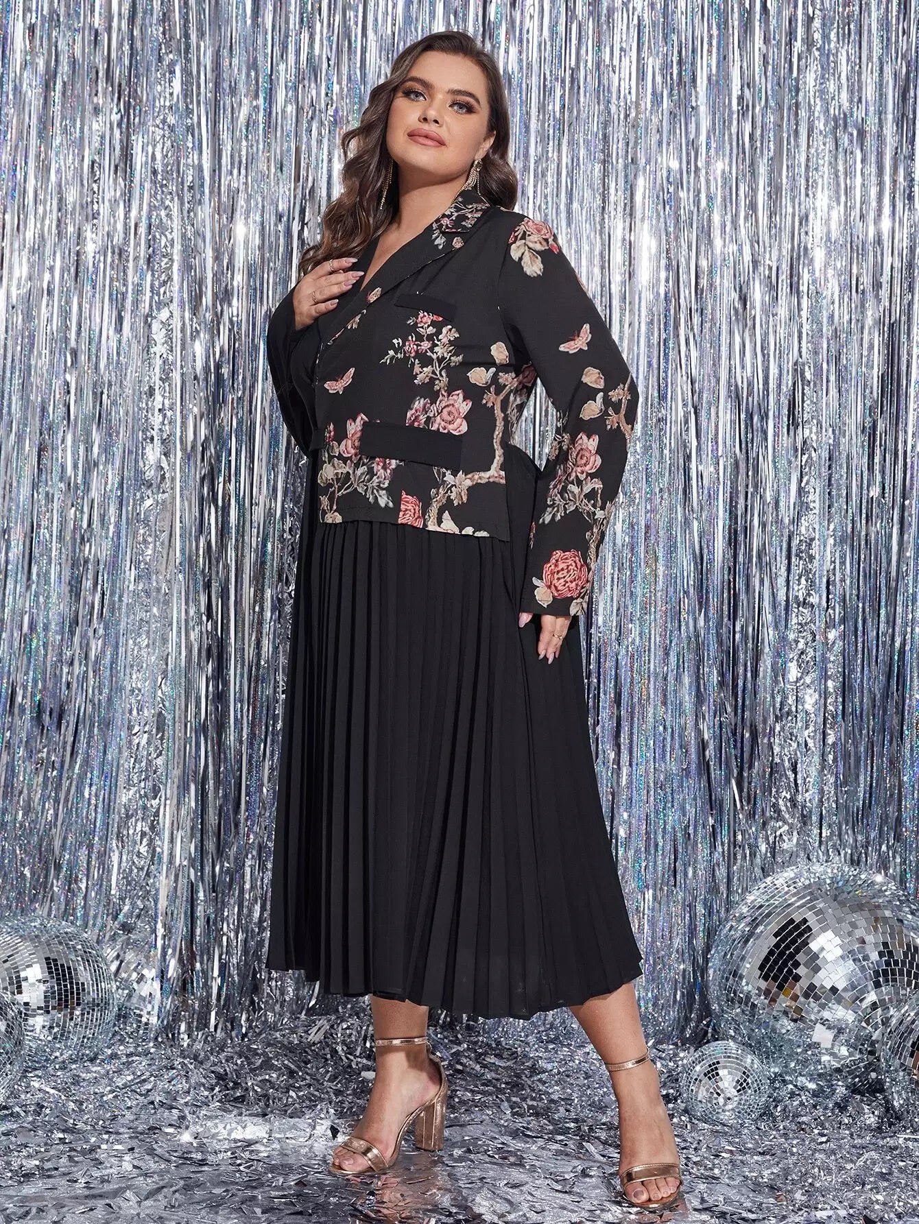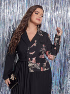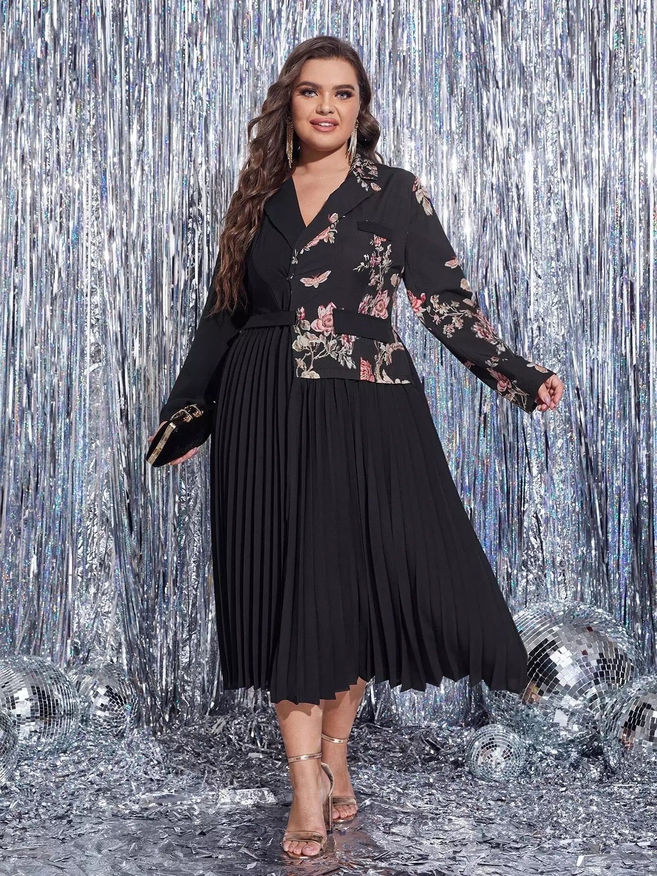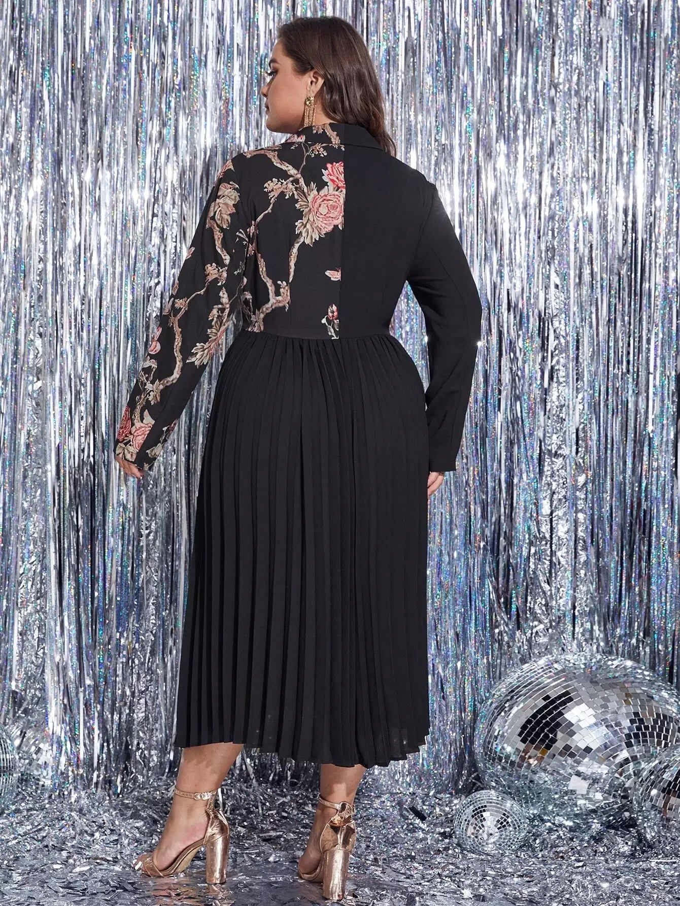 Plus Butterfly & Floral Print Lapel Neck Pleated Hem Dress