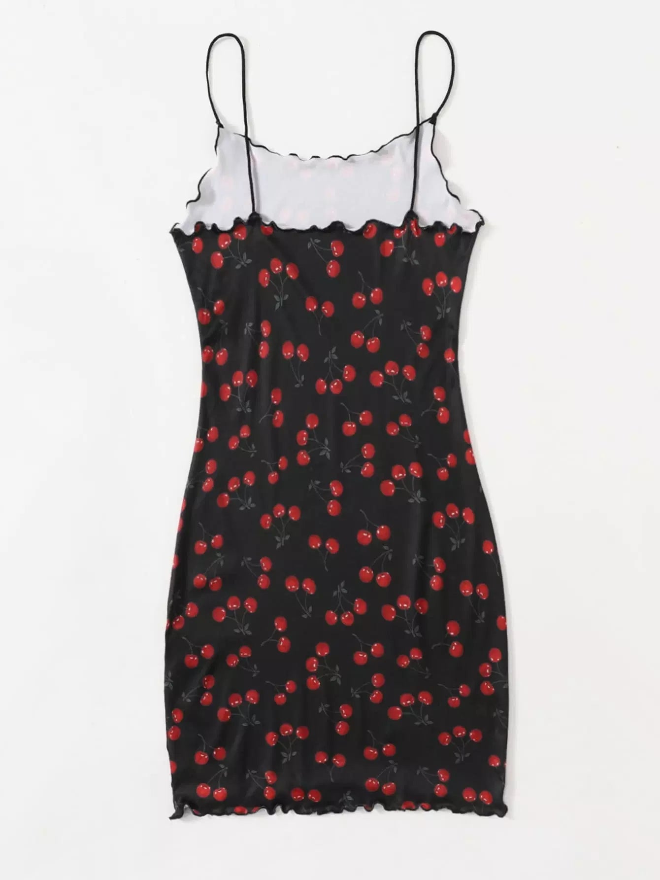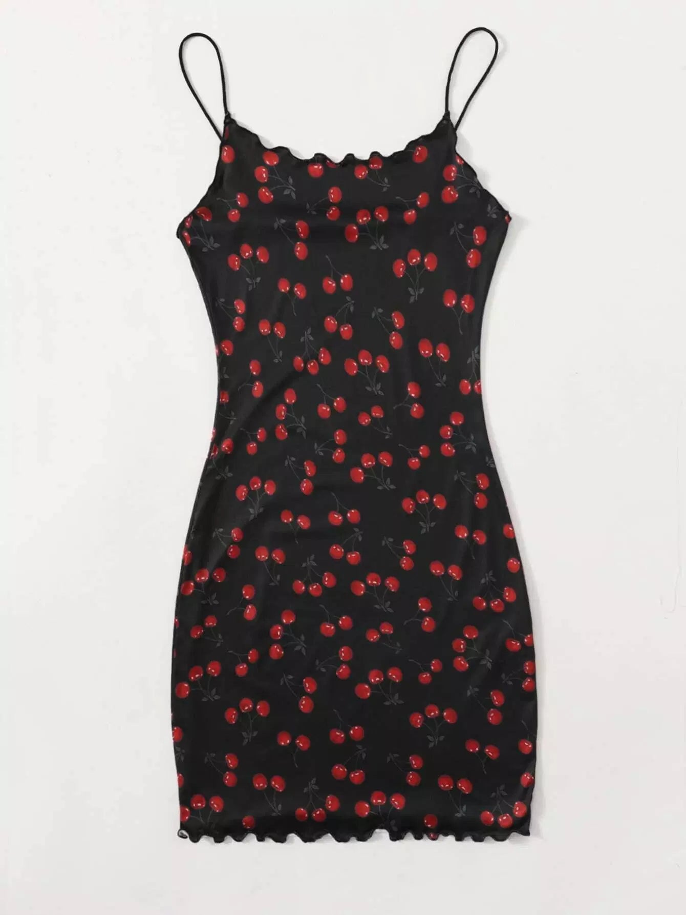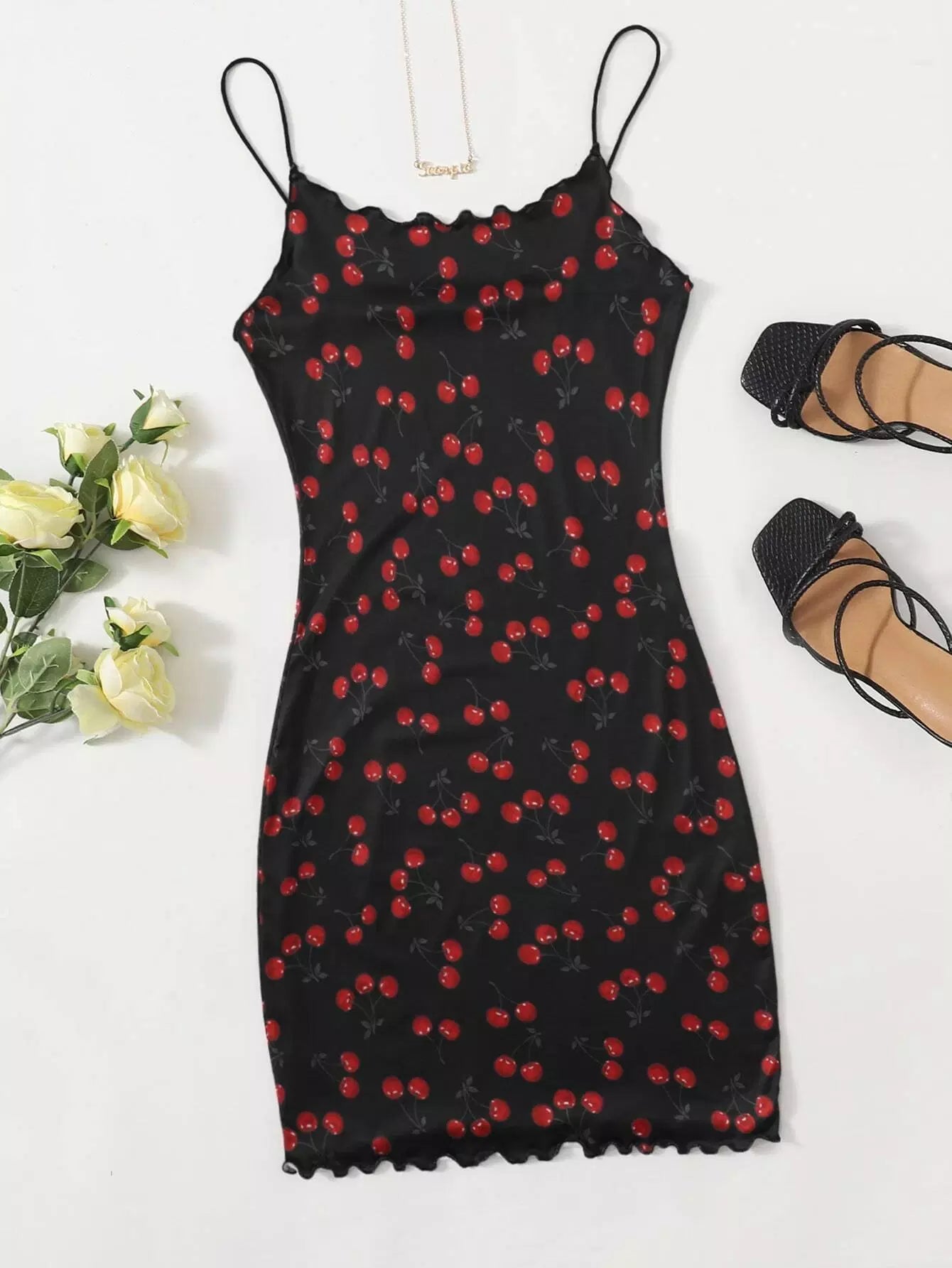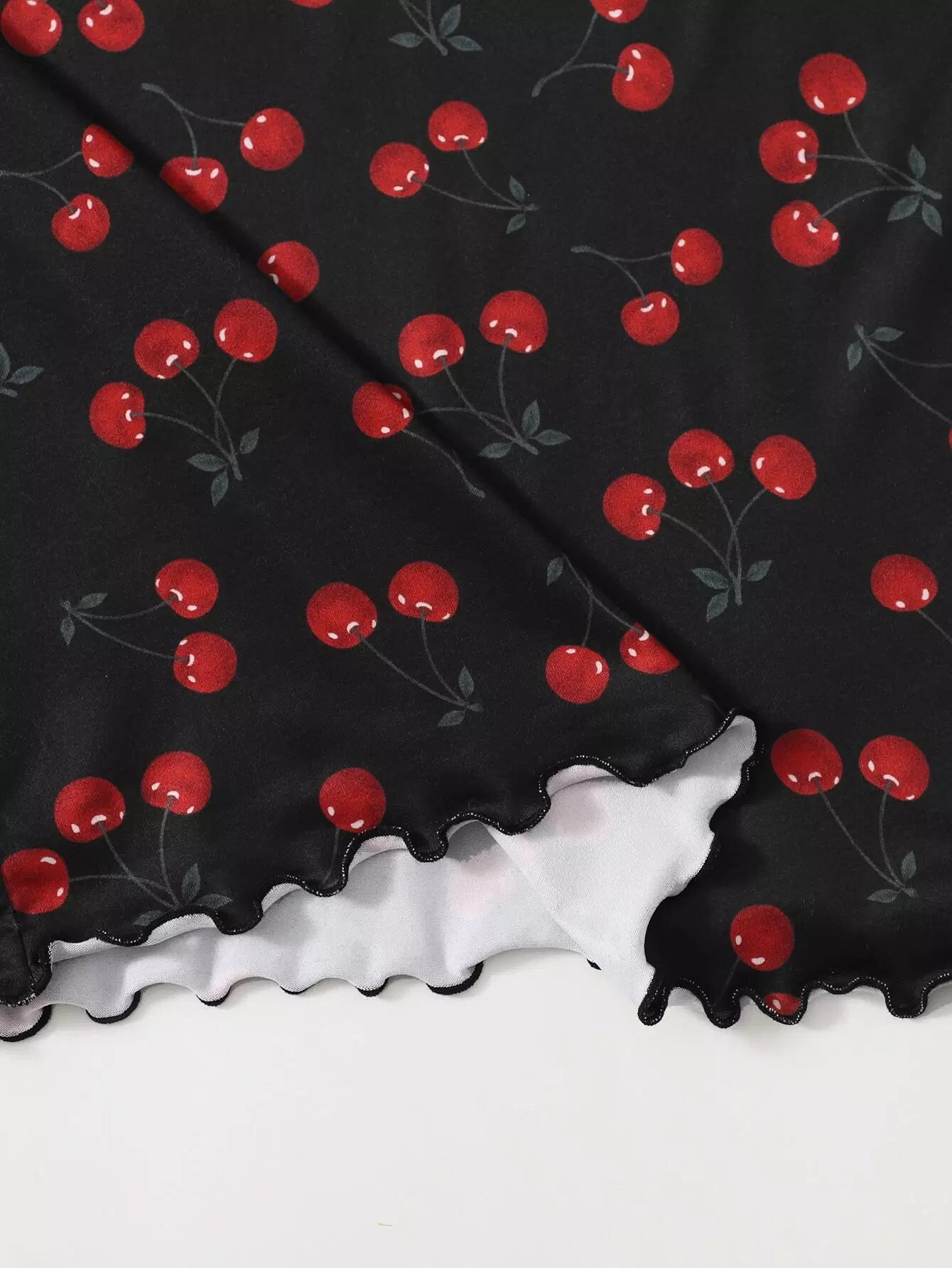 Plus Cherry Print Lettuce Trim Bodycon Dress