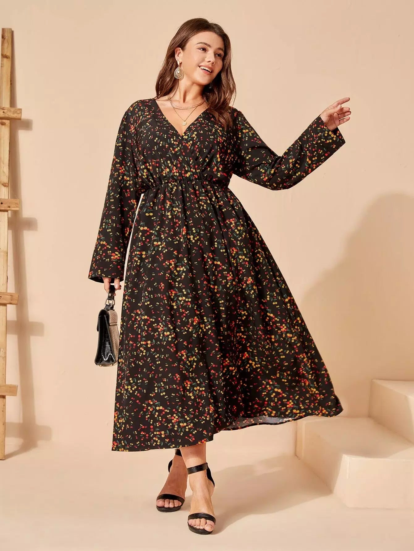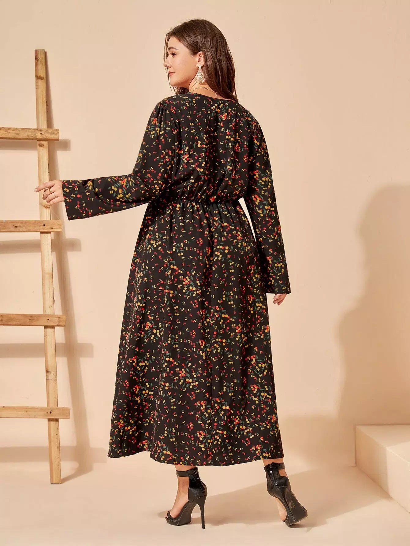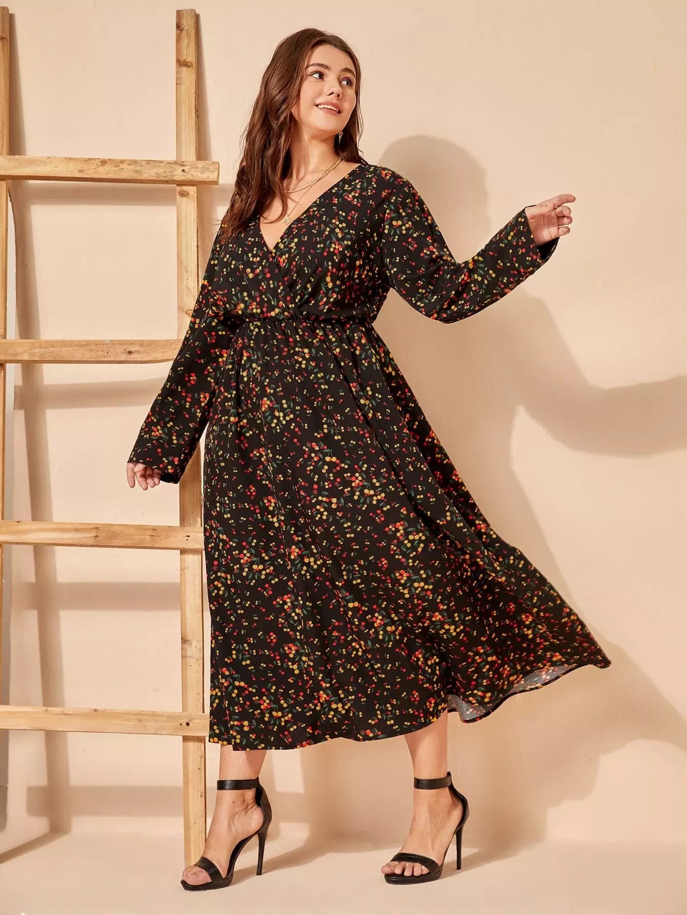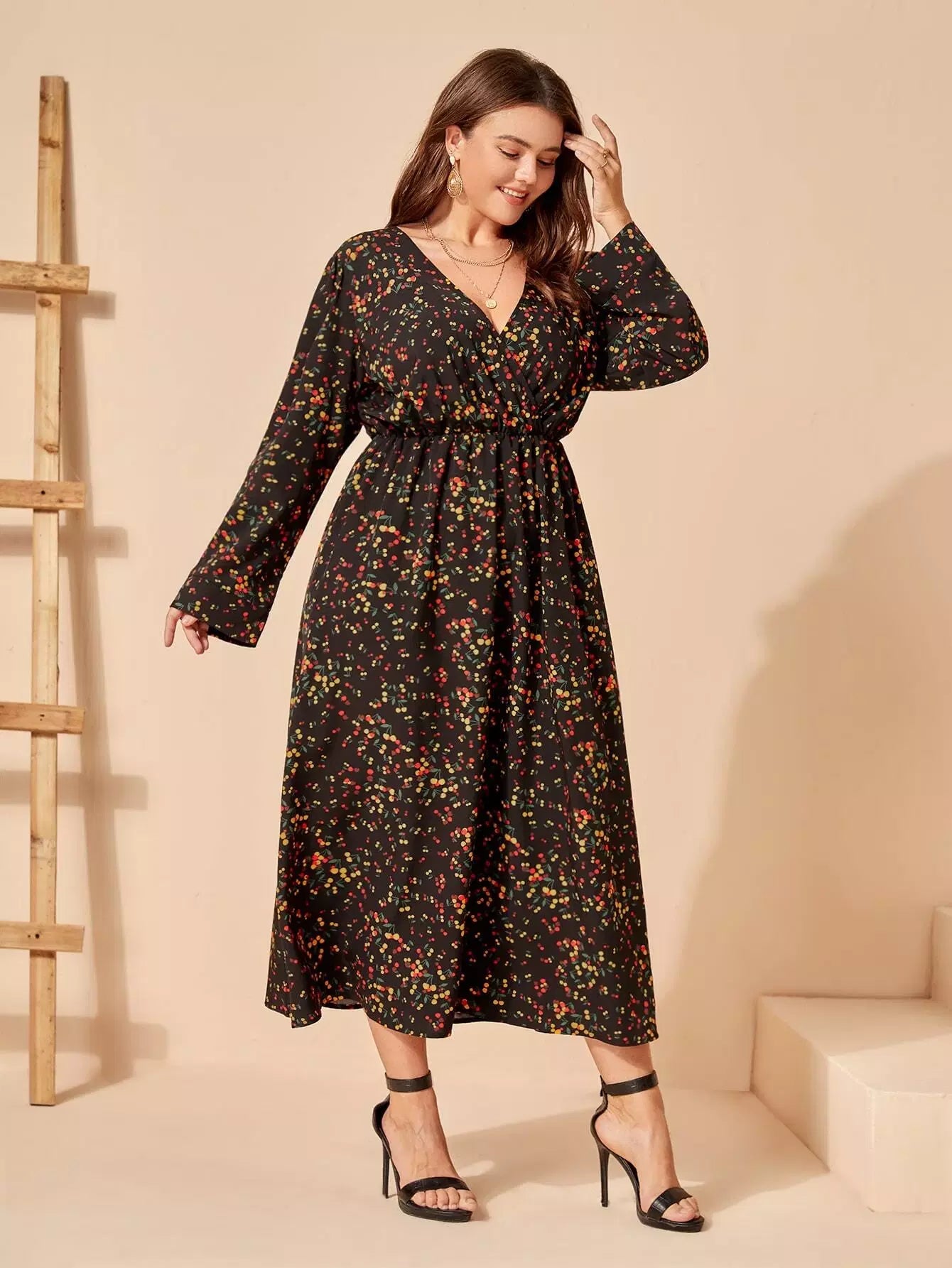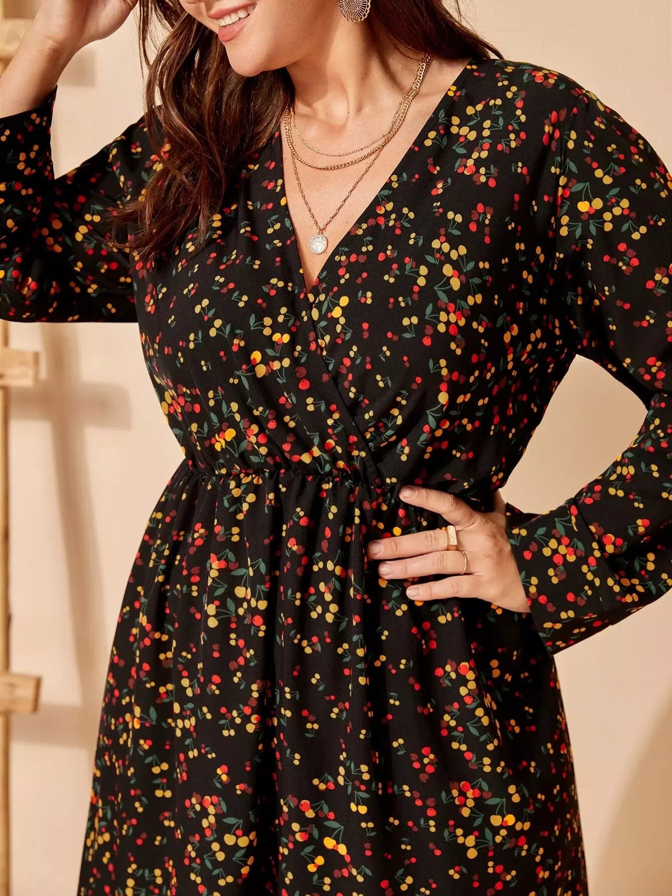 Plus Cherry Print Overlap Collar Dress