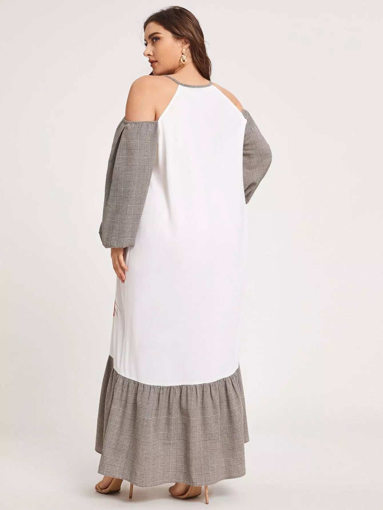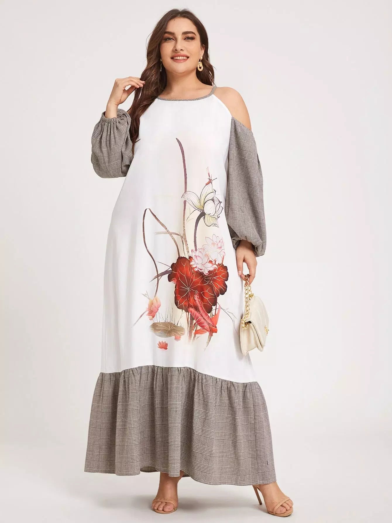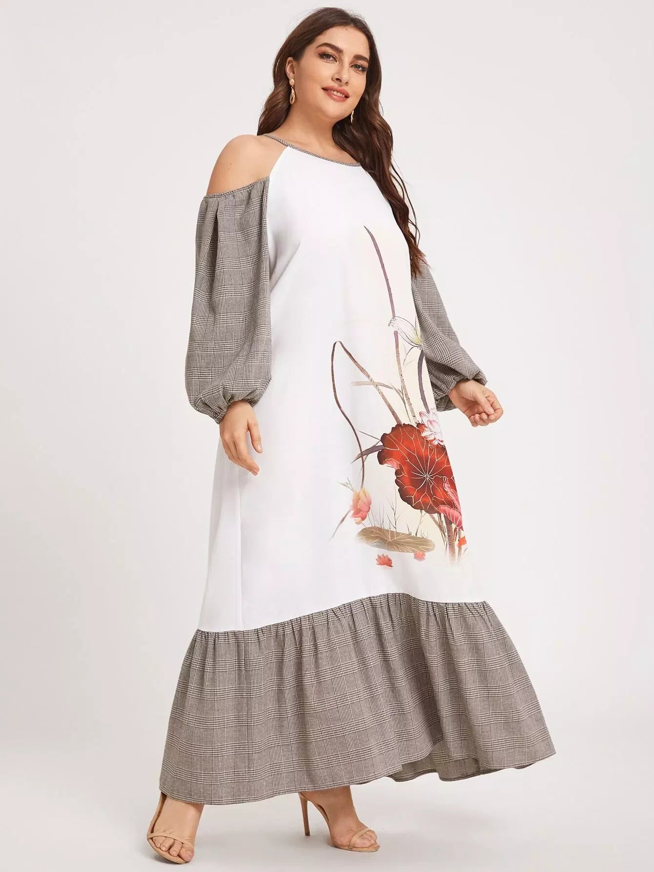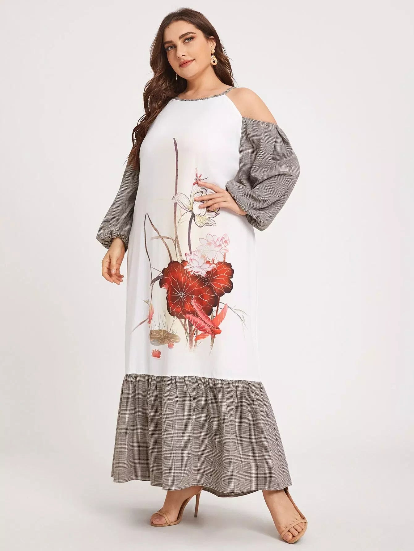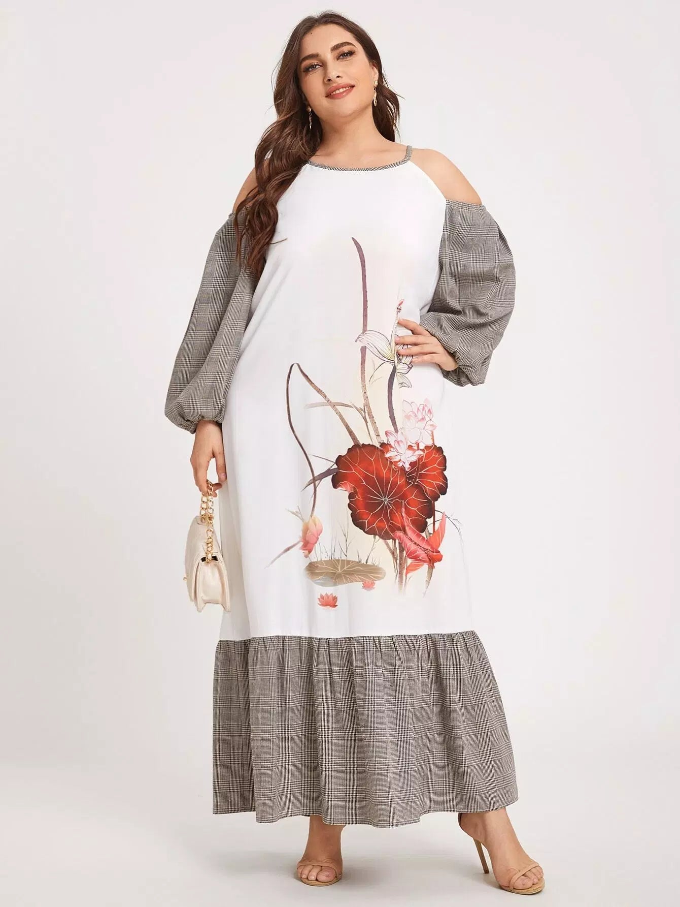 Plus Cold Shoulder Lantern Sleeve Plaid Panel Floral Print Dress