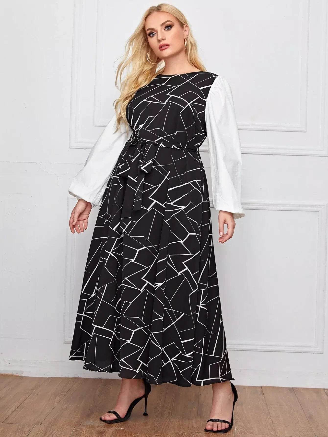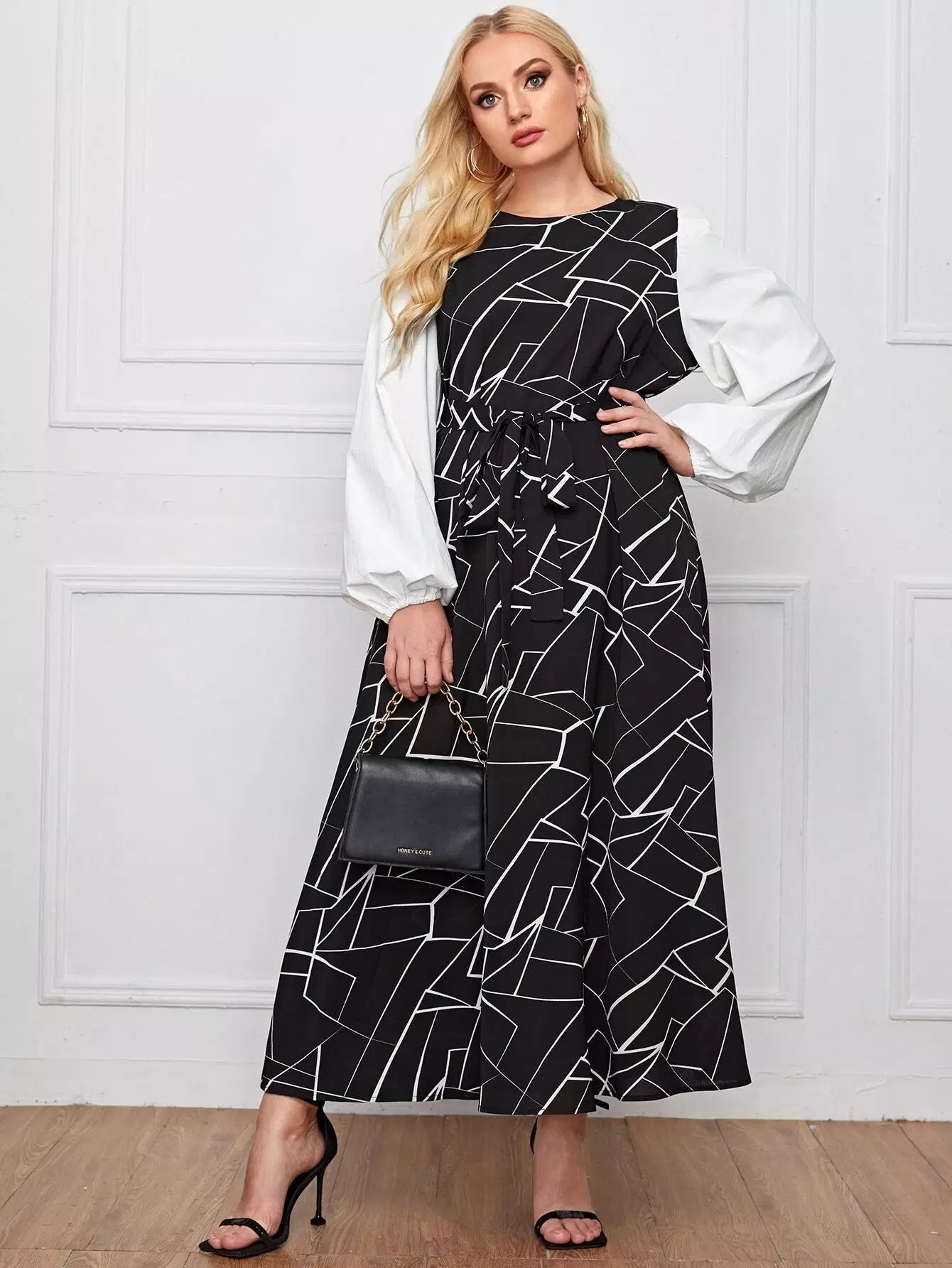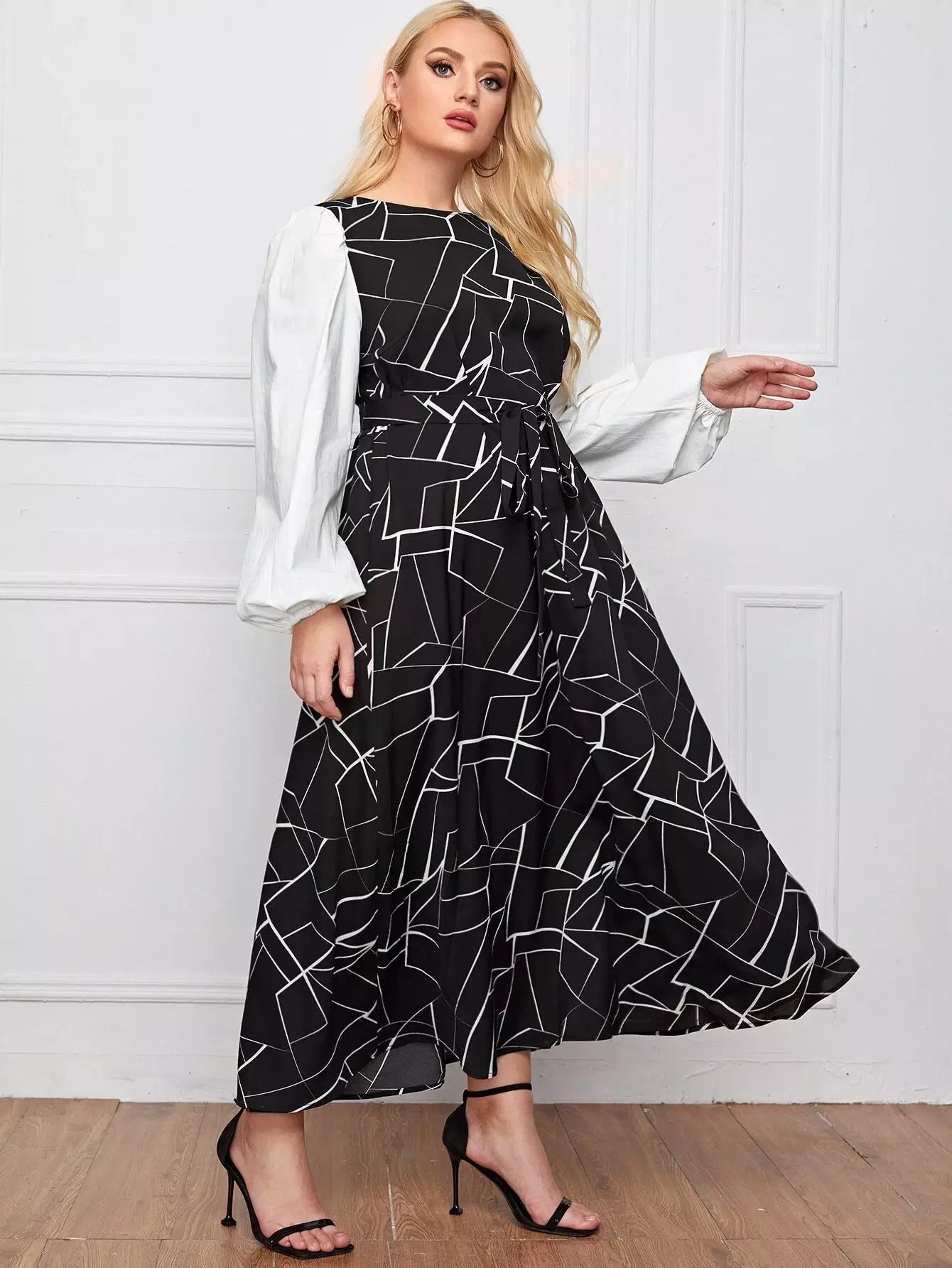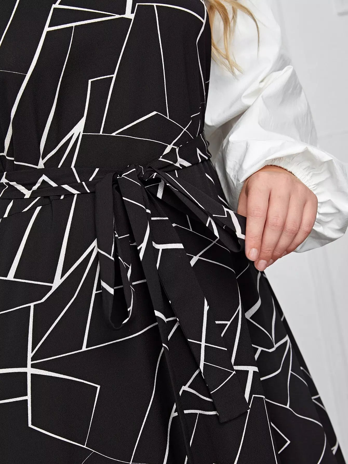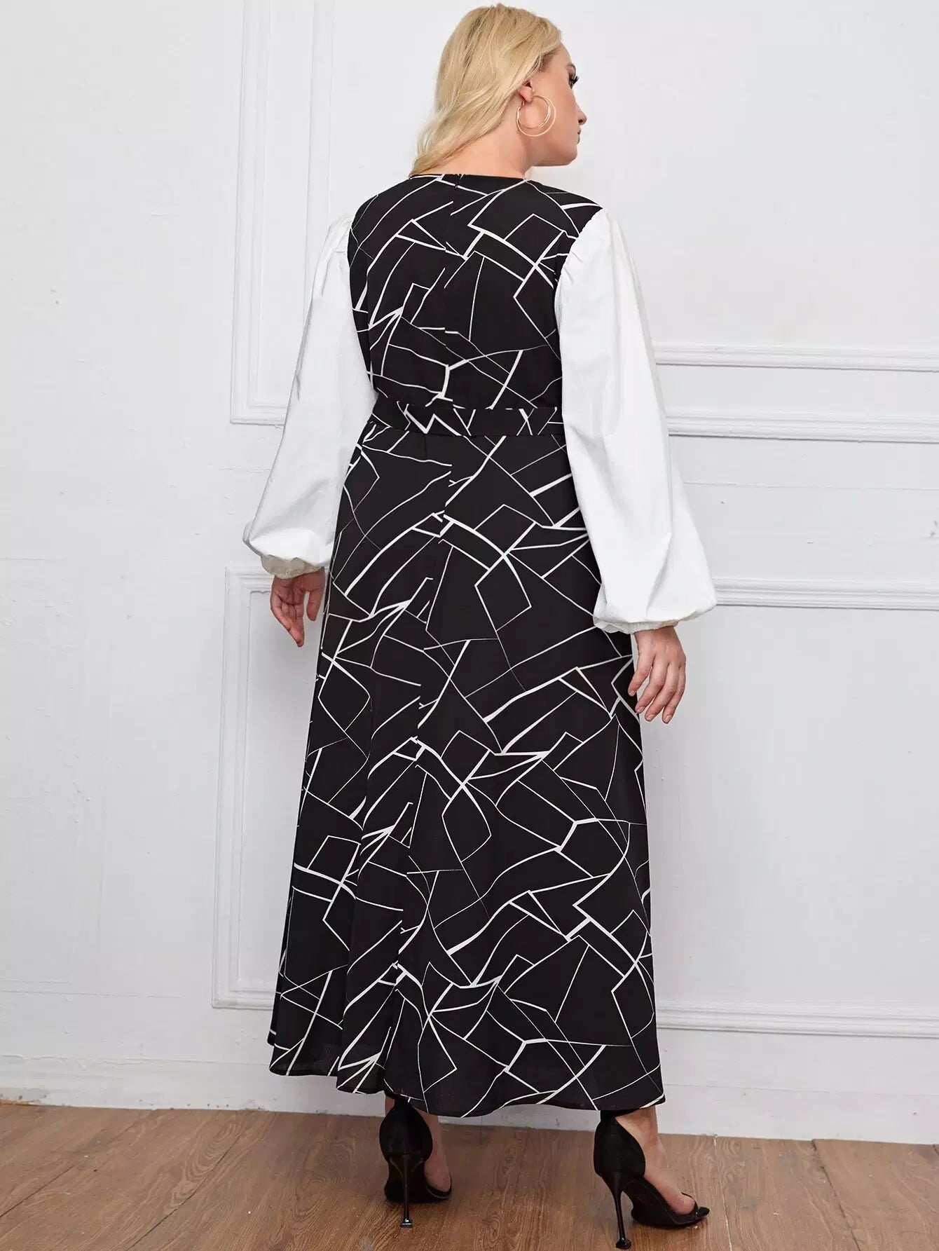 Plus Contrast Lantern Sleeve Geo Print Dress Without Belt