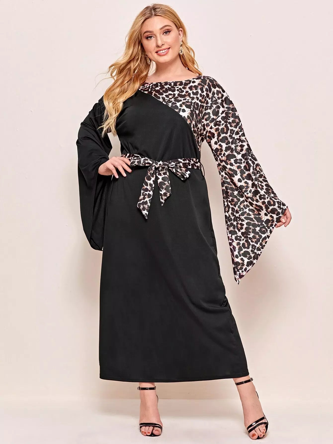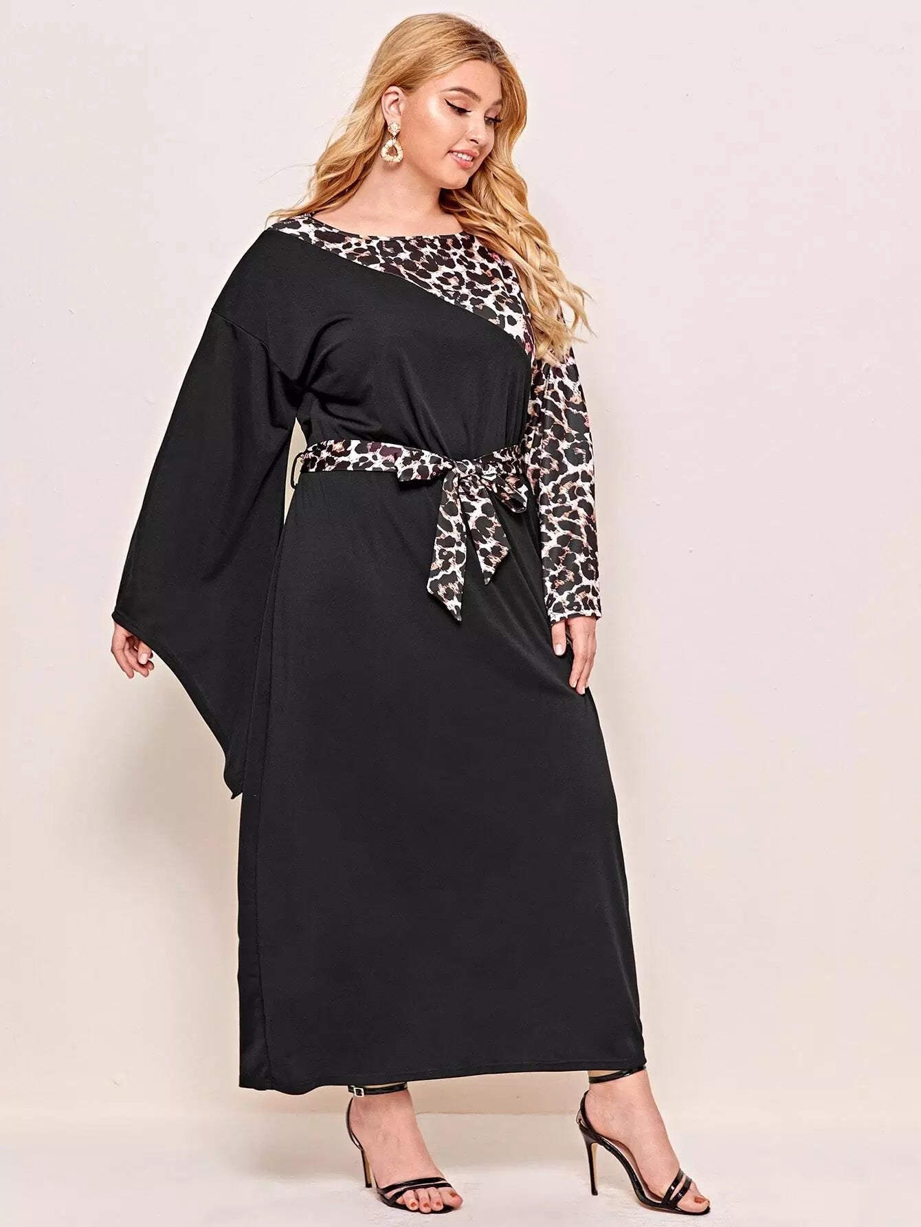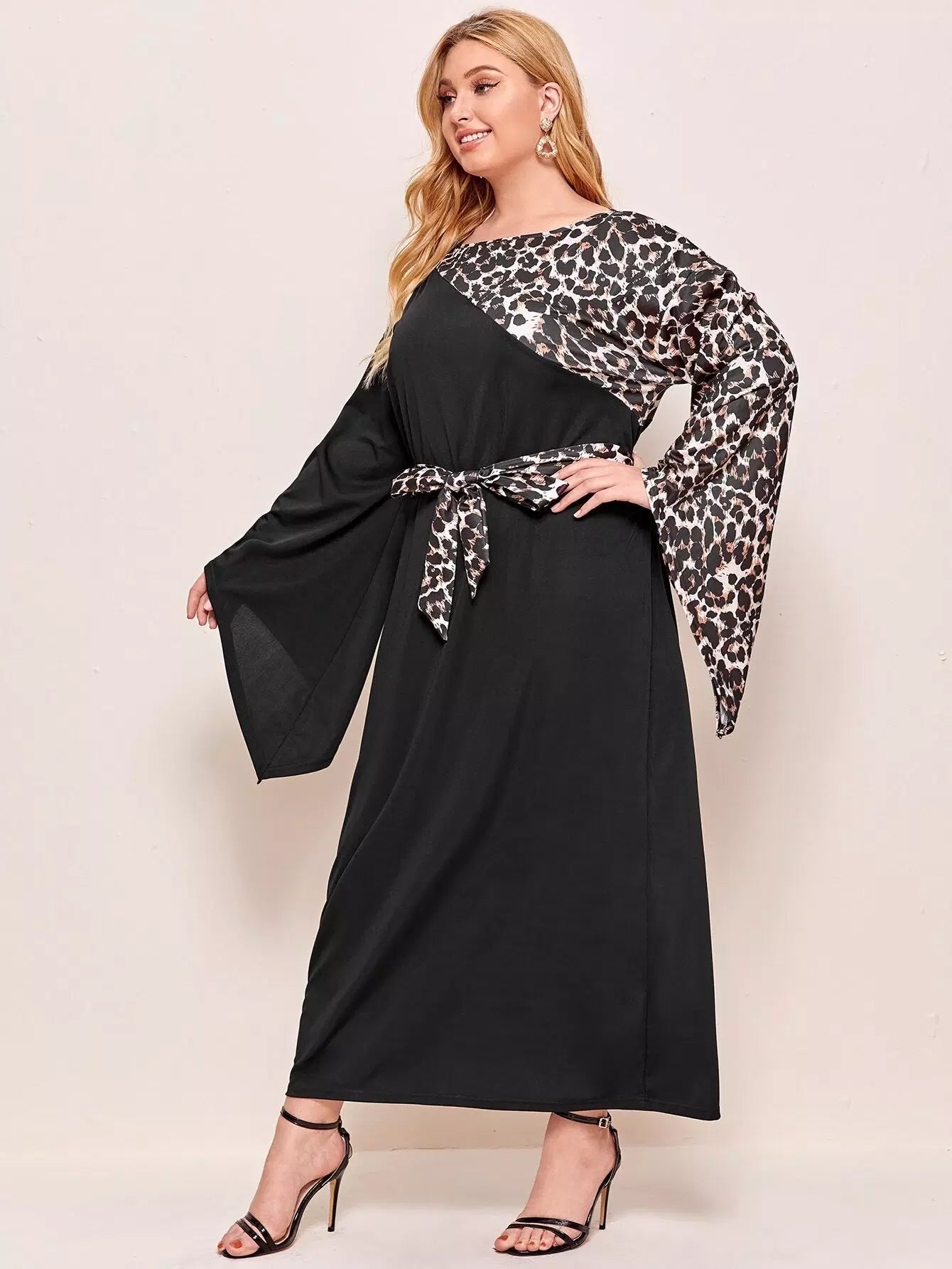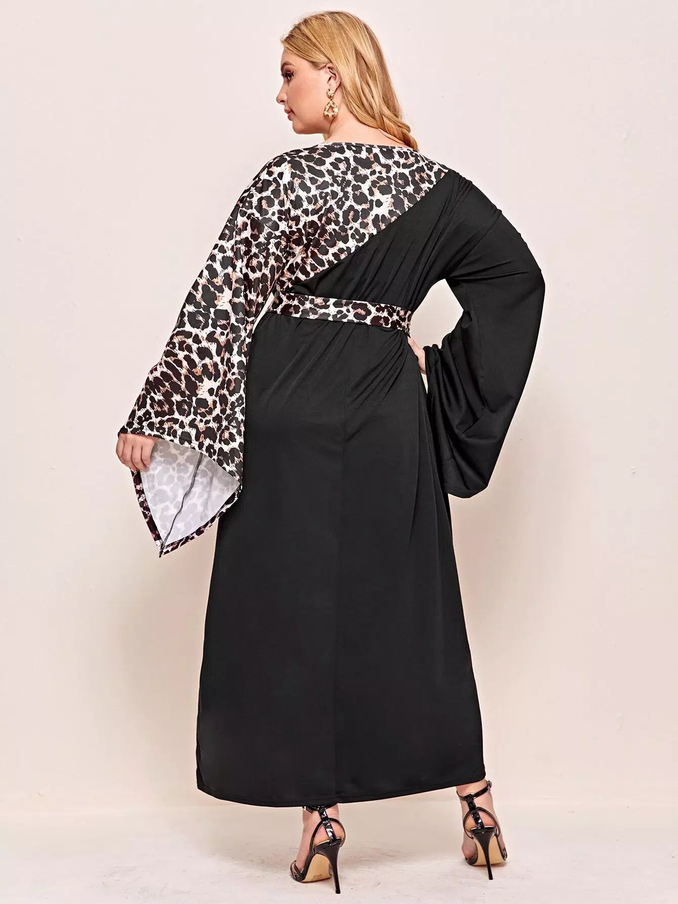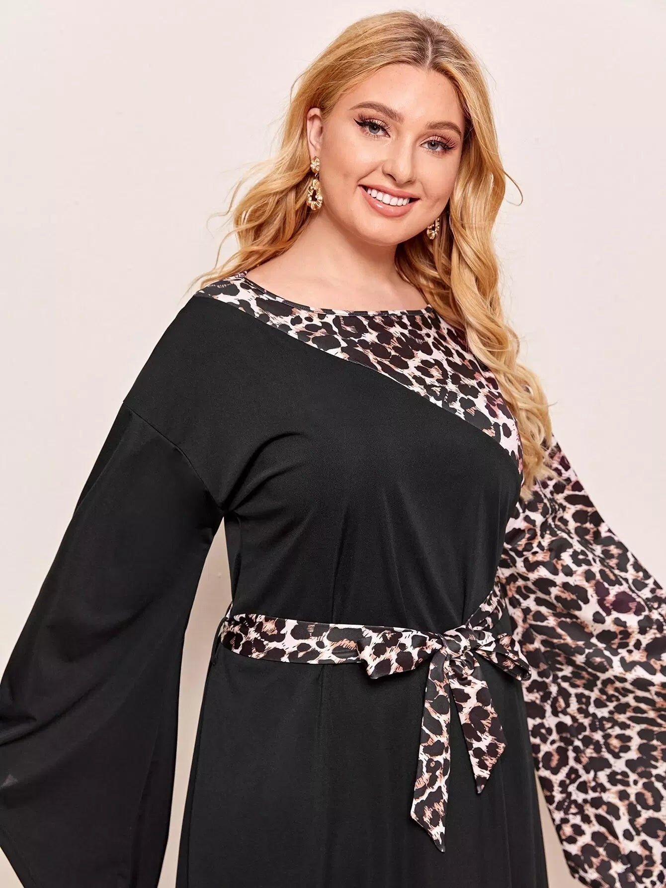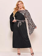 Plus Contrast Leopard Print Flounce Sleeve Dress Without Belt