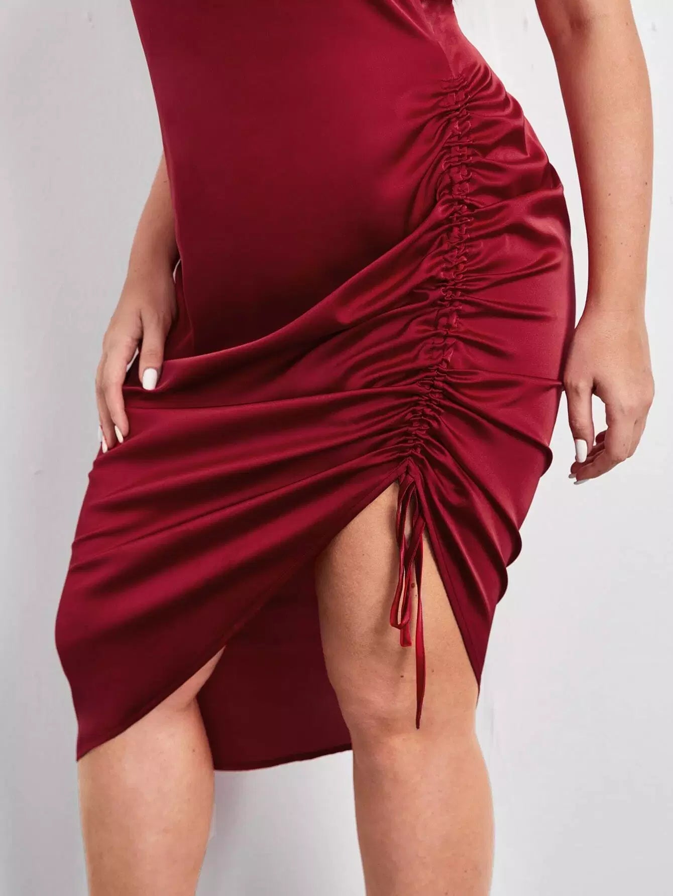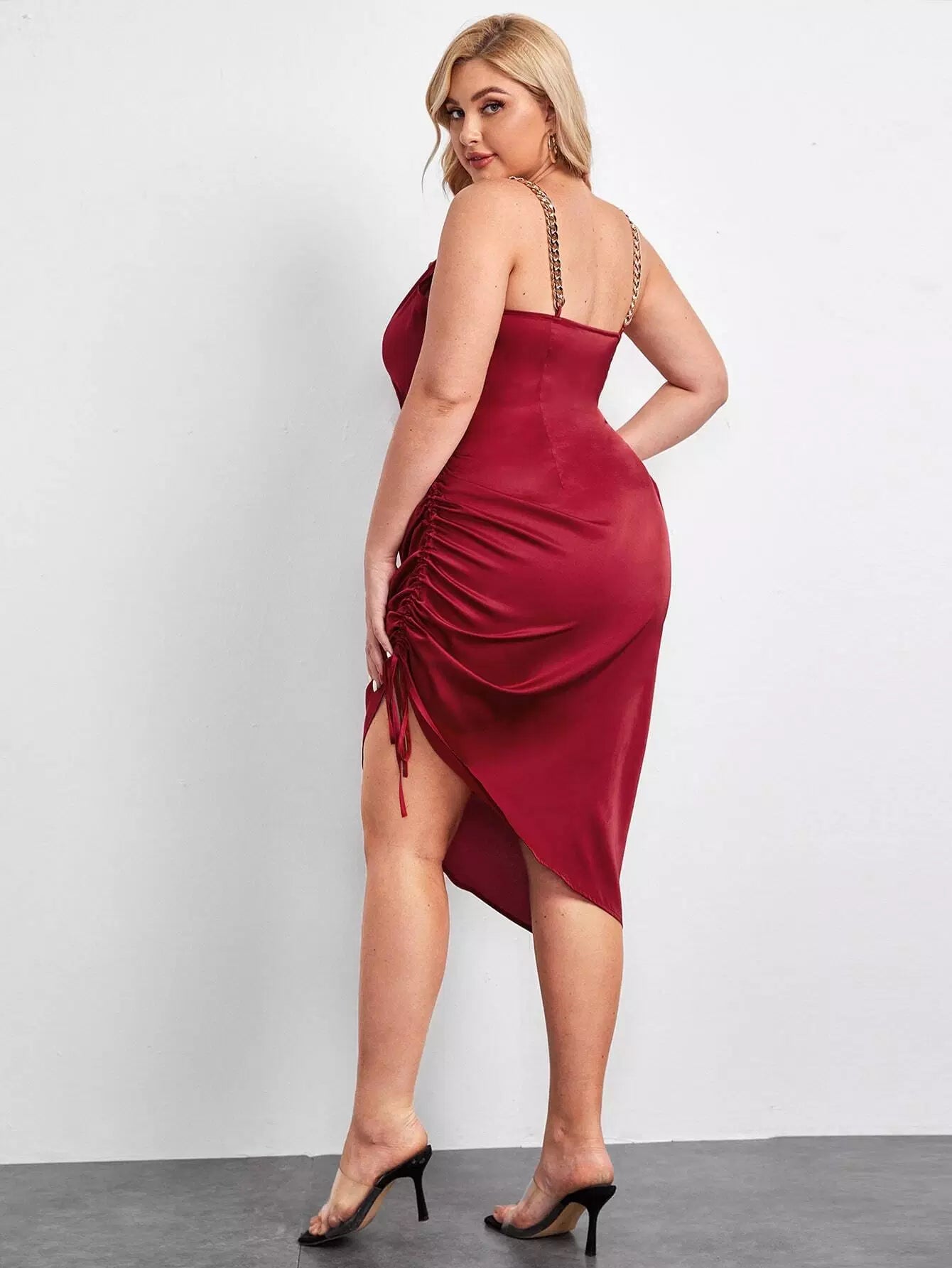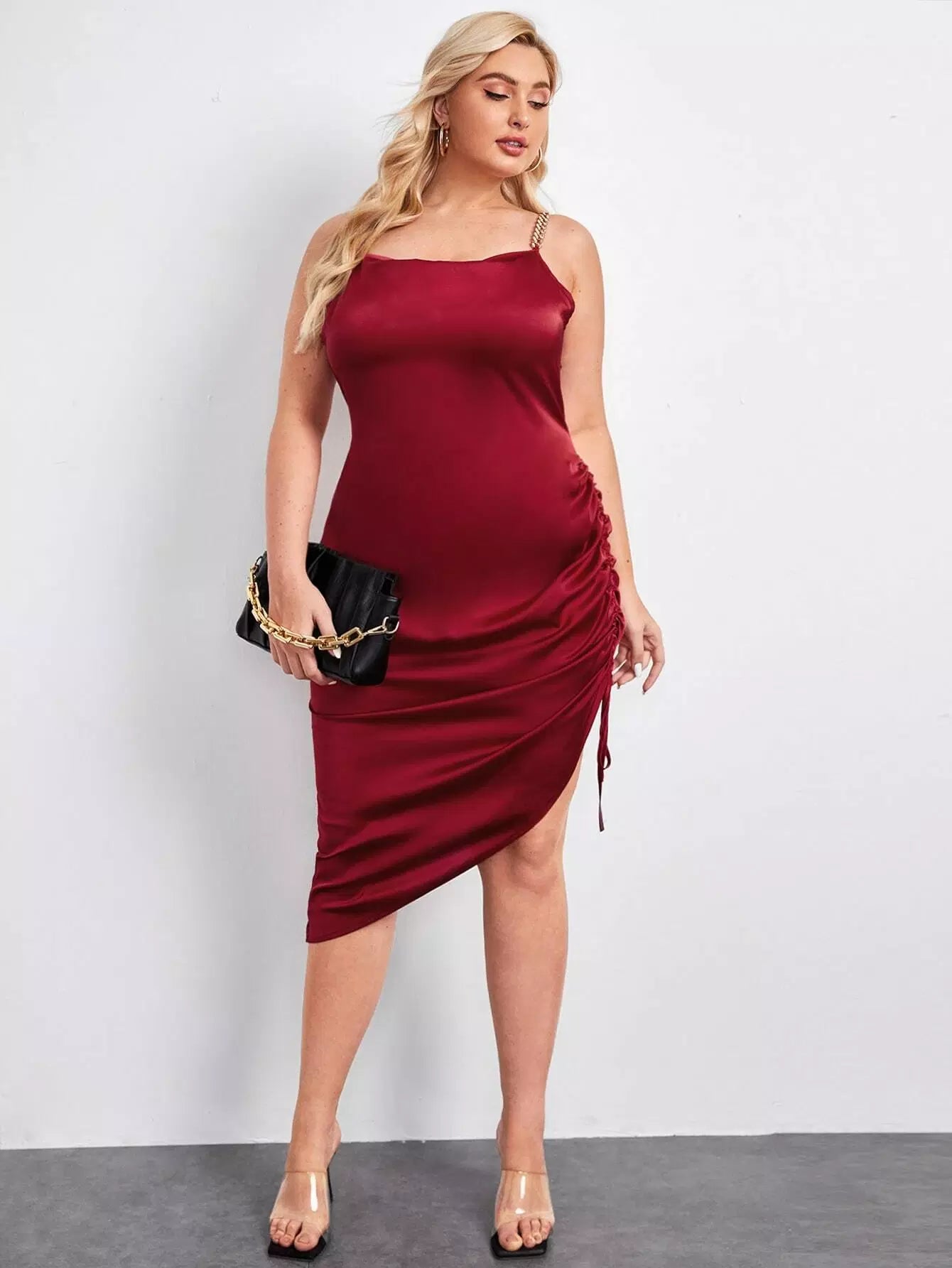 Plus Cowl Neck Drawstring Ruched Side Chain Straps Satin Dress