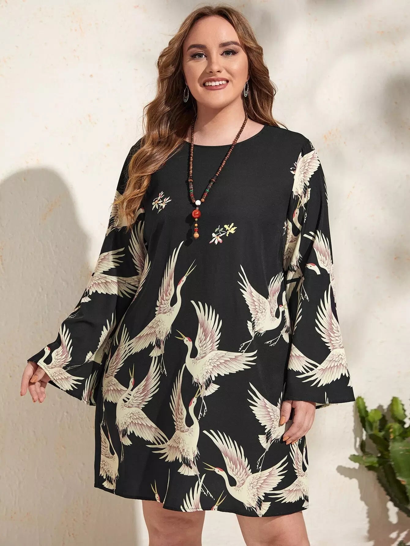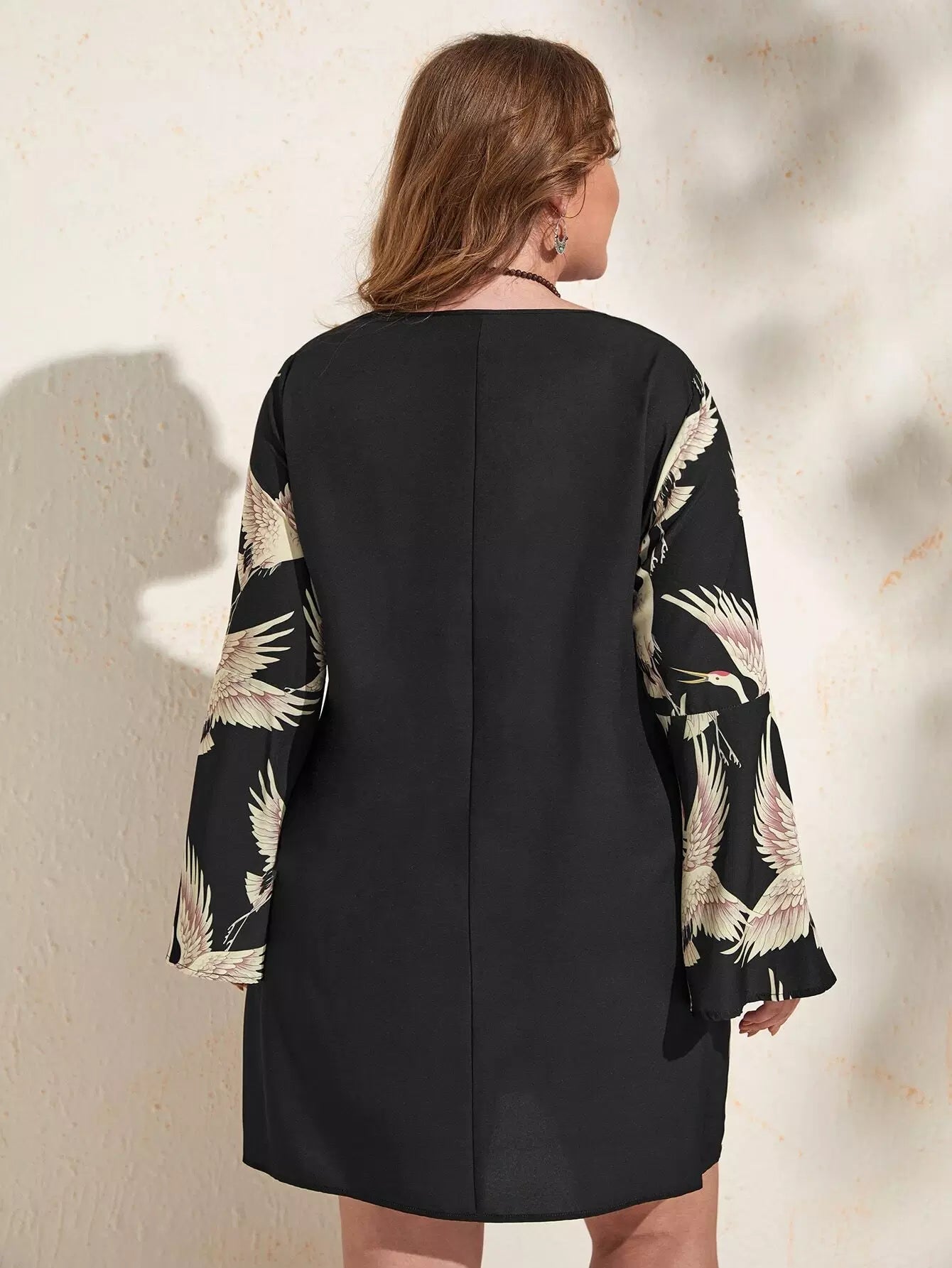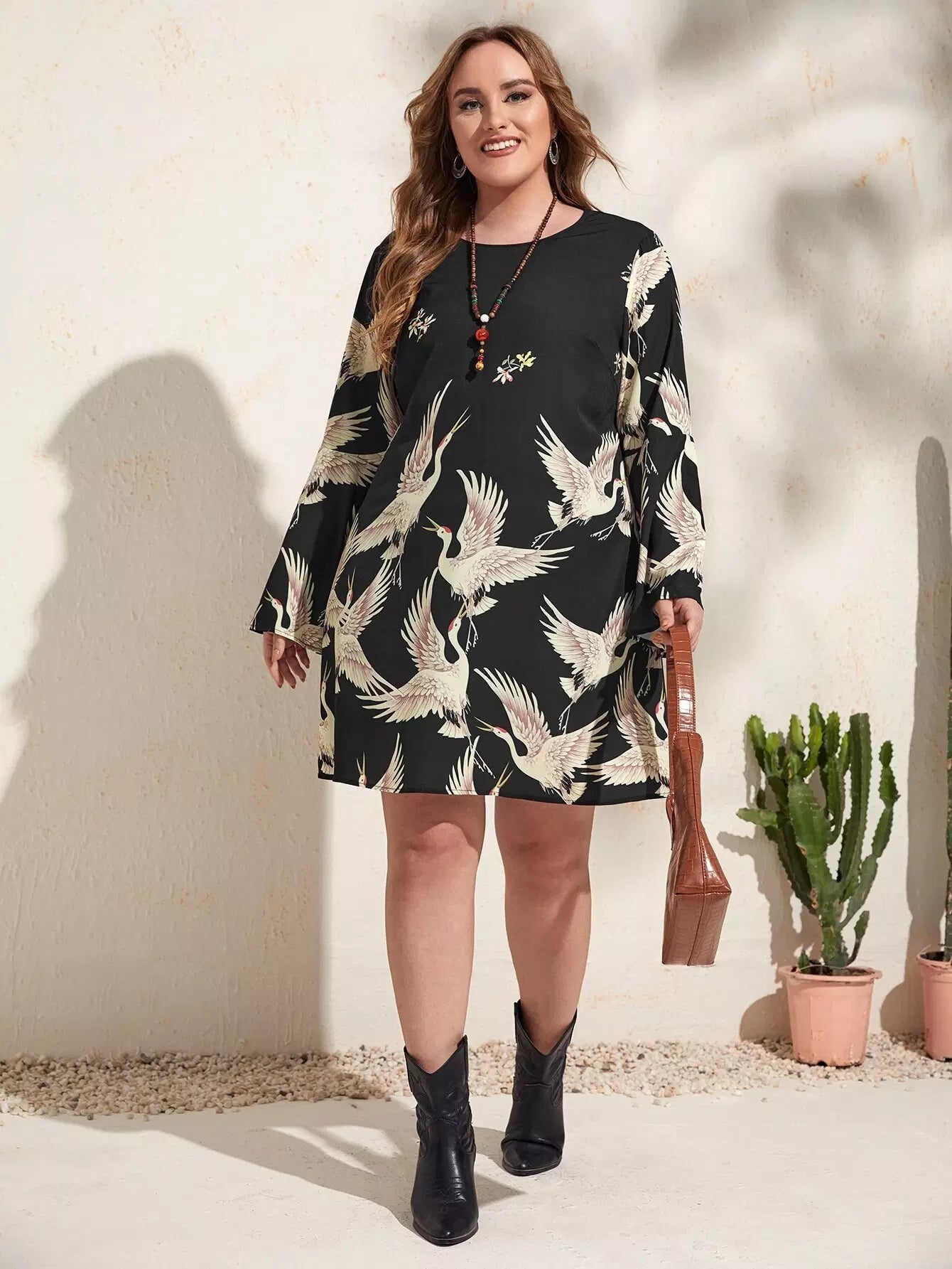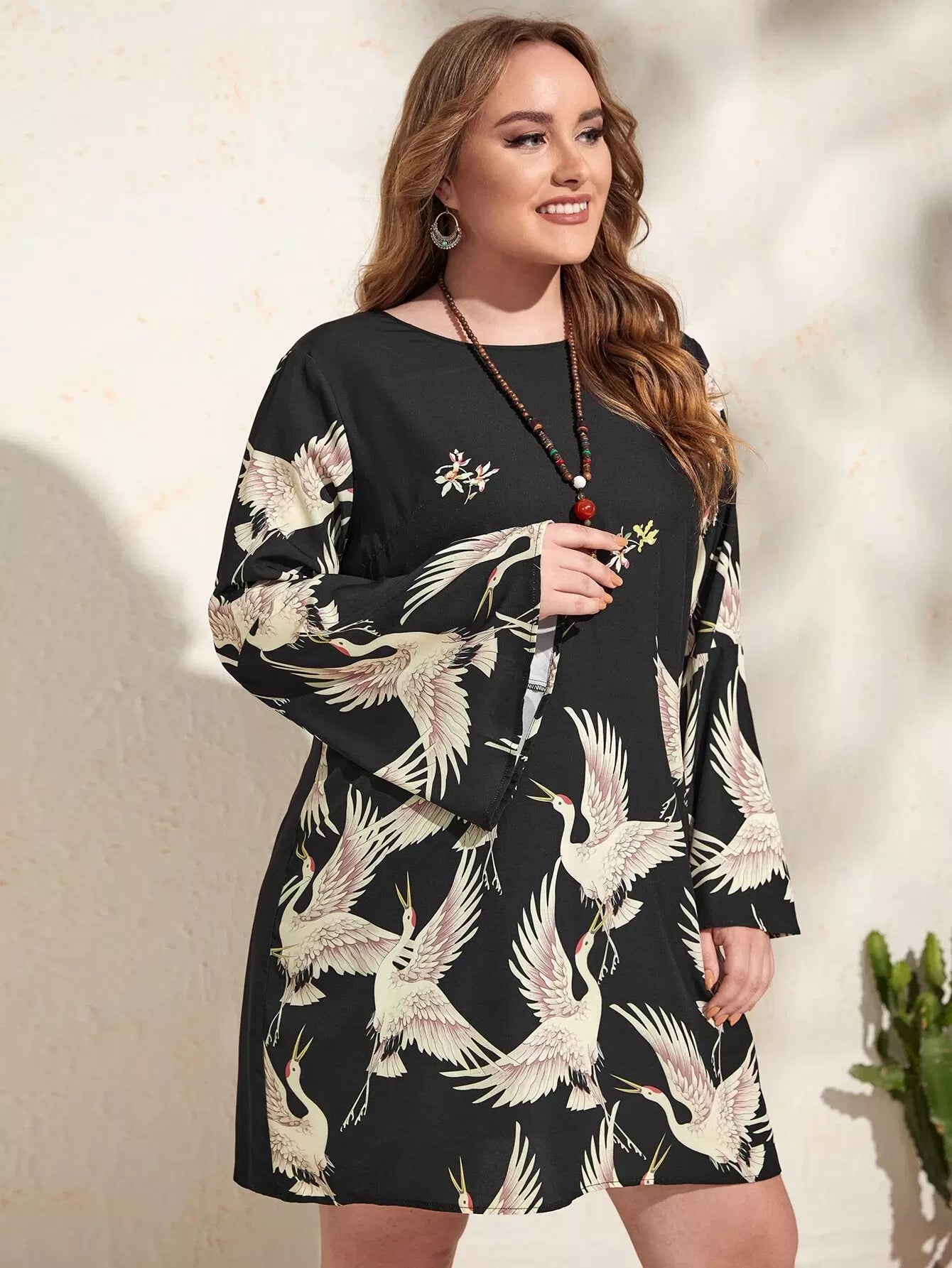 Plus Crane & Floral Print Trumpet Sleeve Dress