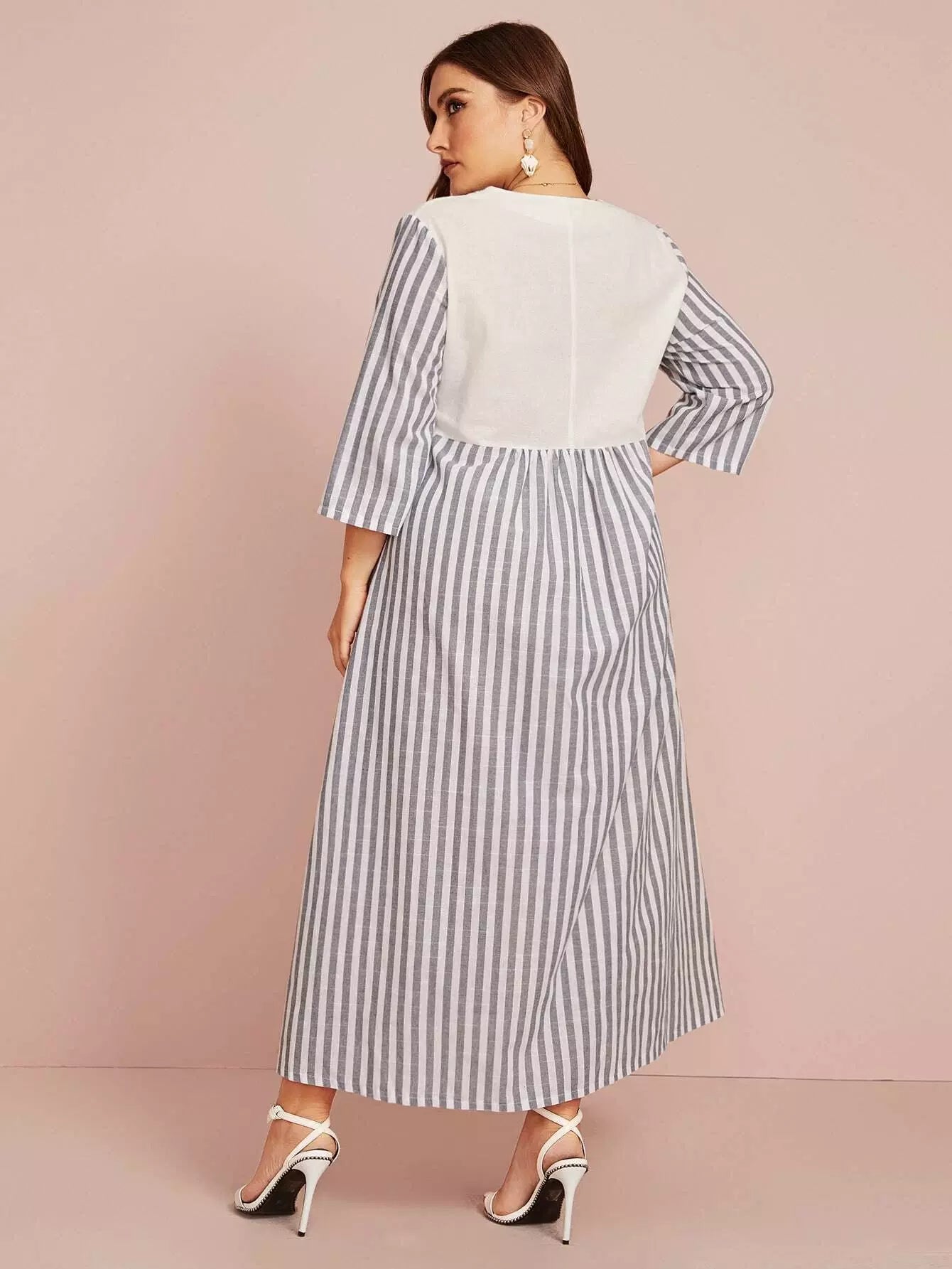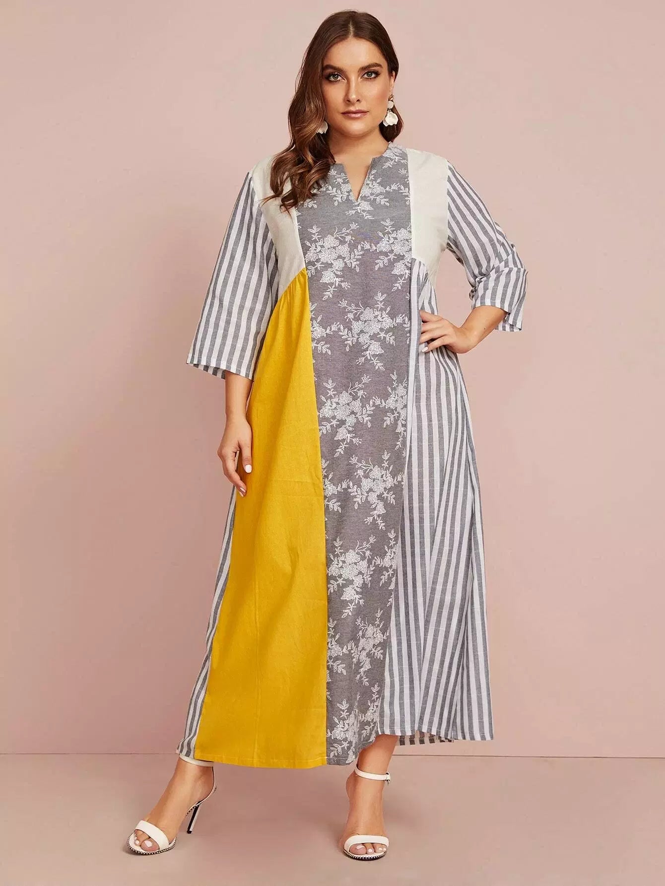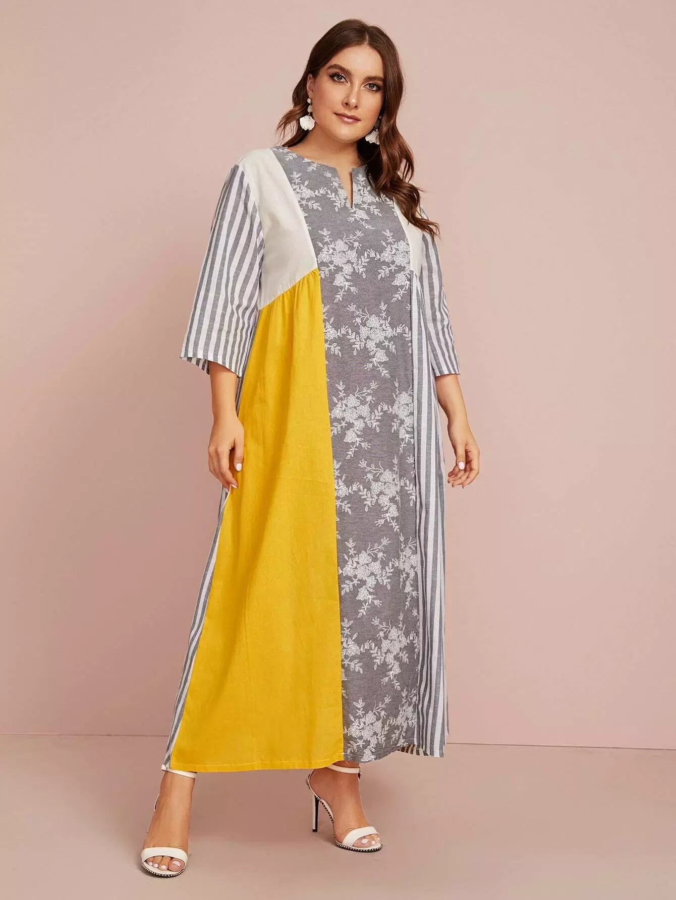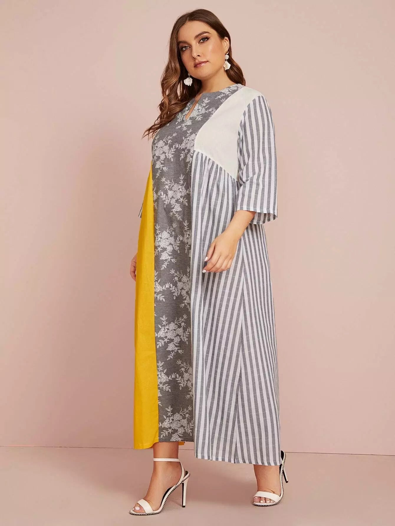Plus Cut And Sew Plants & Stripe Print Maxi Dress