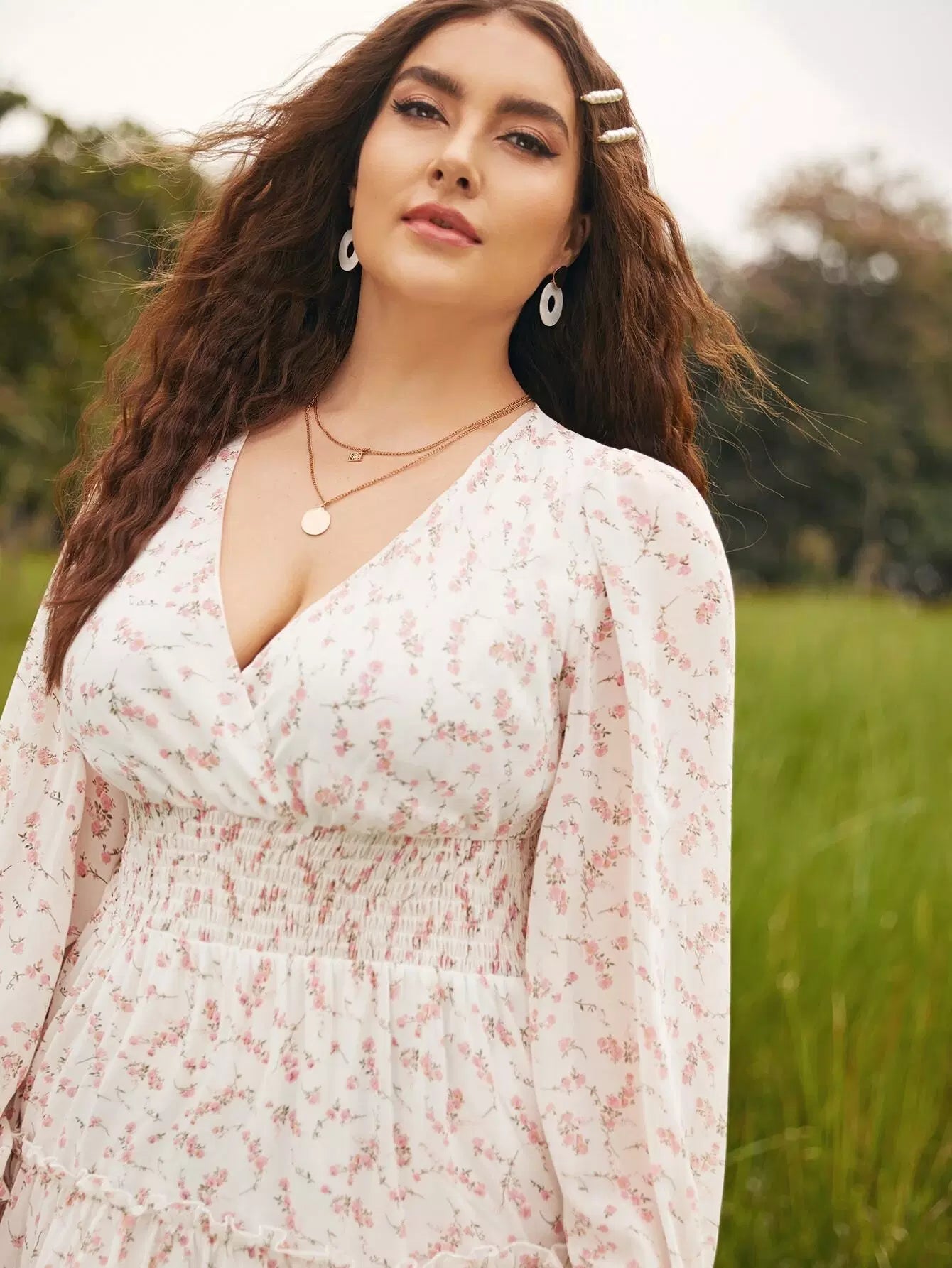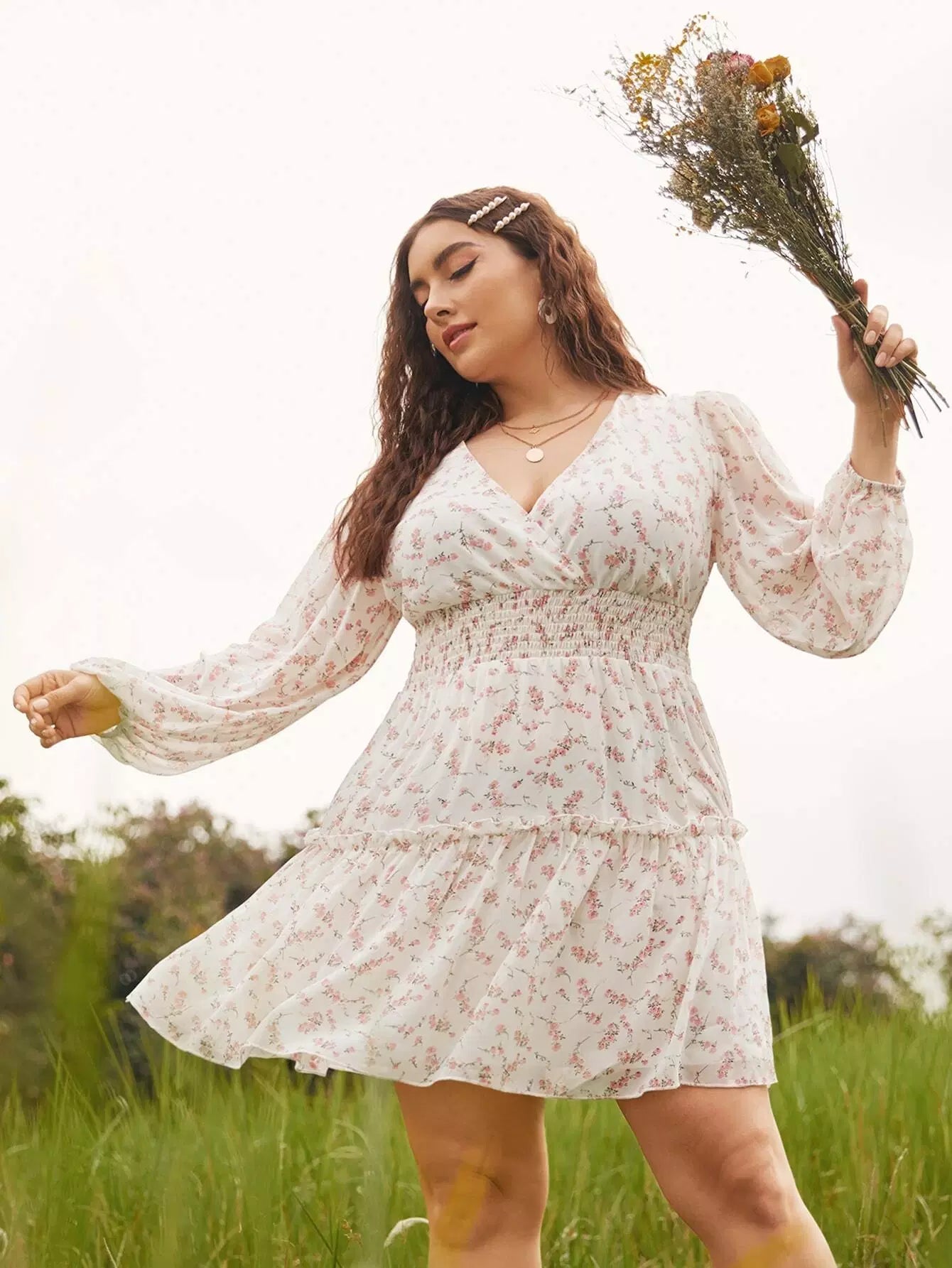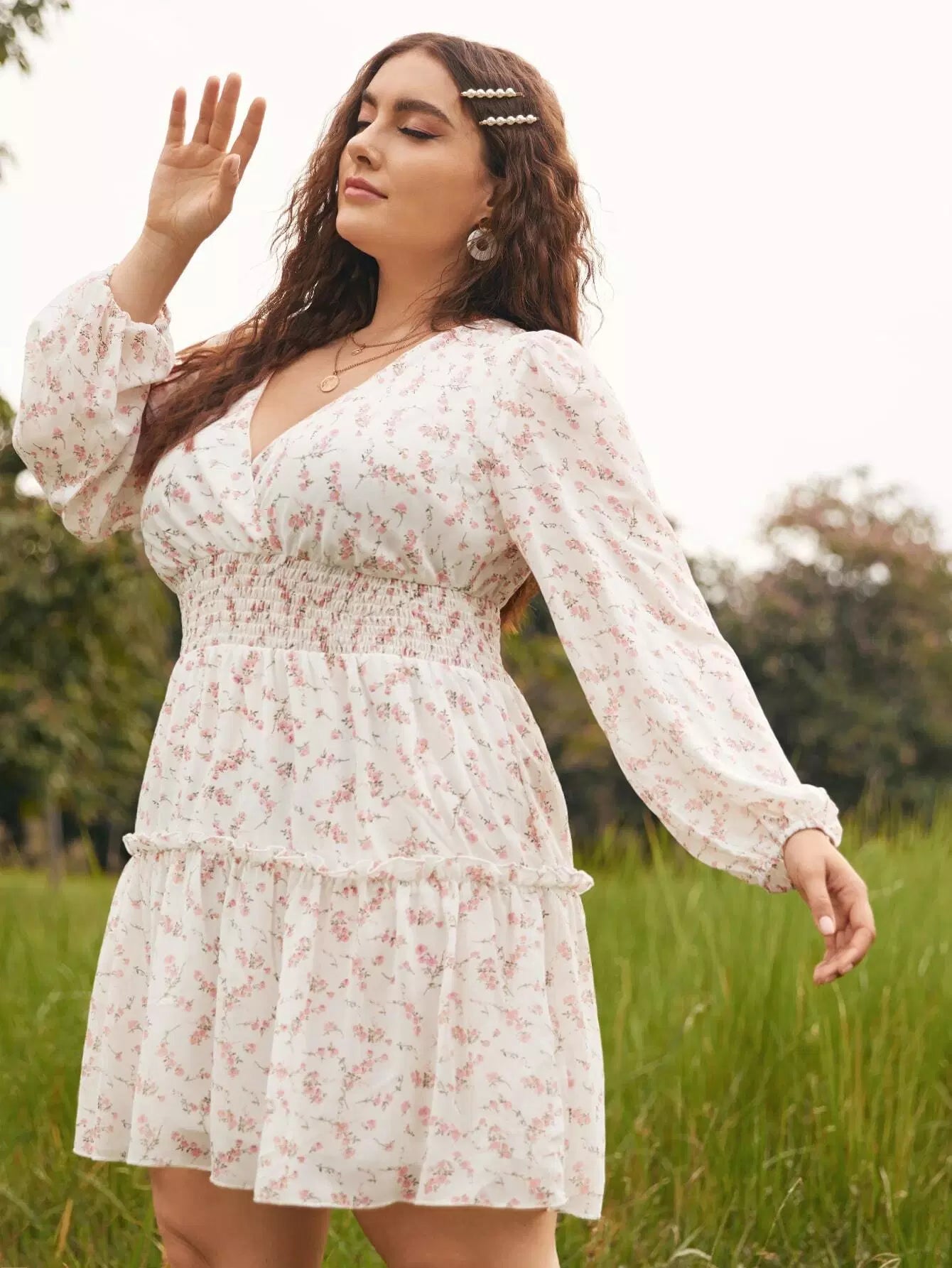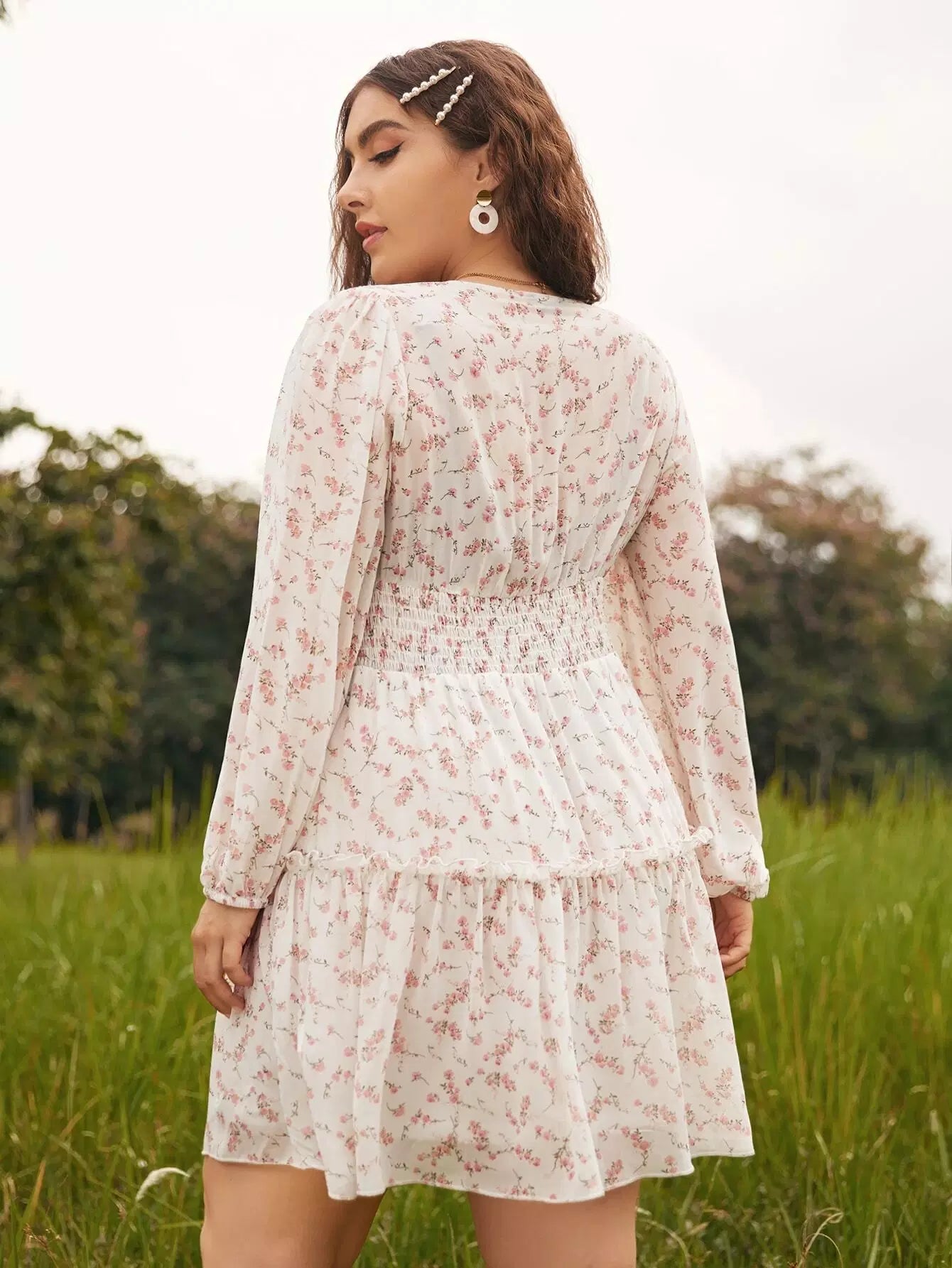Women - Plus Ditsy Floral Frill Trim Shirred Waist Dress