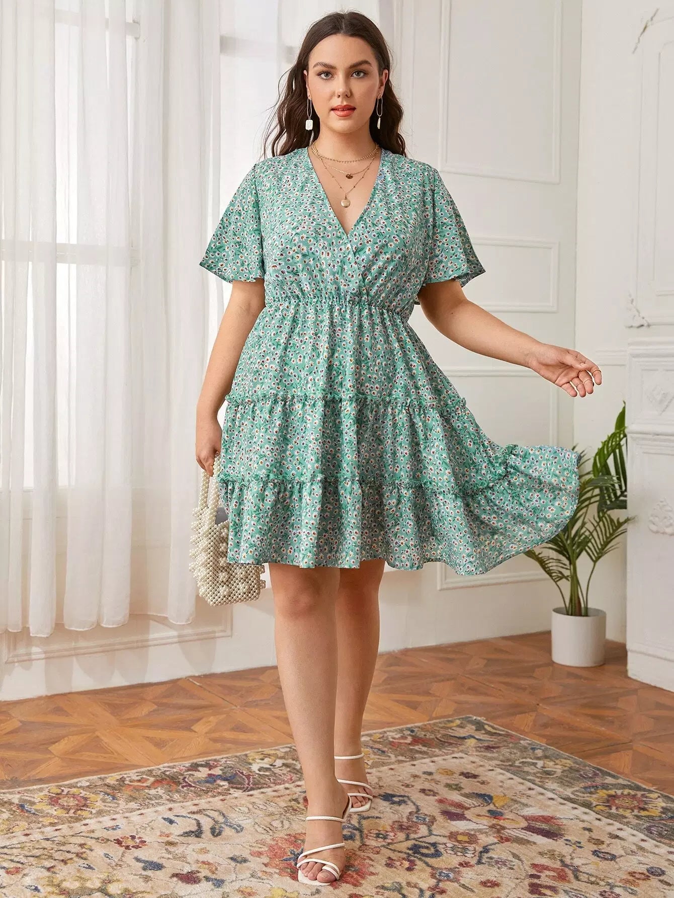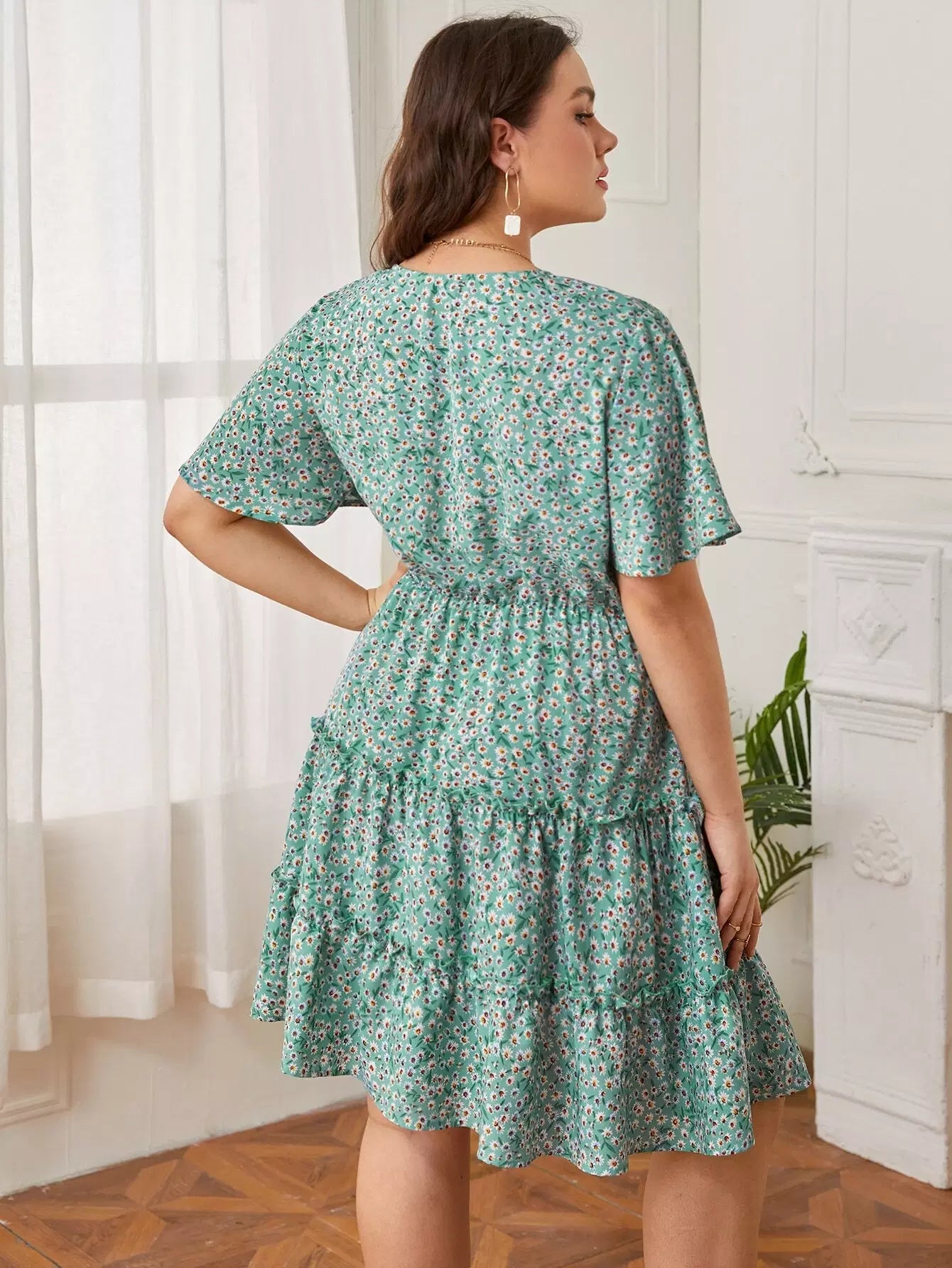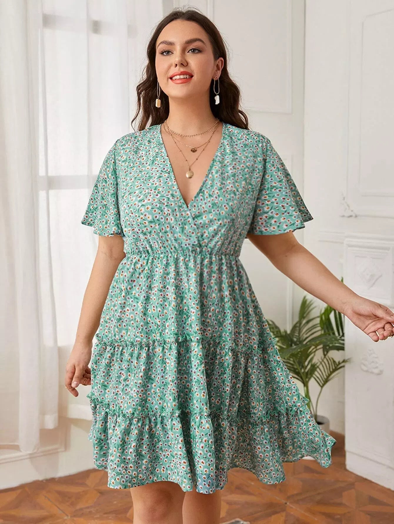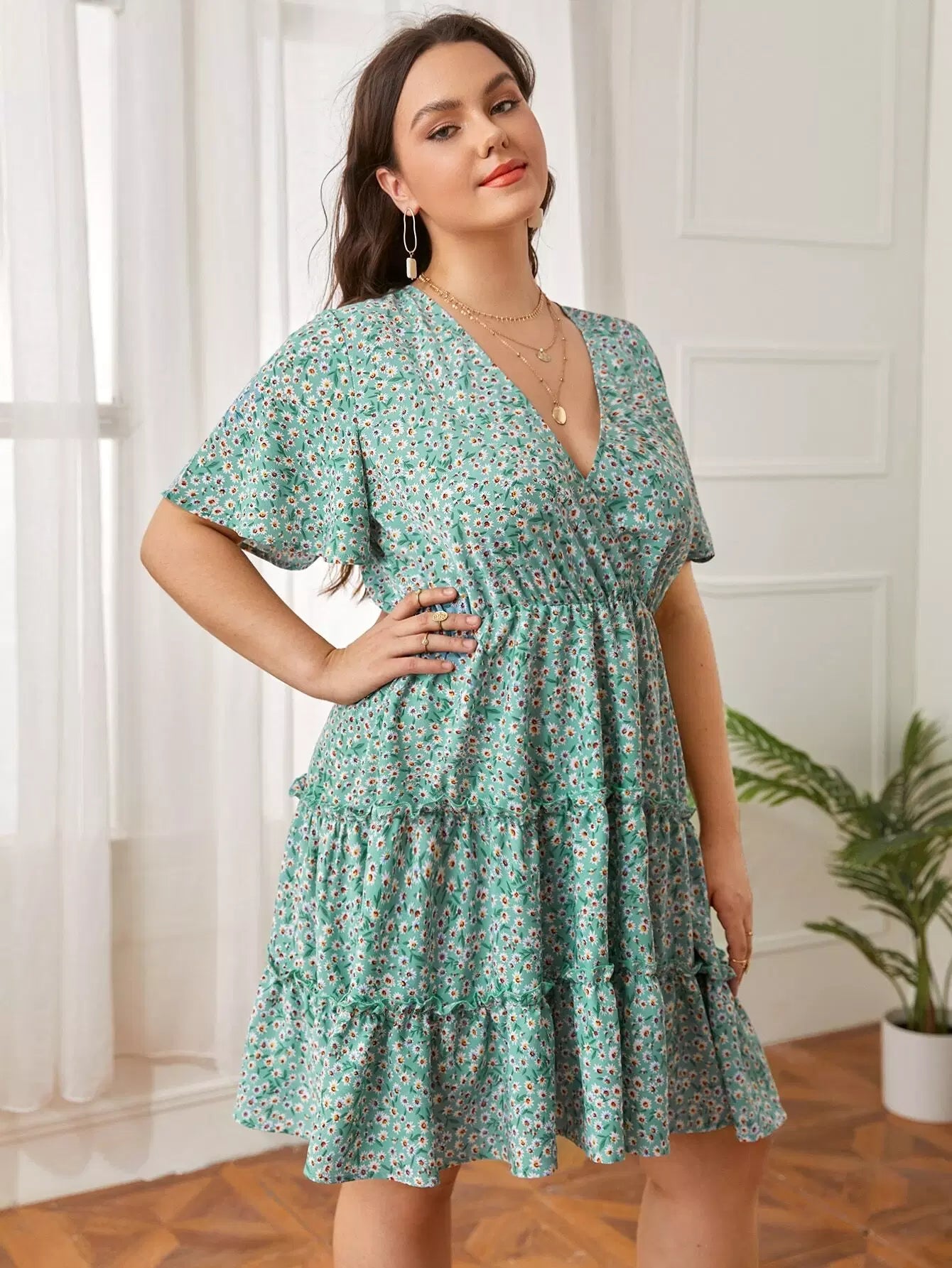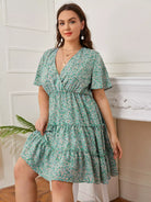 Plus Ditsy Floral Print Surplice Front Layered Dress