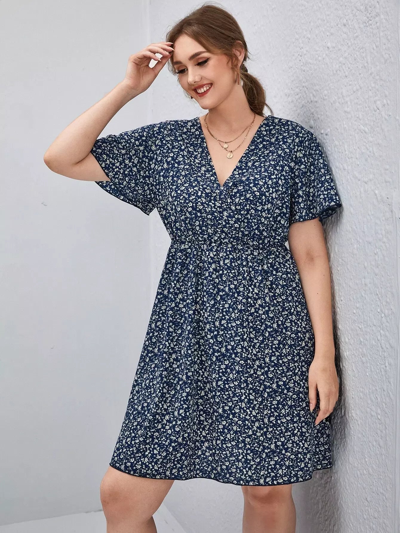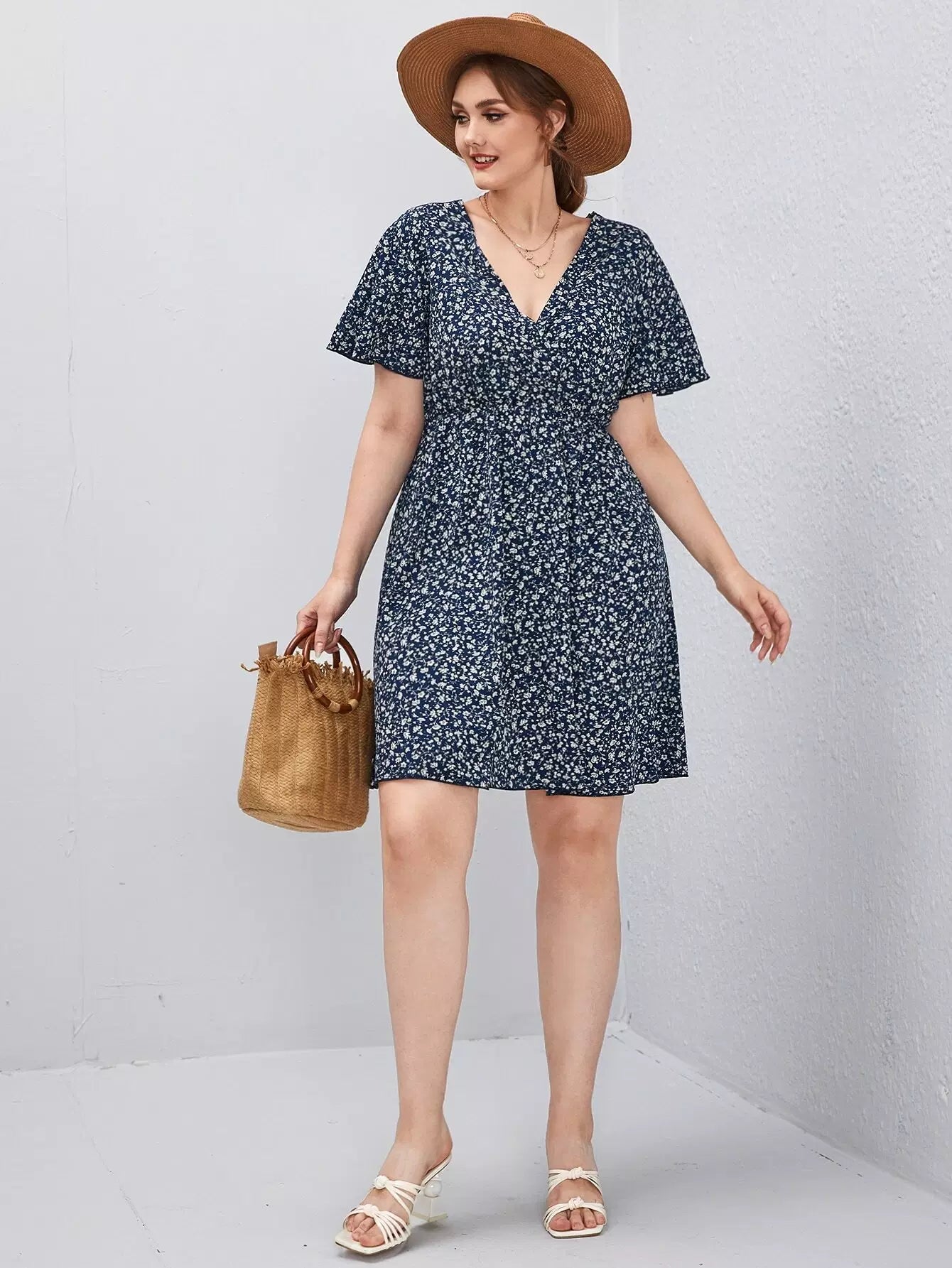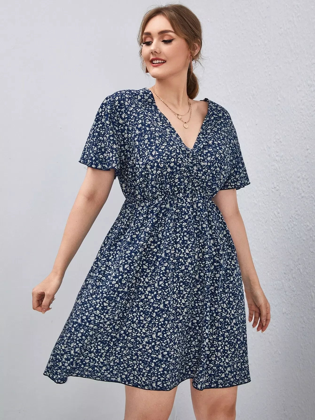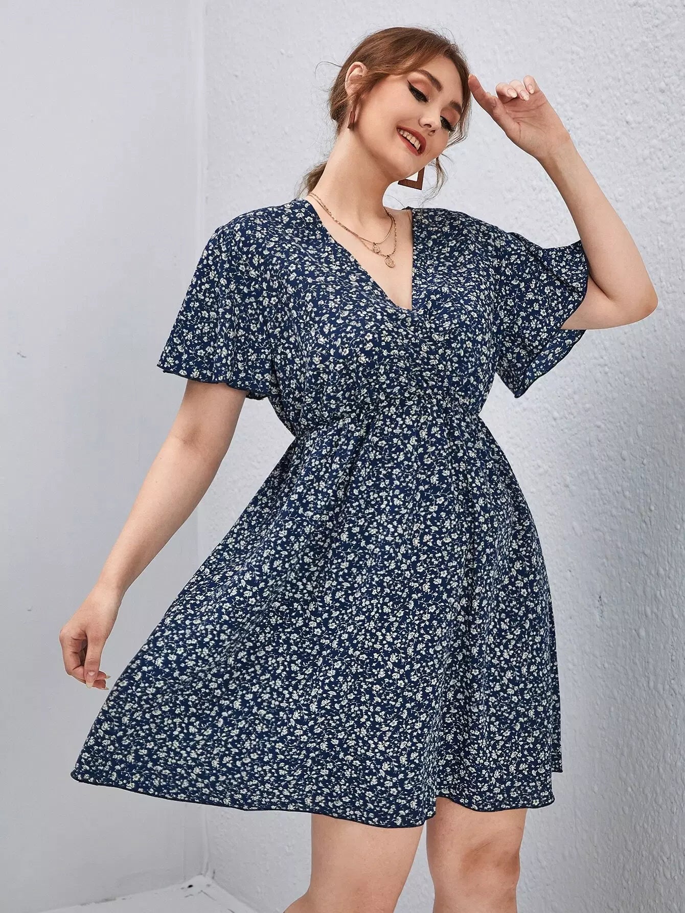 Plus Ditsy Floral Surplice Front Flutter Sleeve Dress