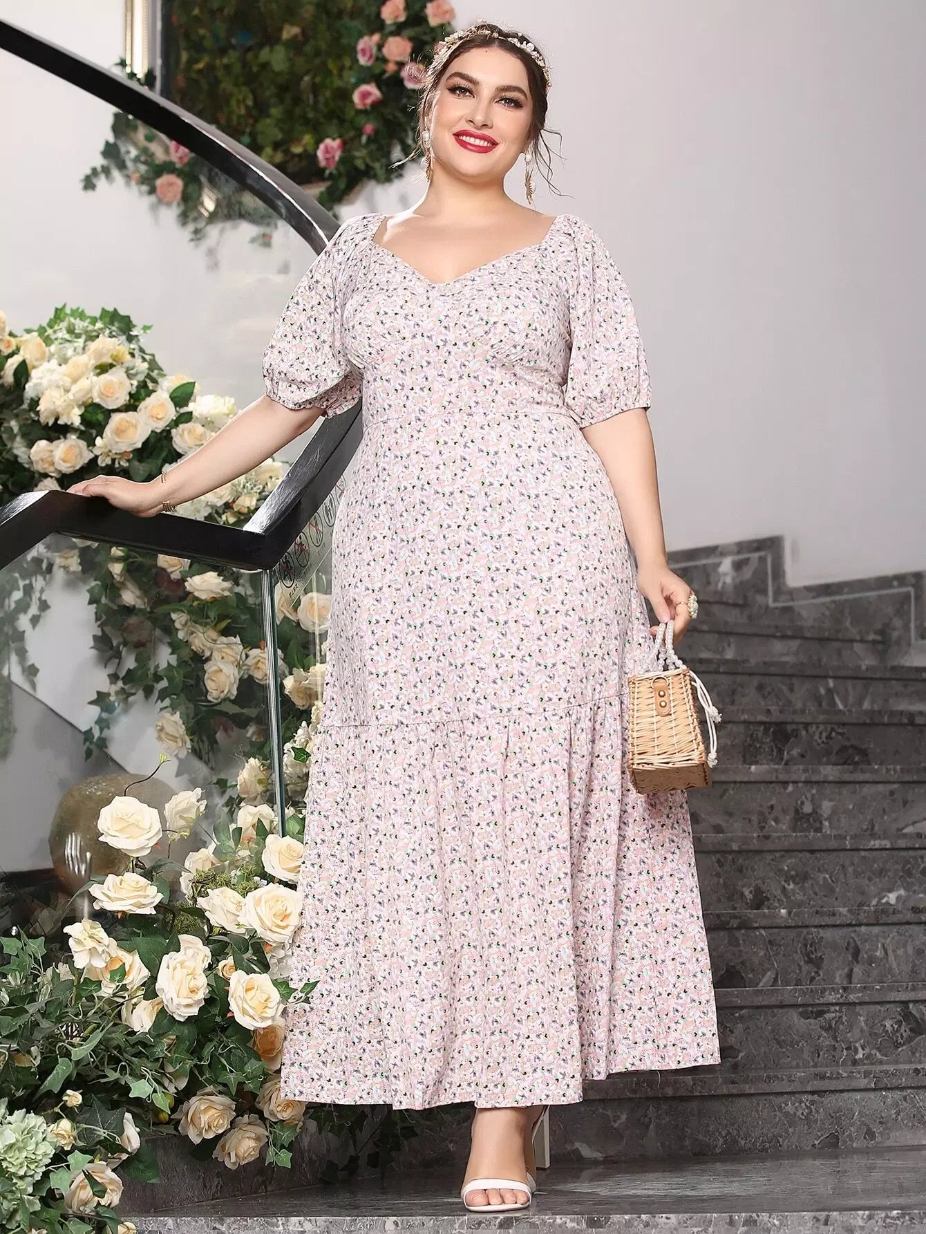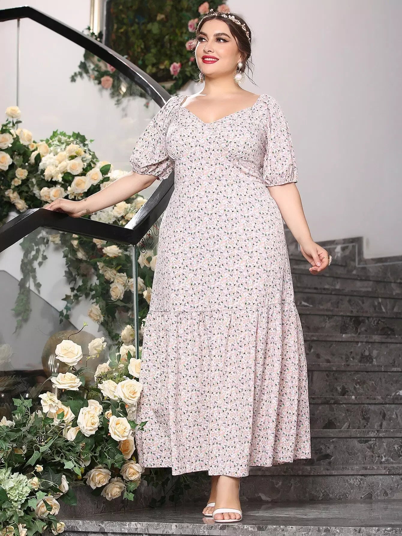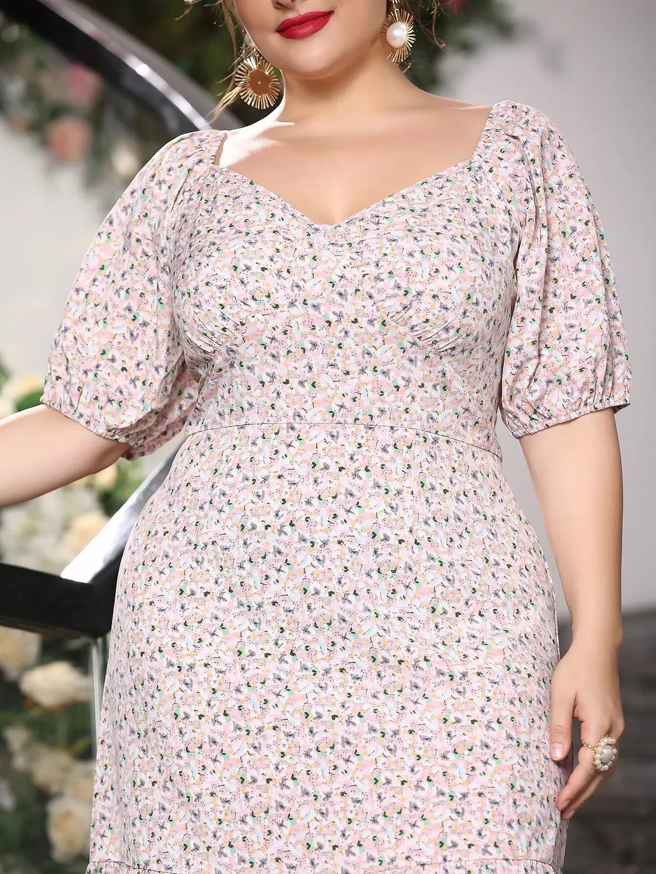 Plus Ditsy Floral Sweetheart Neck Puff Sleeve Dress
