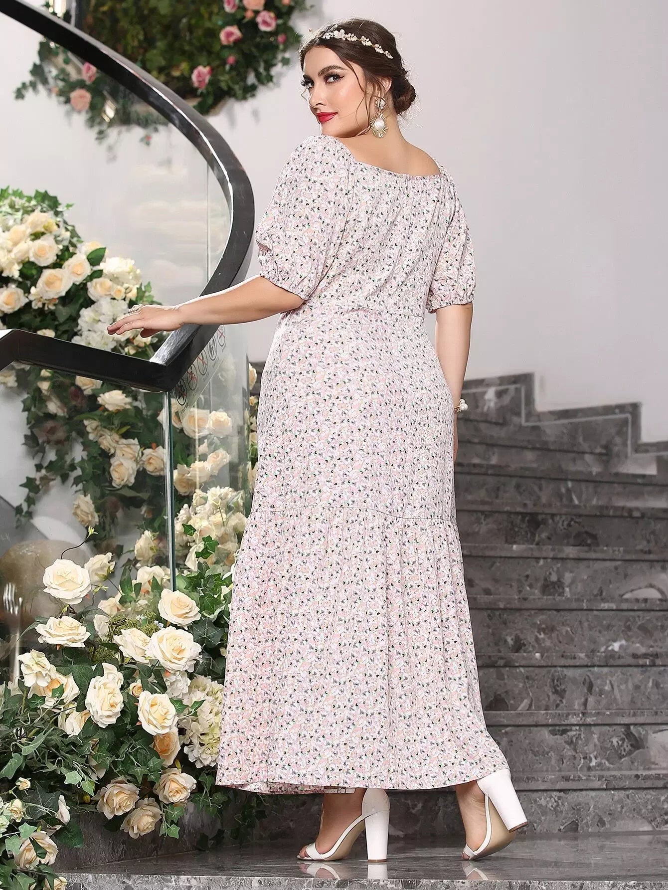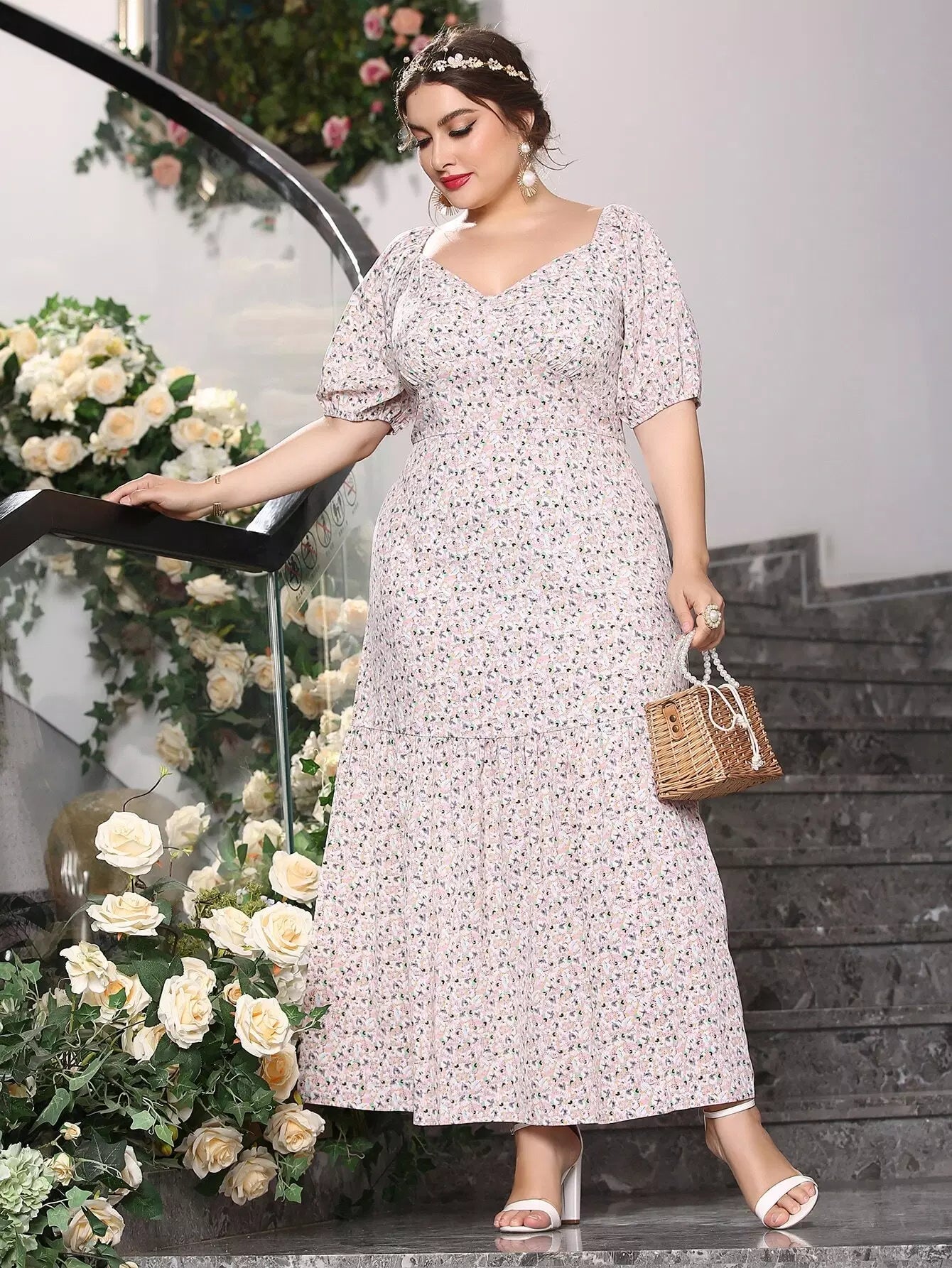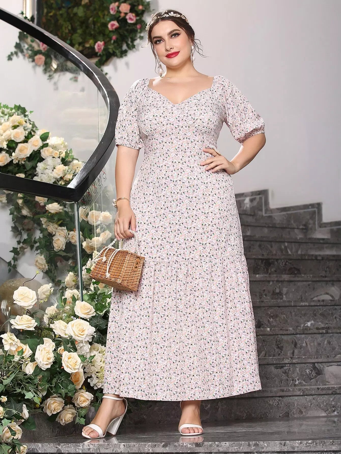 Plus Ditsy Floral Sweetheart Neck Puff Sleeve Dress