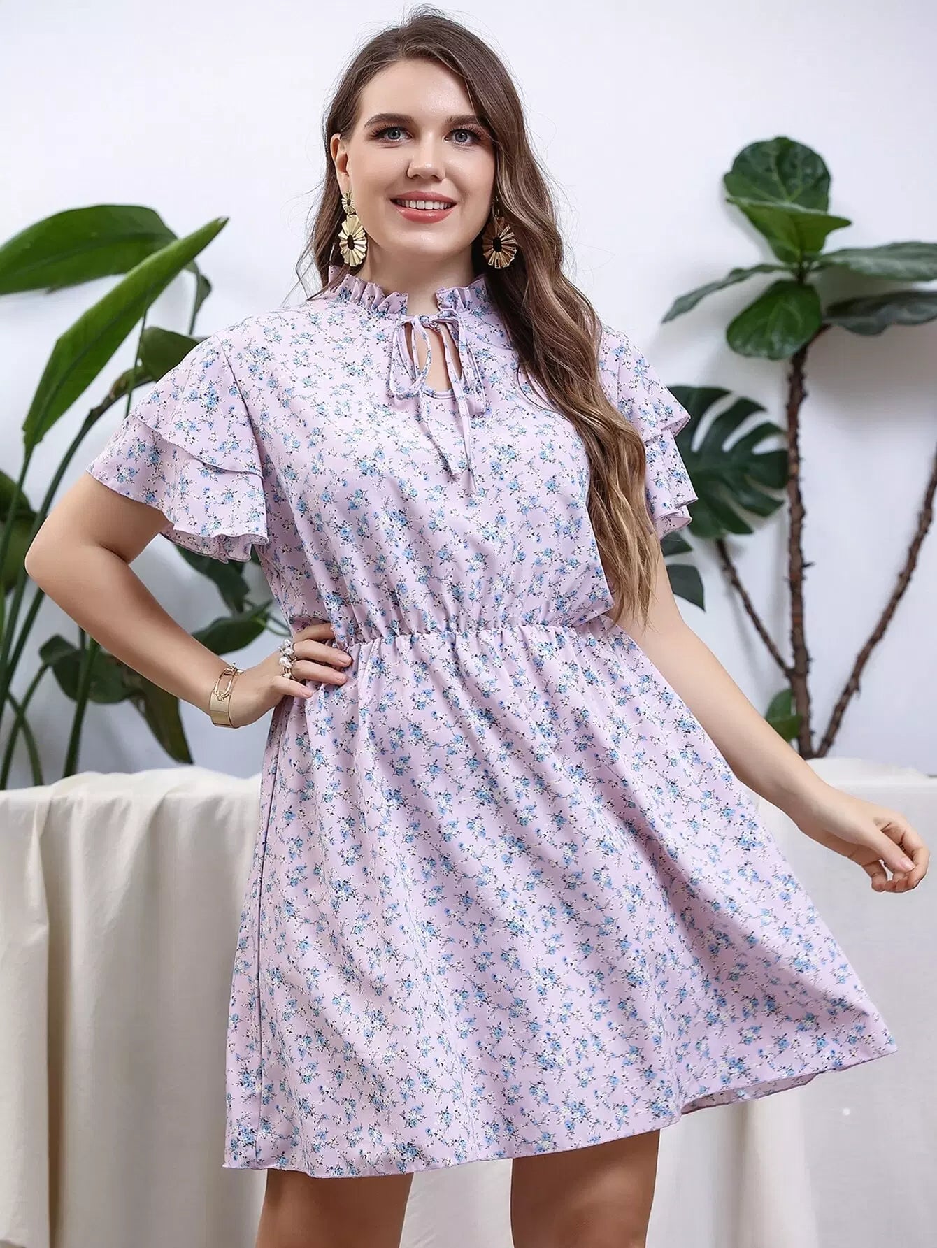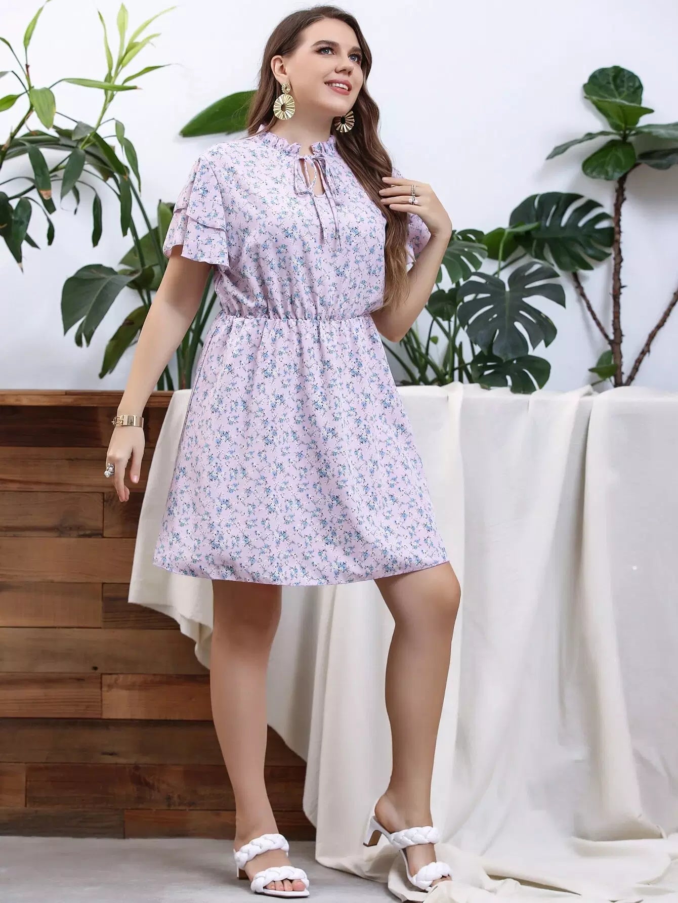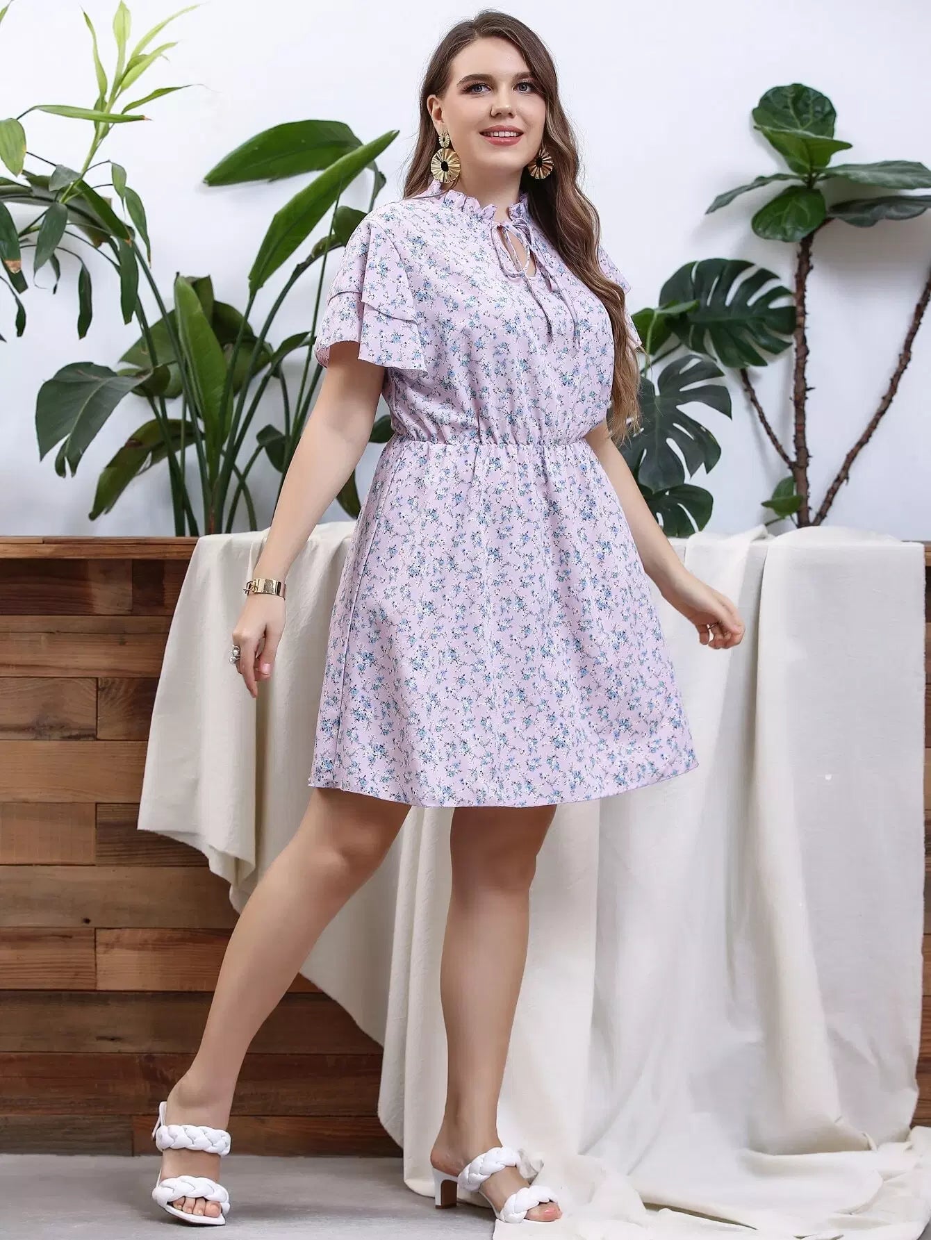 Plus Ditsy Floral Tie Neck Layered Sleeve A-line Dress