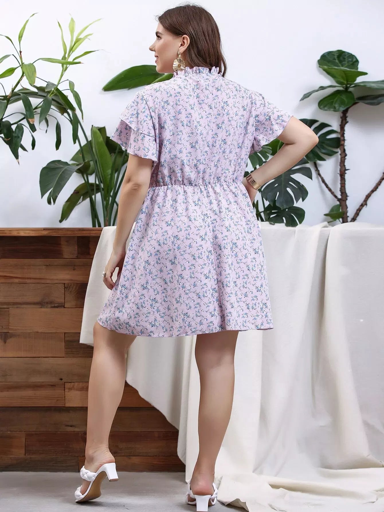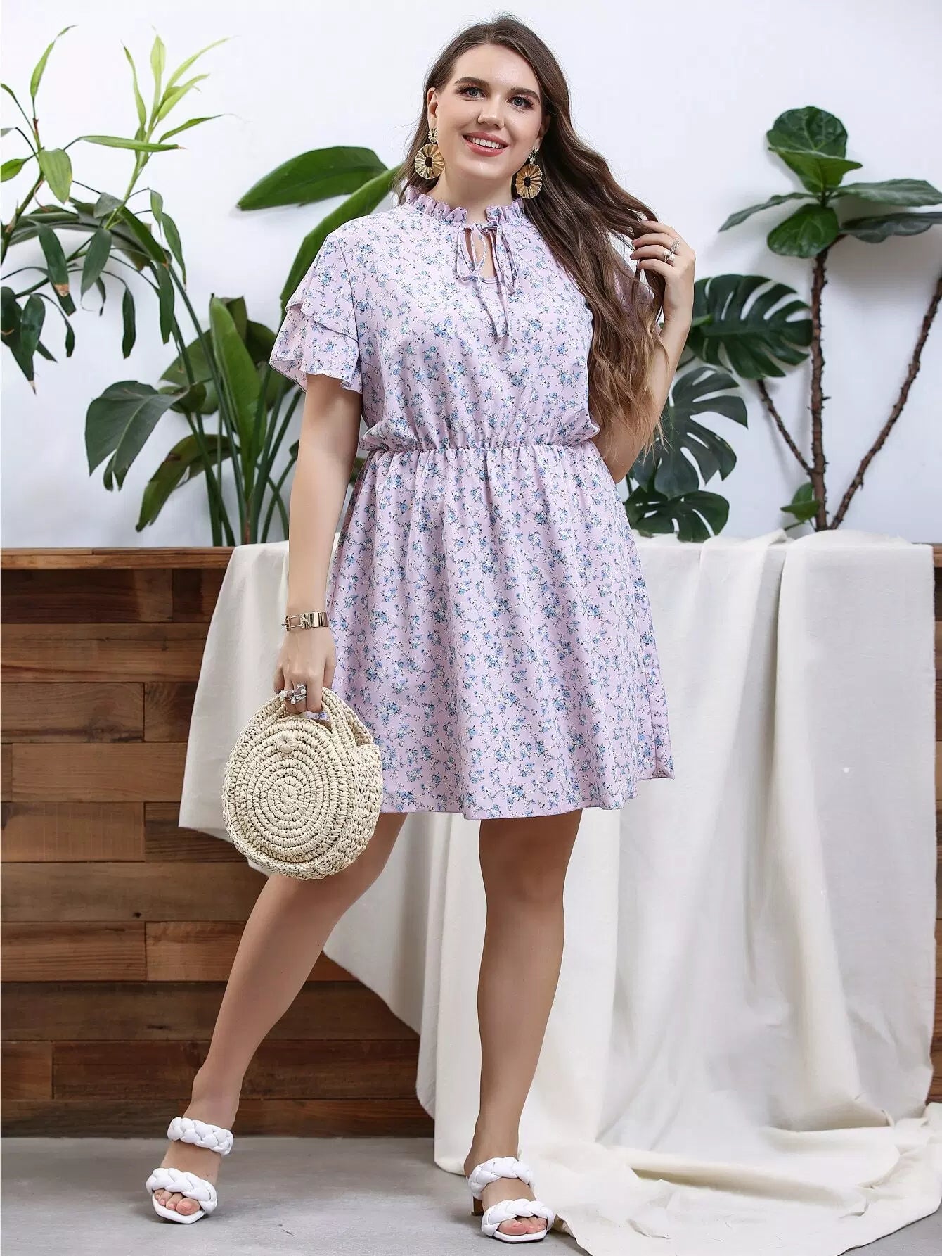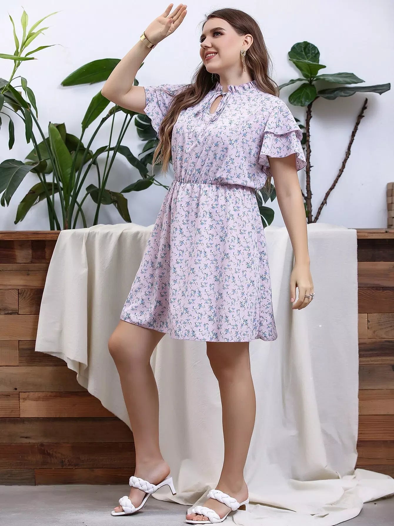 Plus Ditsy Floral Tie Neck Layered Sleeve A-line Dress
