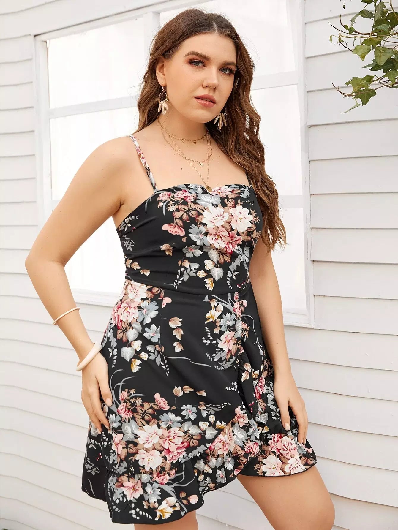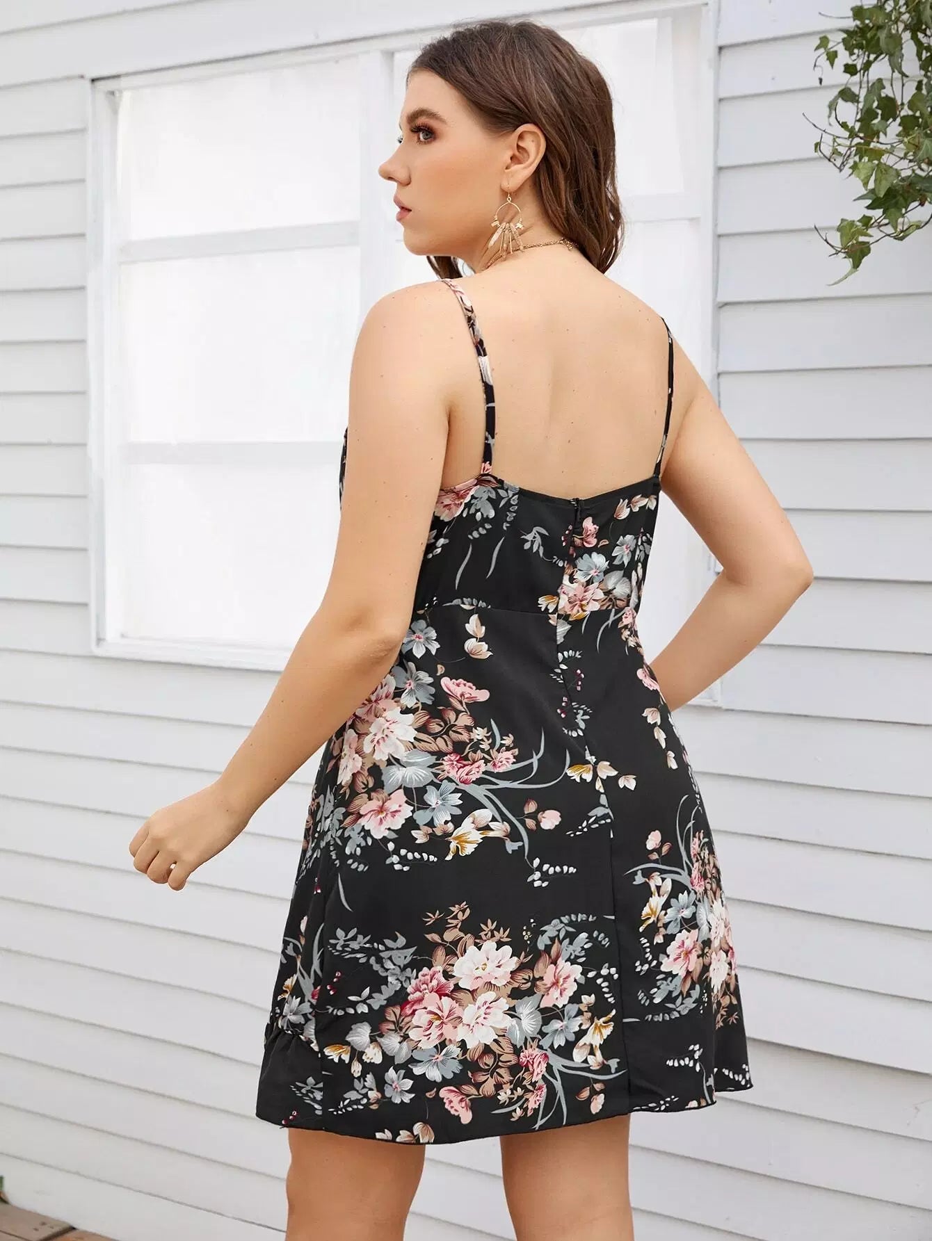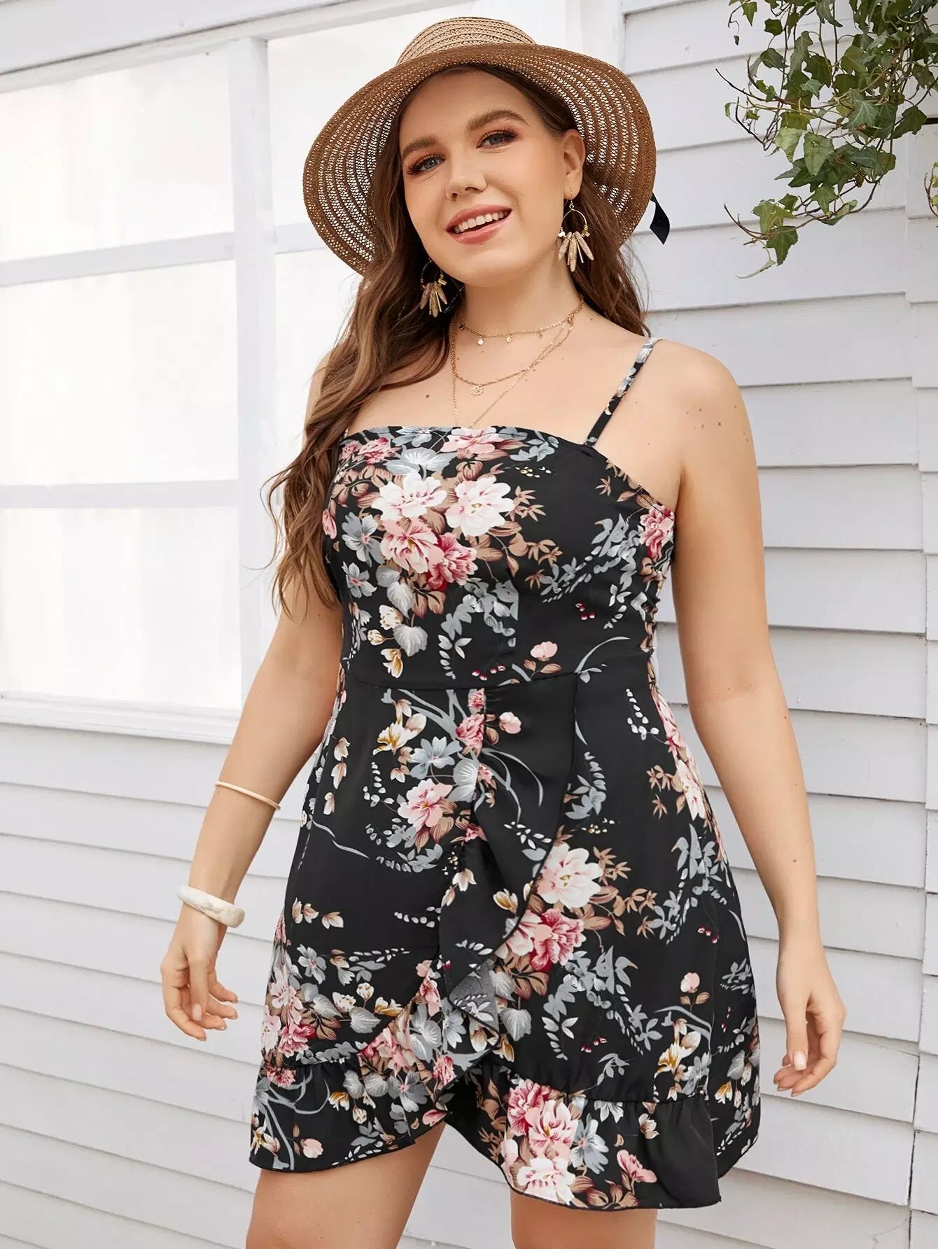 Plus Floral Print Ruffle Wrap Hem Cami Dress