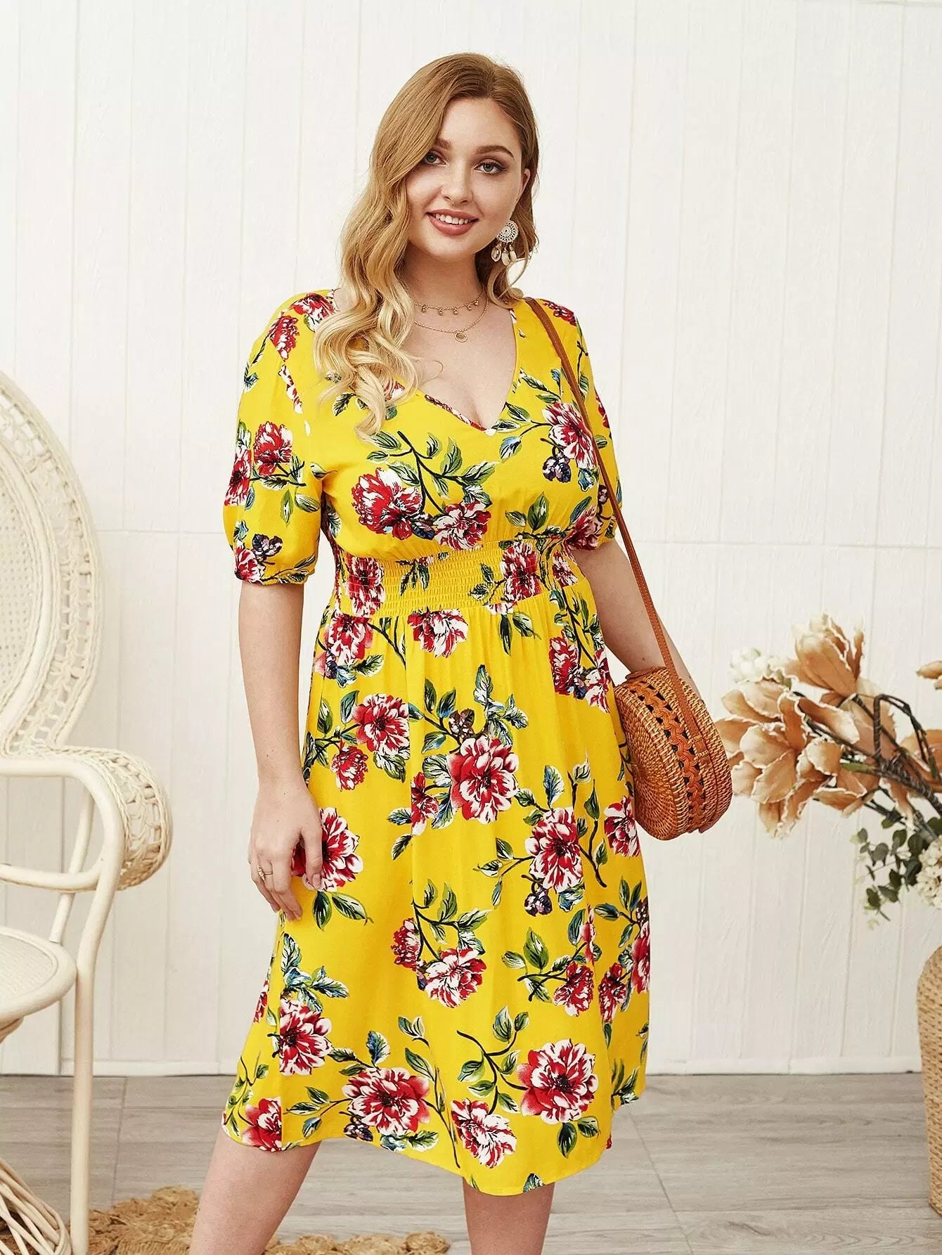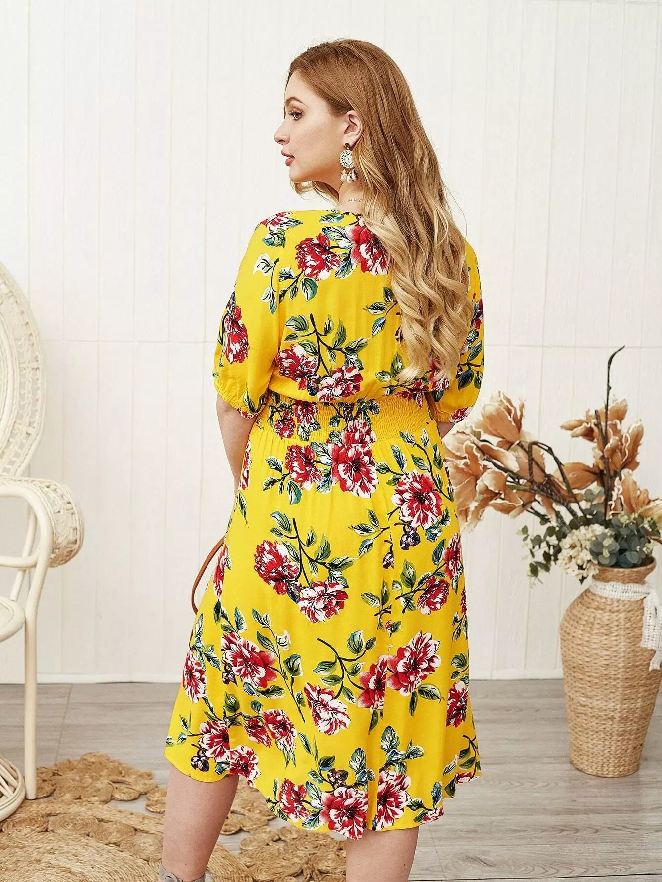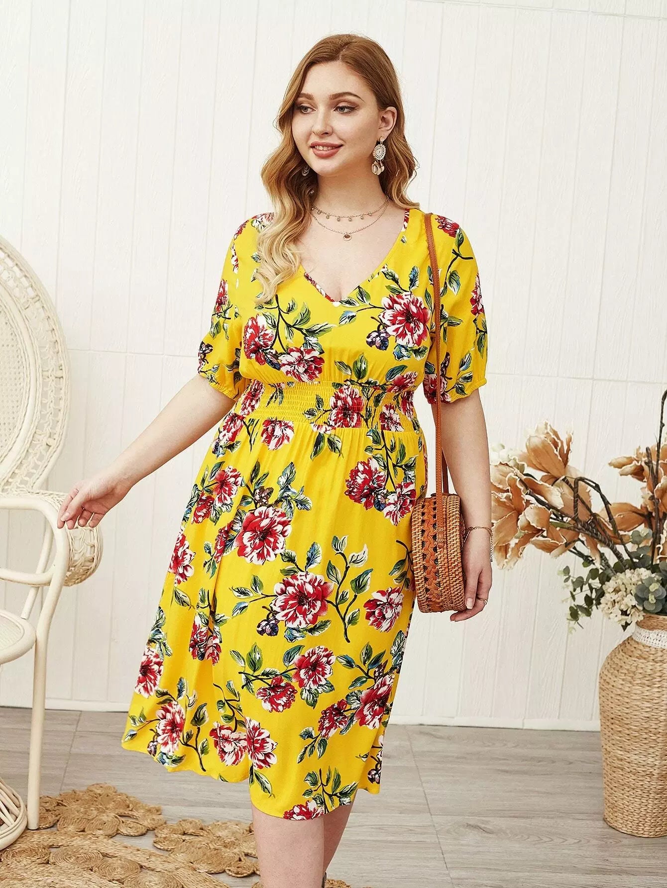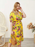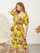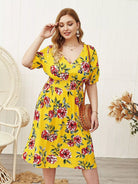 Plus Floral Print Shirred Waist A-line Dress