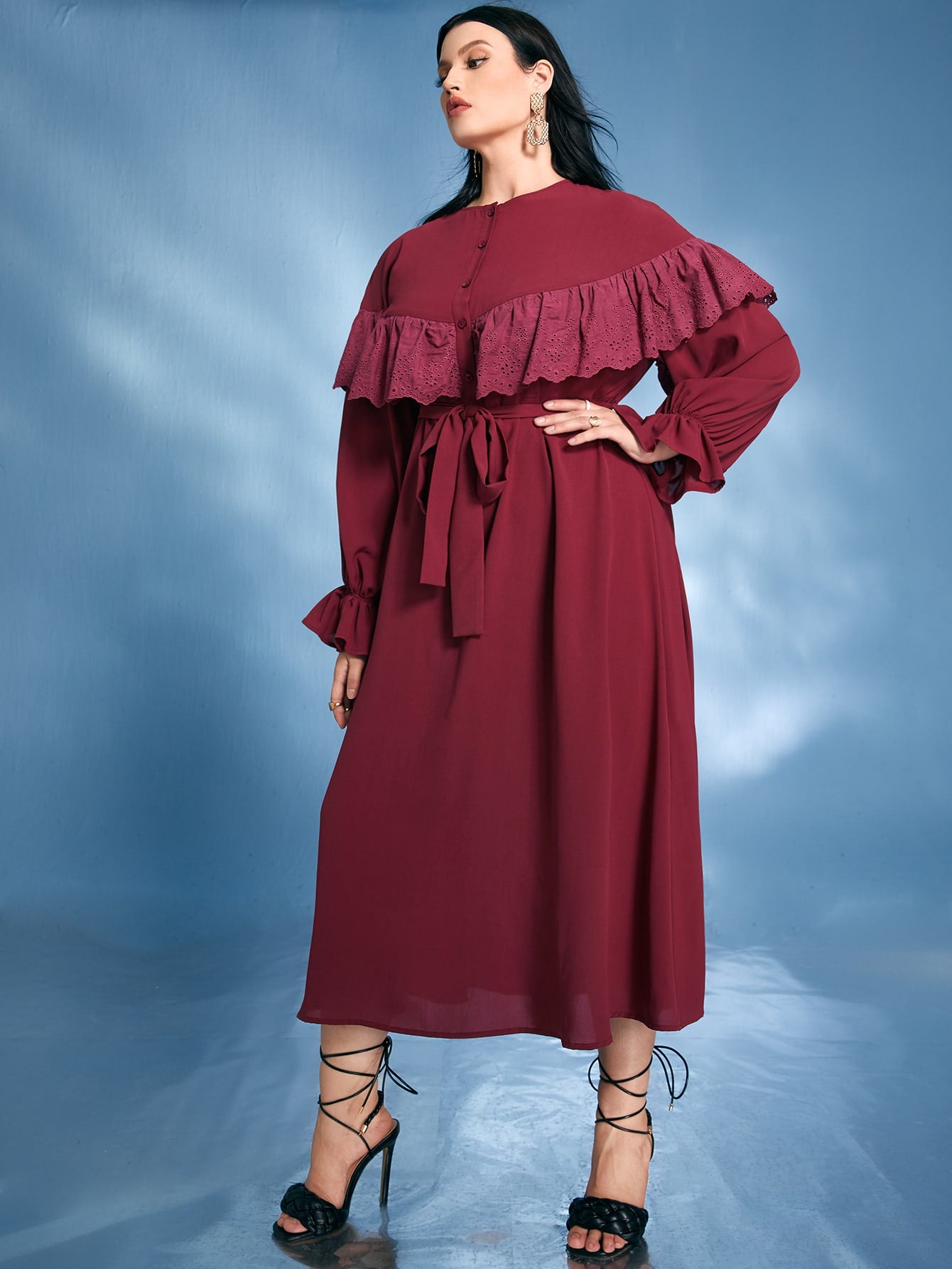 Plus Flounce Sleeve Ruffle Trim Belted Dress