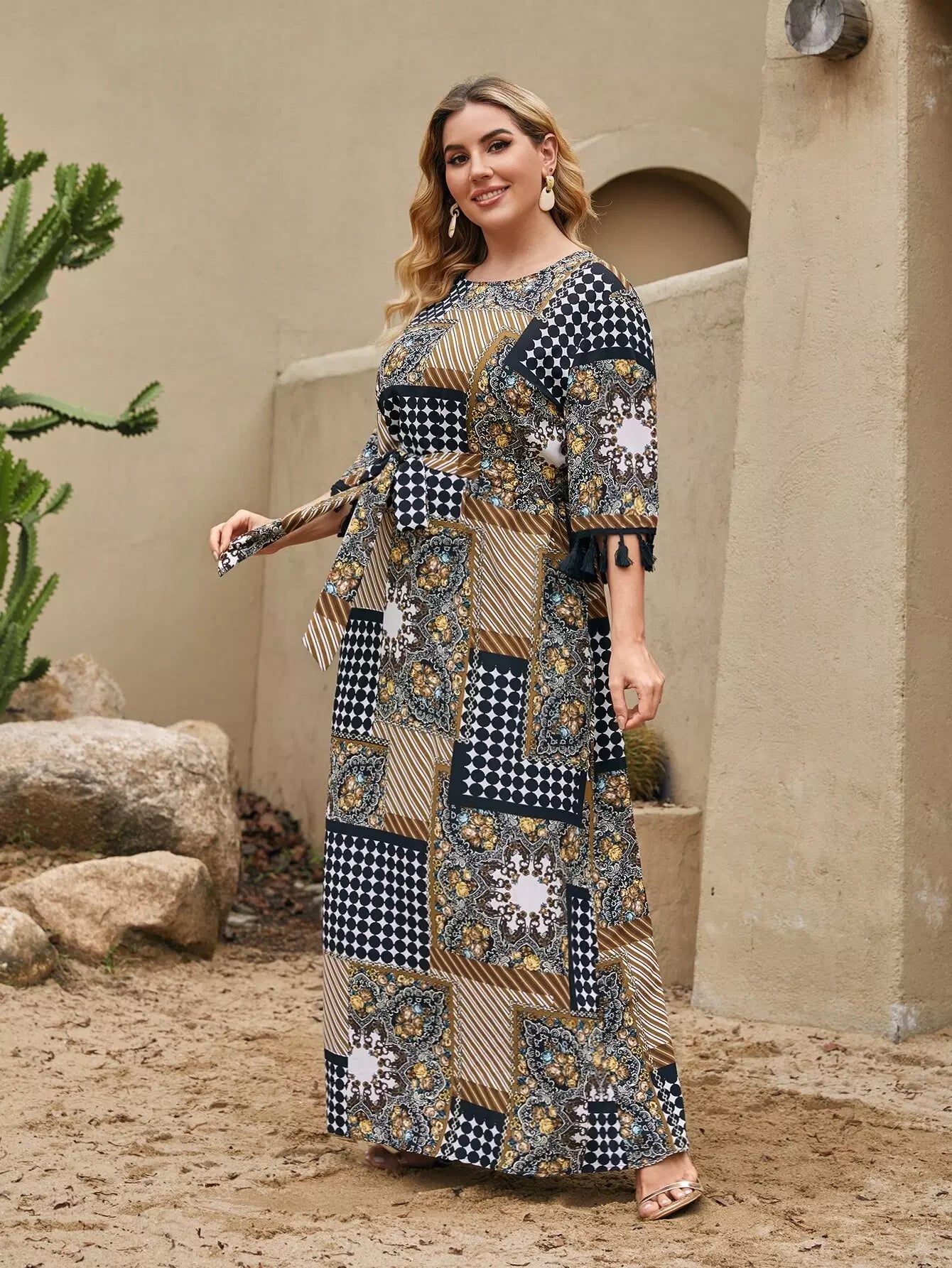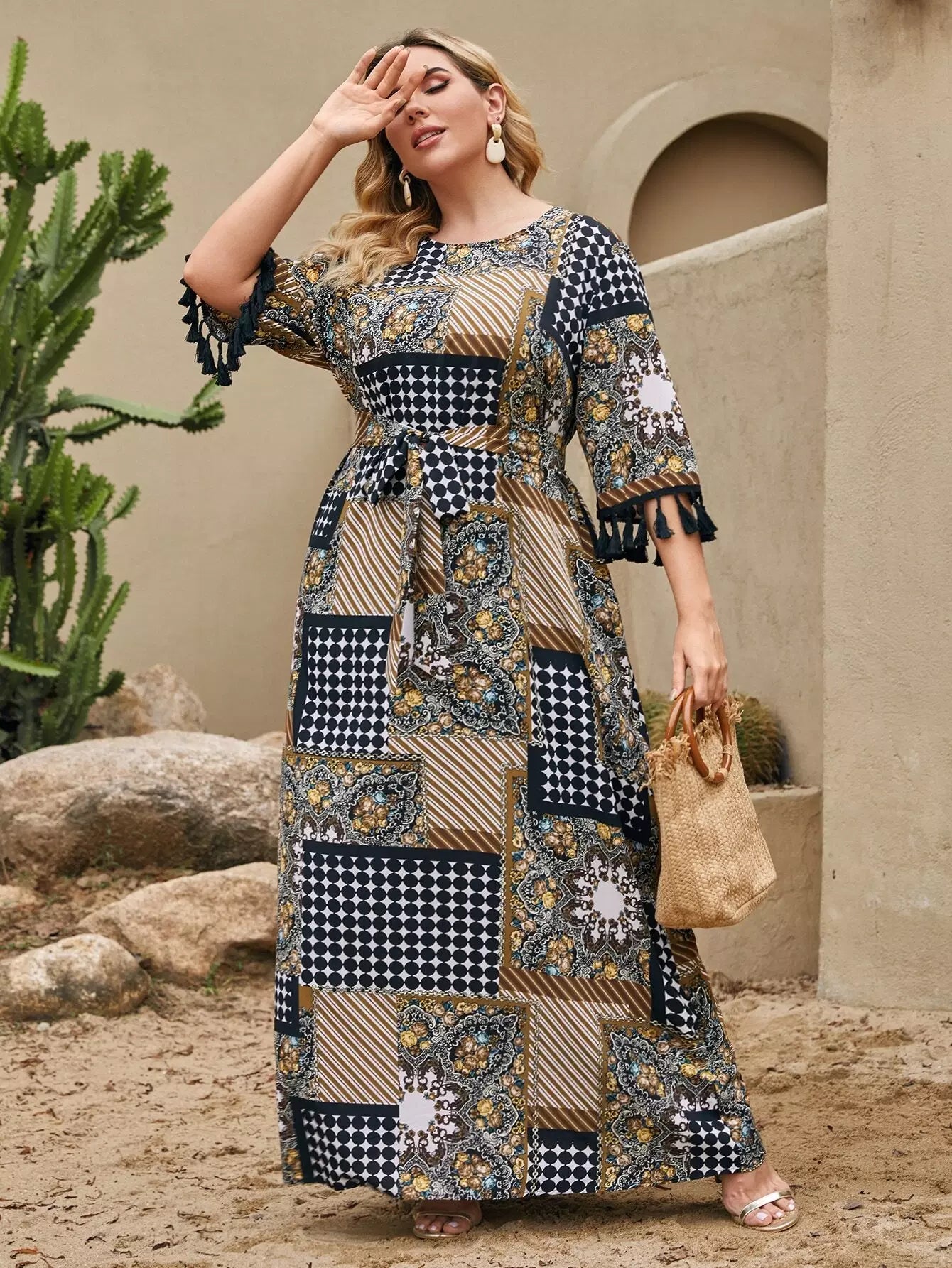Plus Fringe Cuff Patchwork Print Dress Without Belt