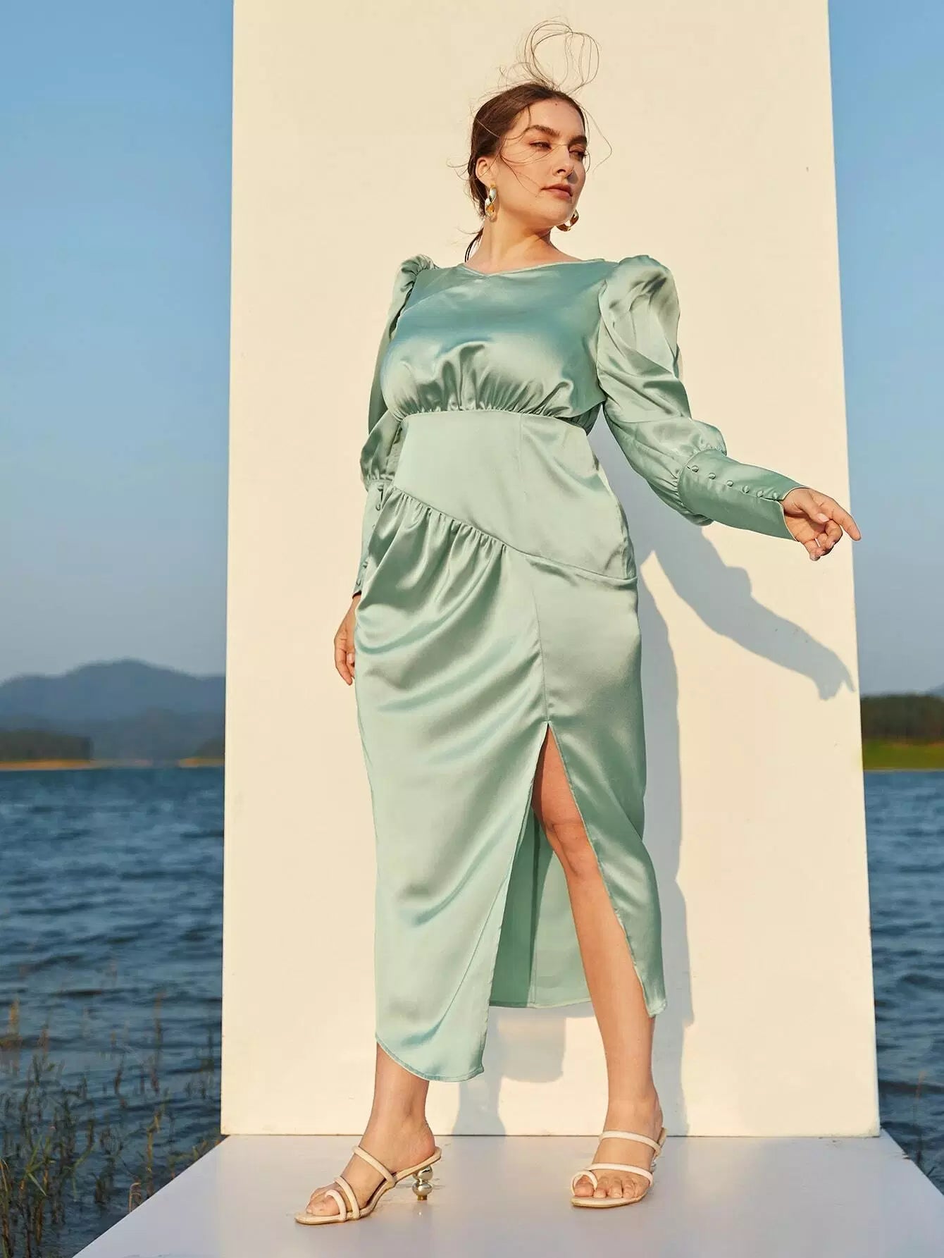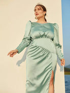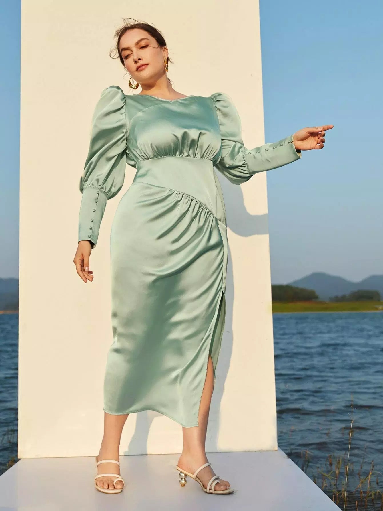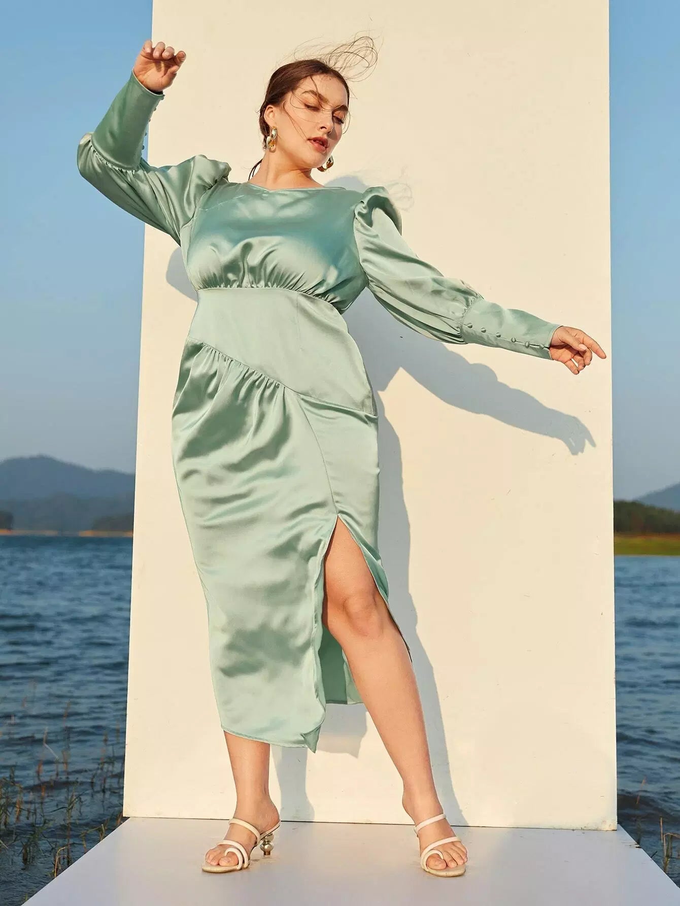 Plus Gigot Sleeve Slit Hem Satin Fitted Dress