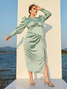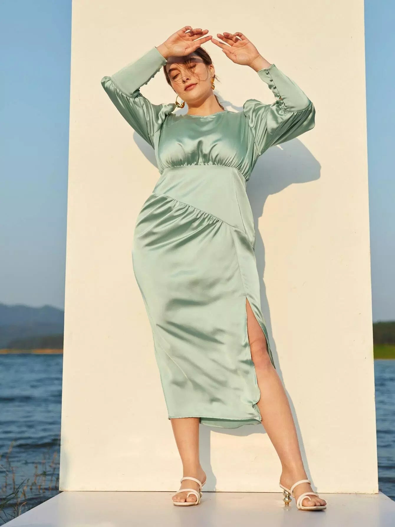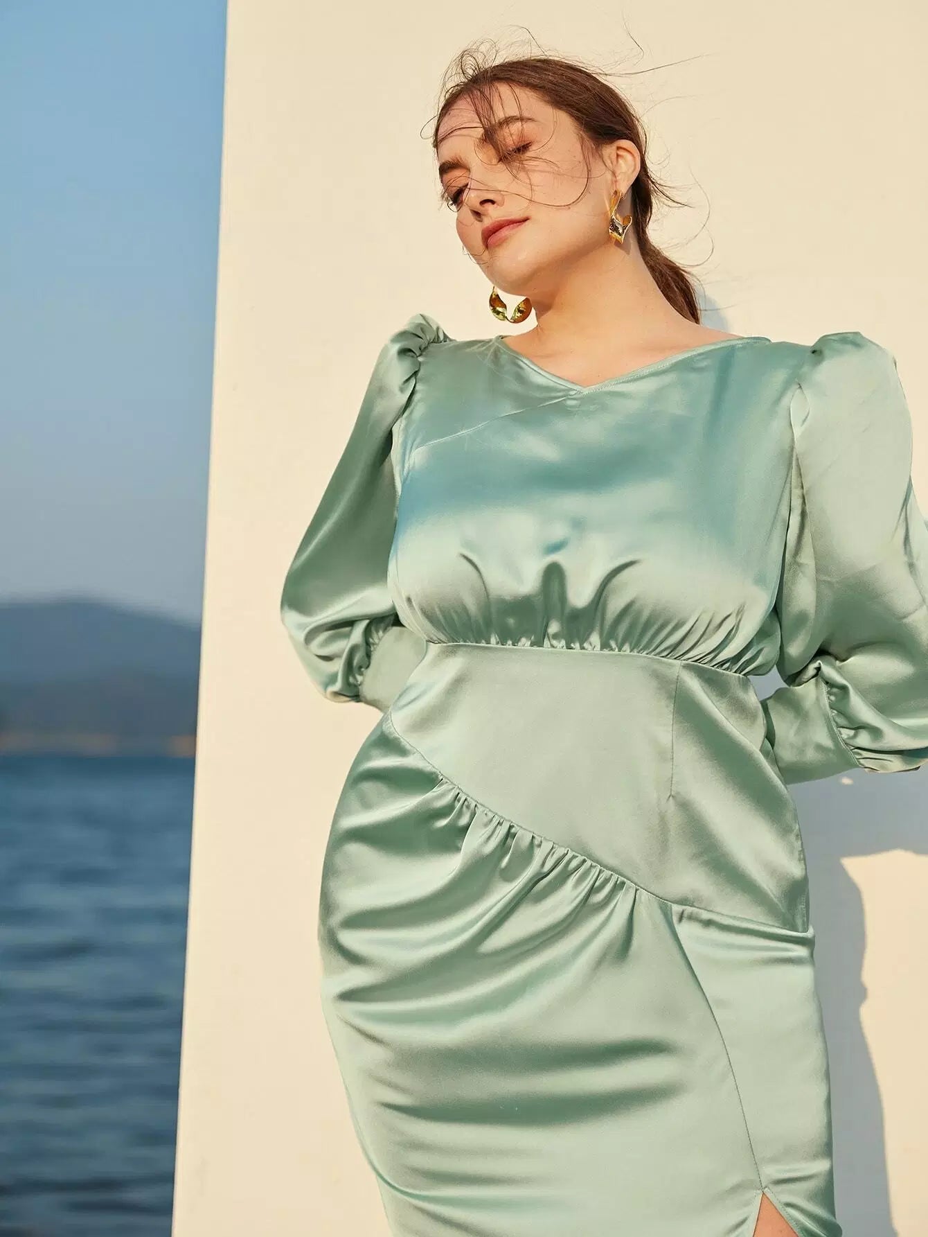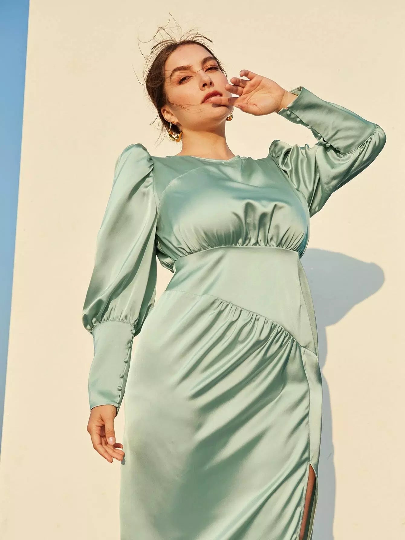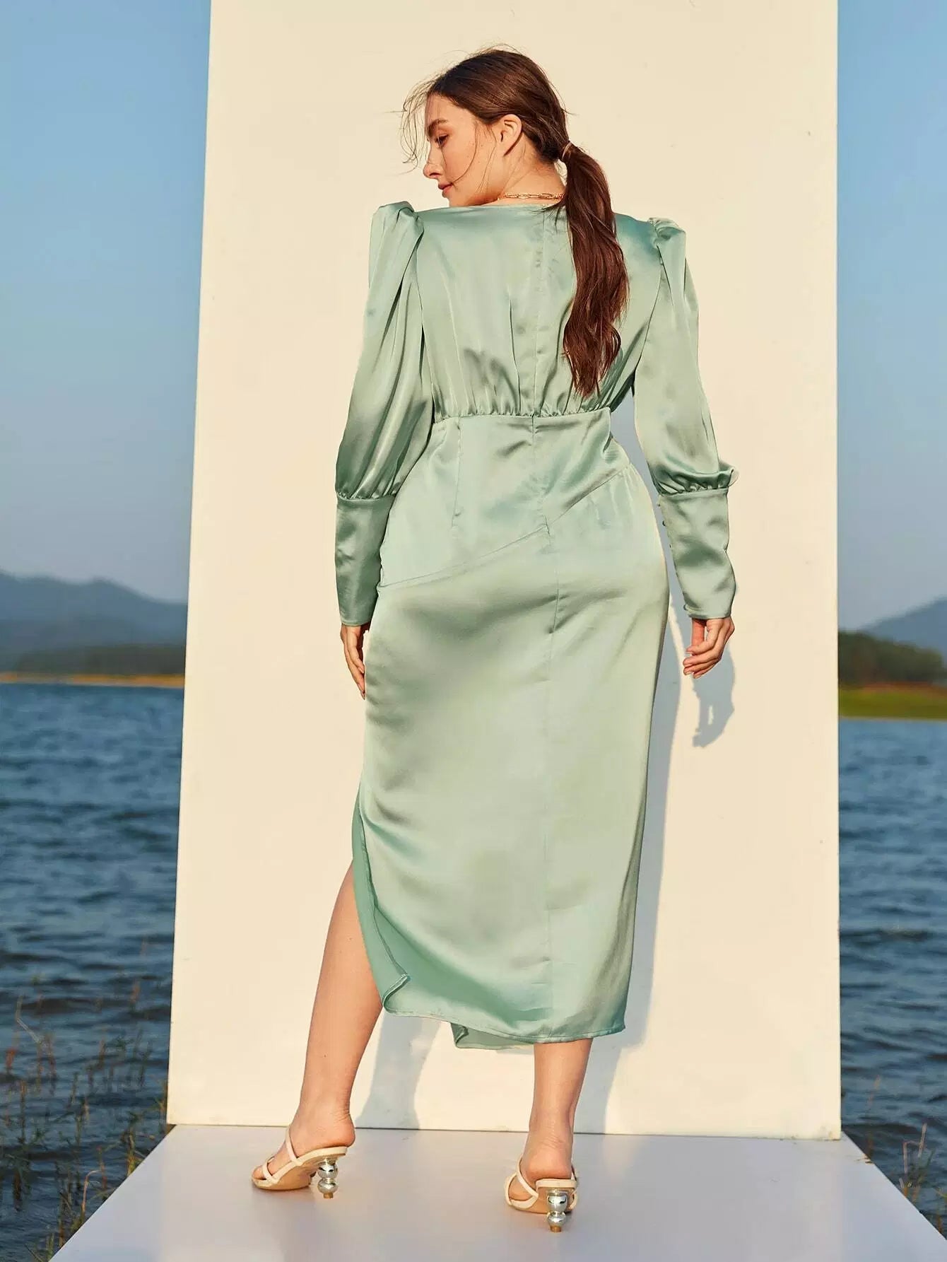 Plus Gigot Sleeve Slit Hem Satin Fitted Dress