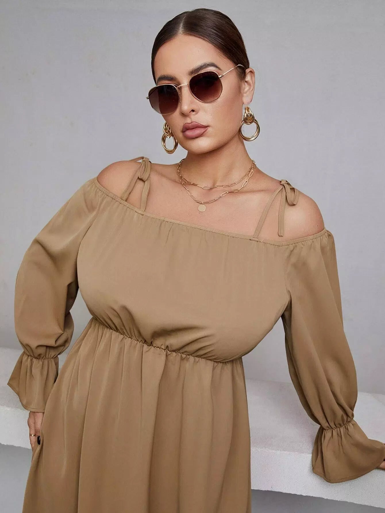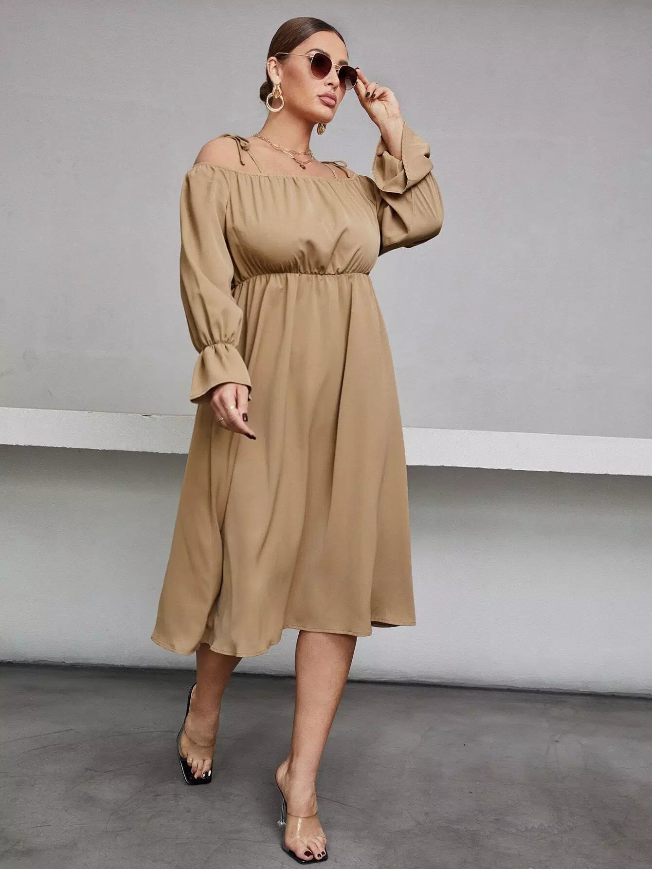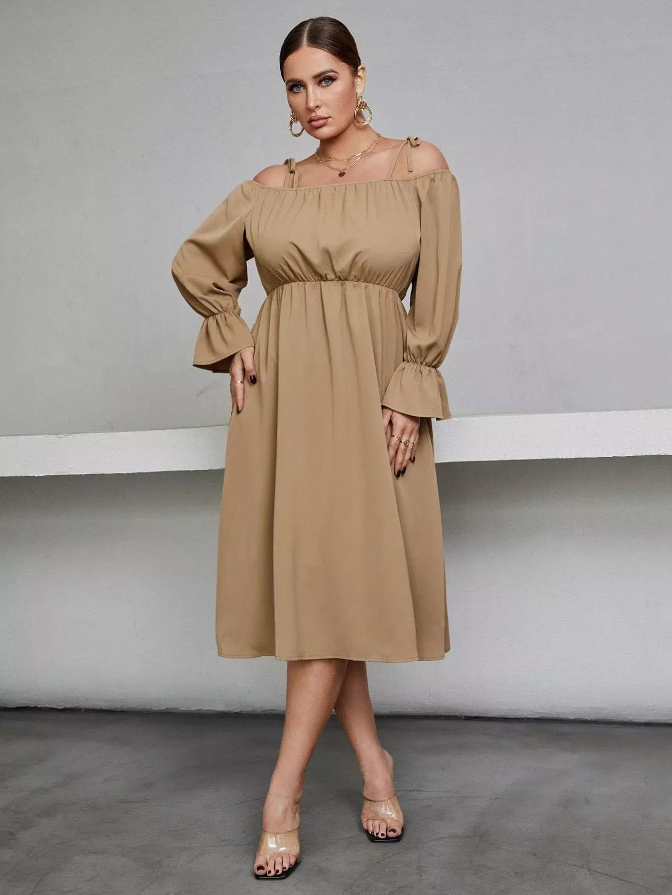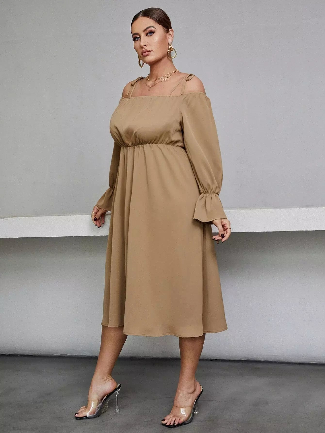 Plus Knot Cold Shoulder Flounce Sleeve Dress