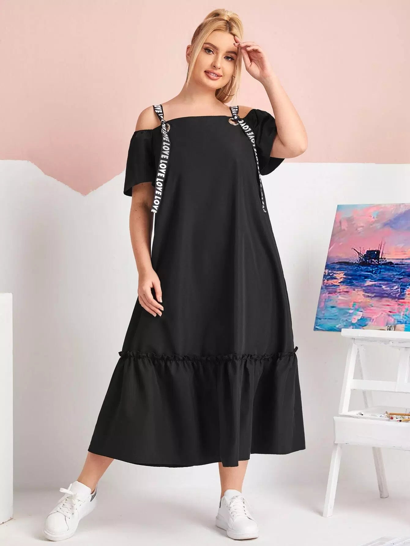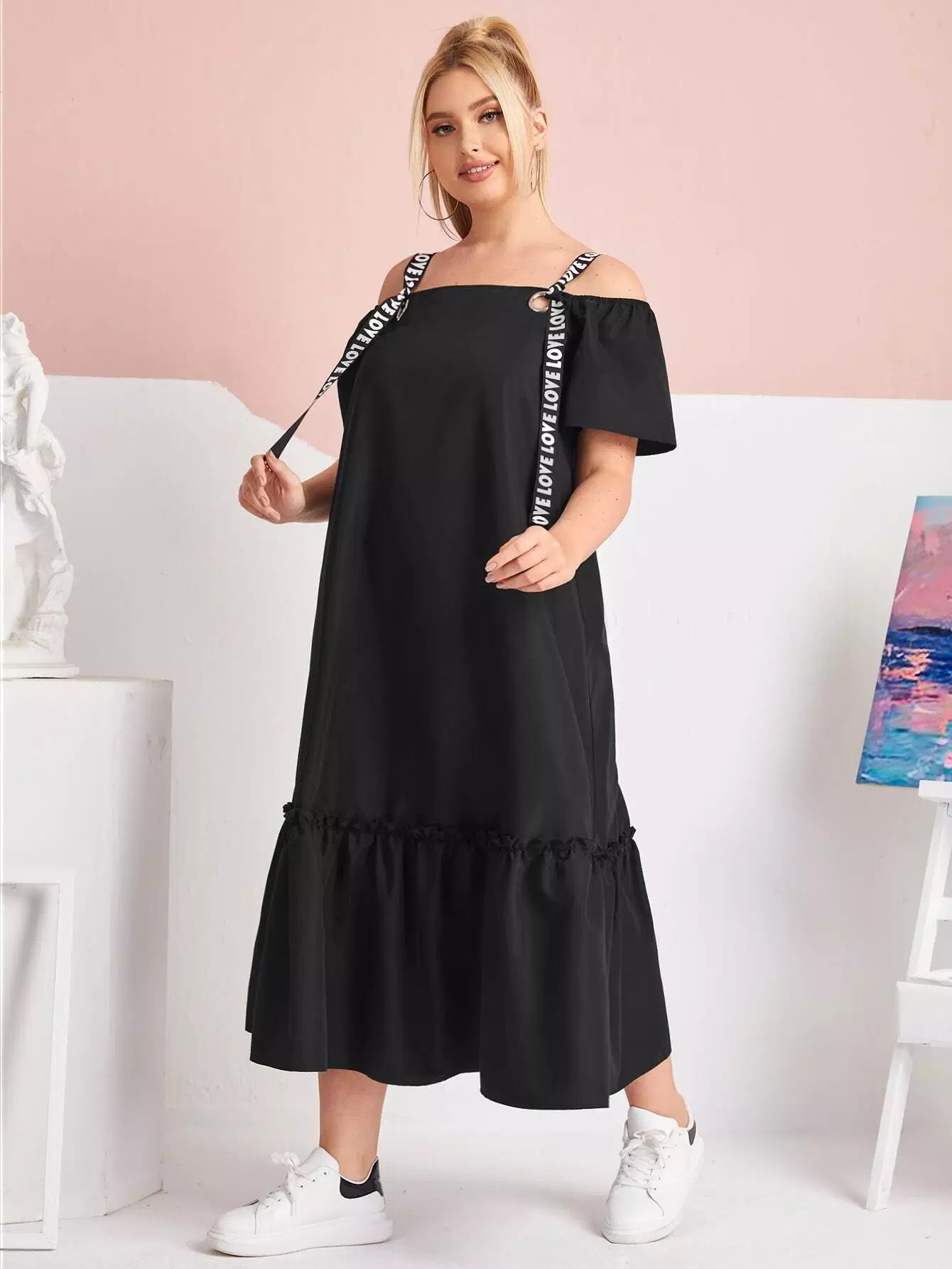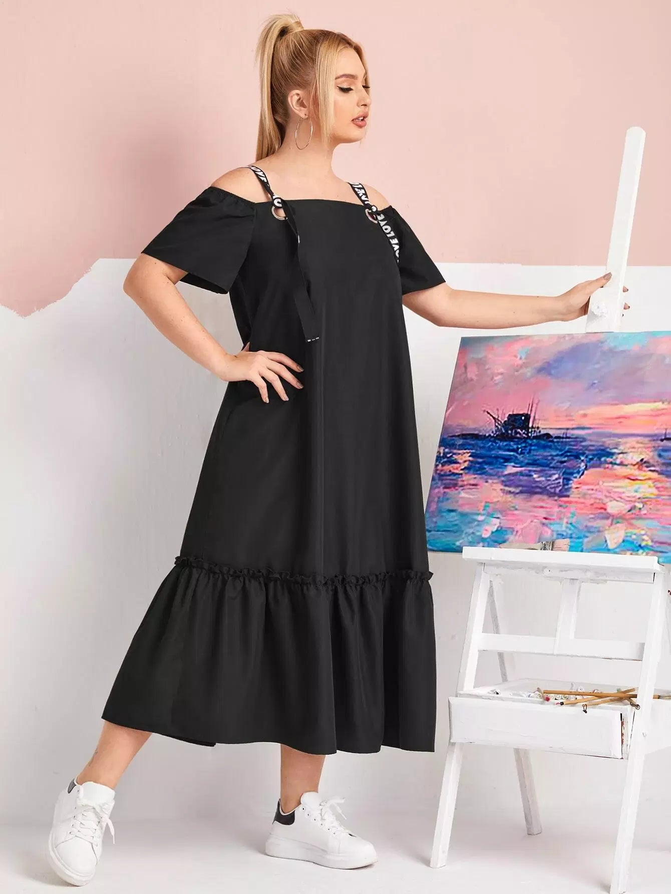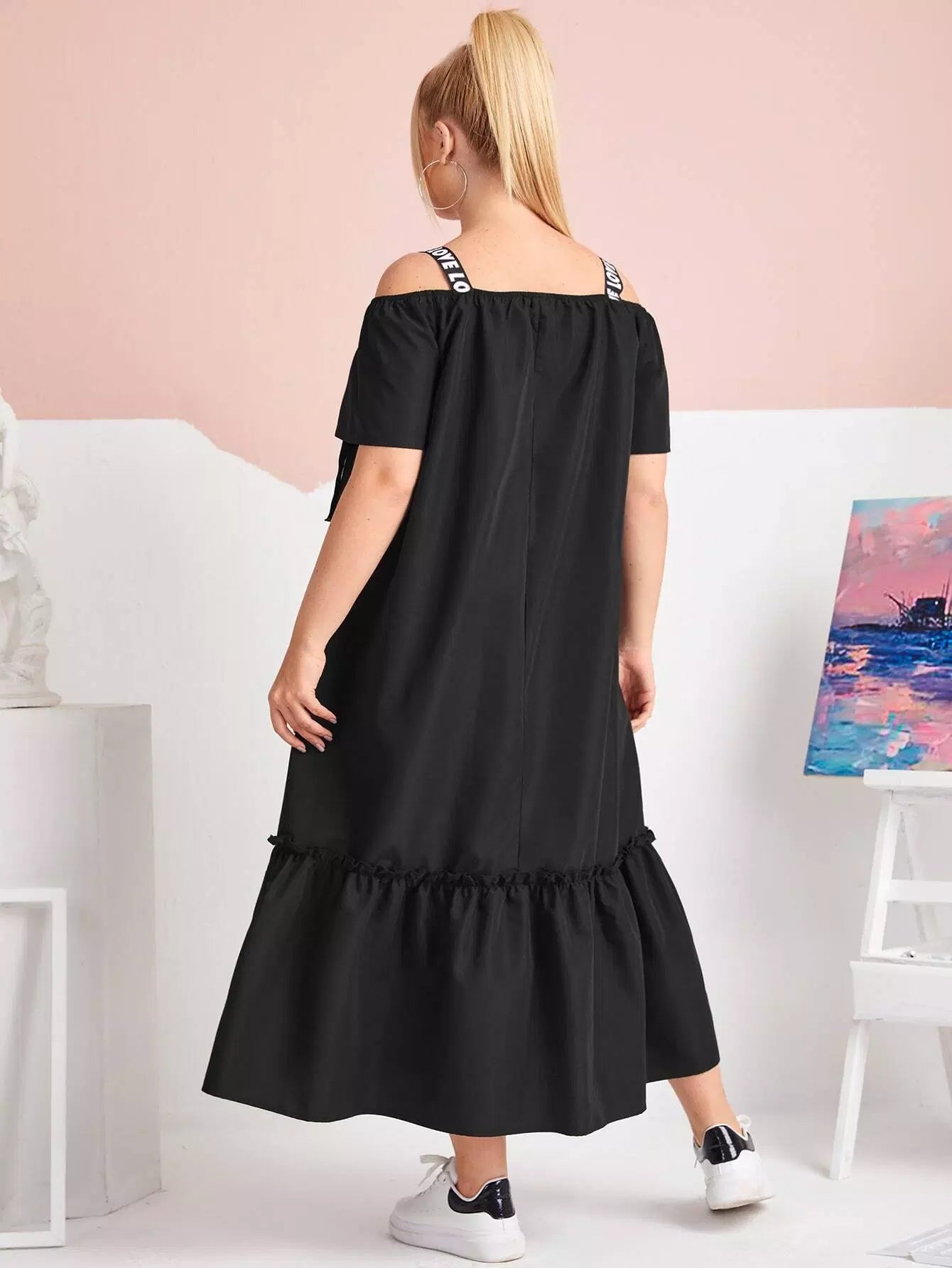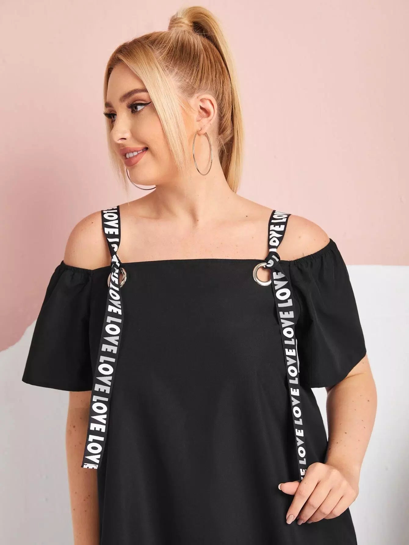 Women - Plus Letter Tape Strap Cold Shoulder Dress