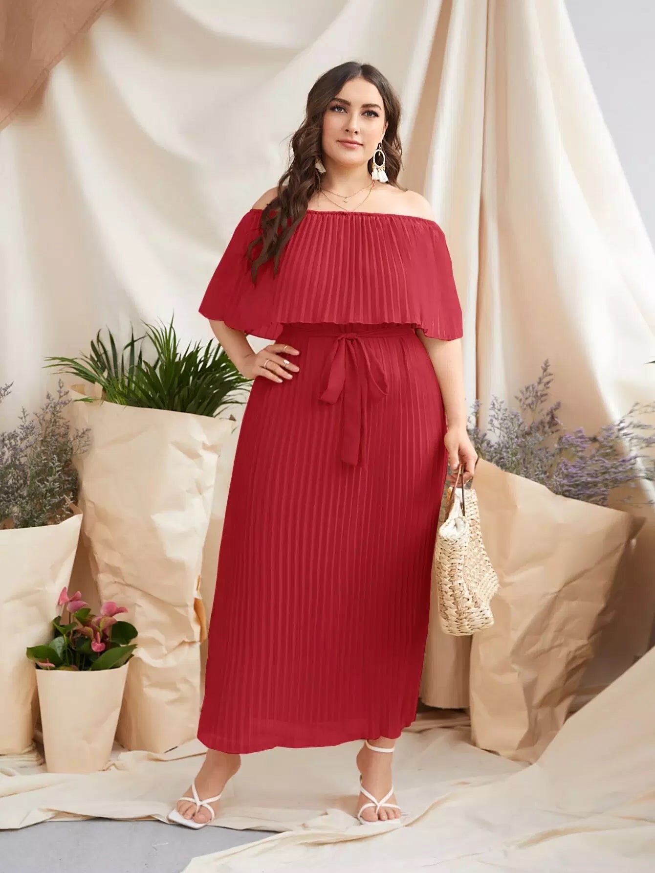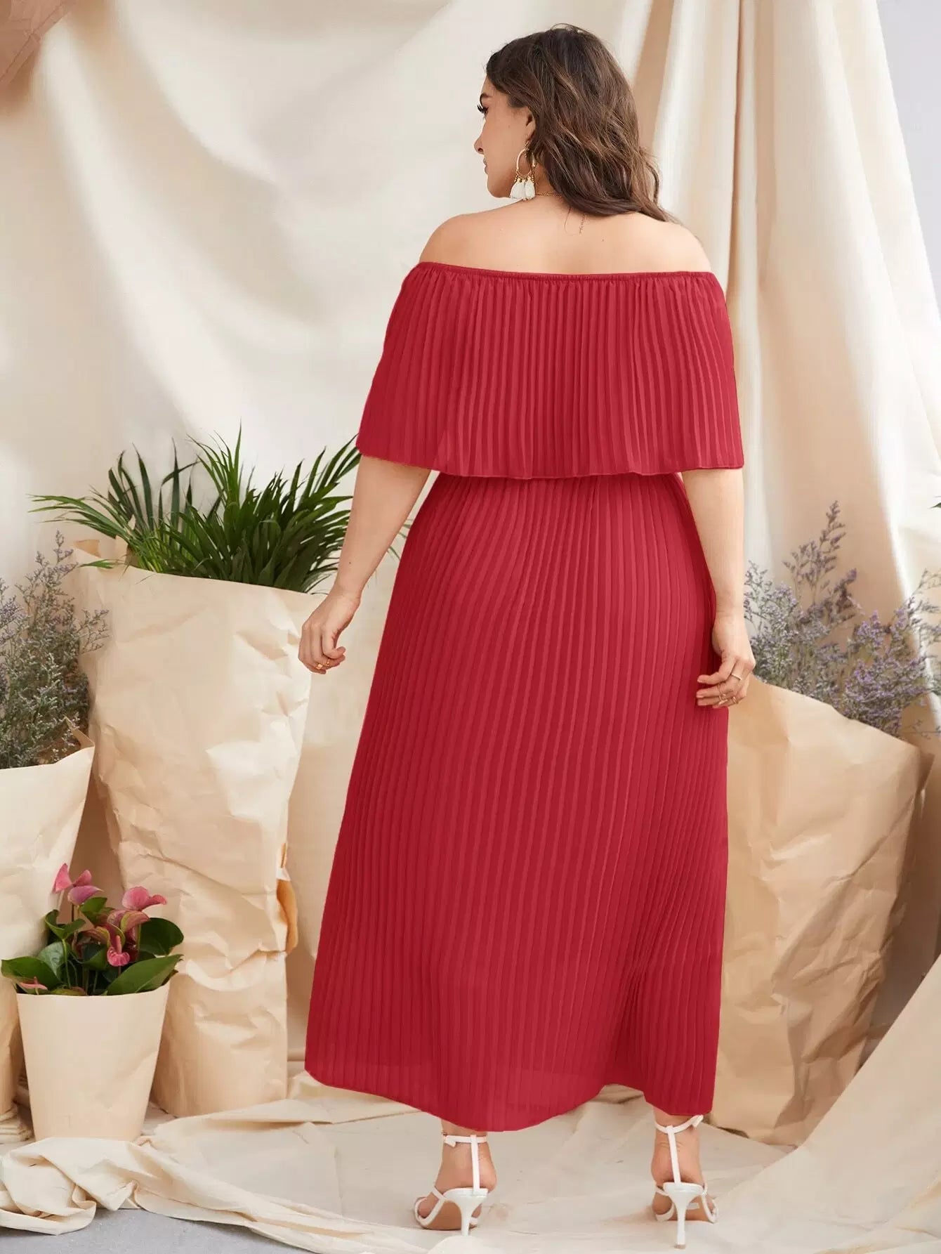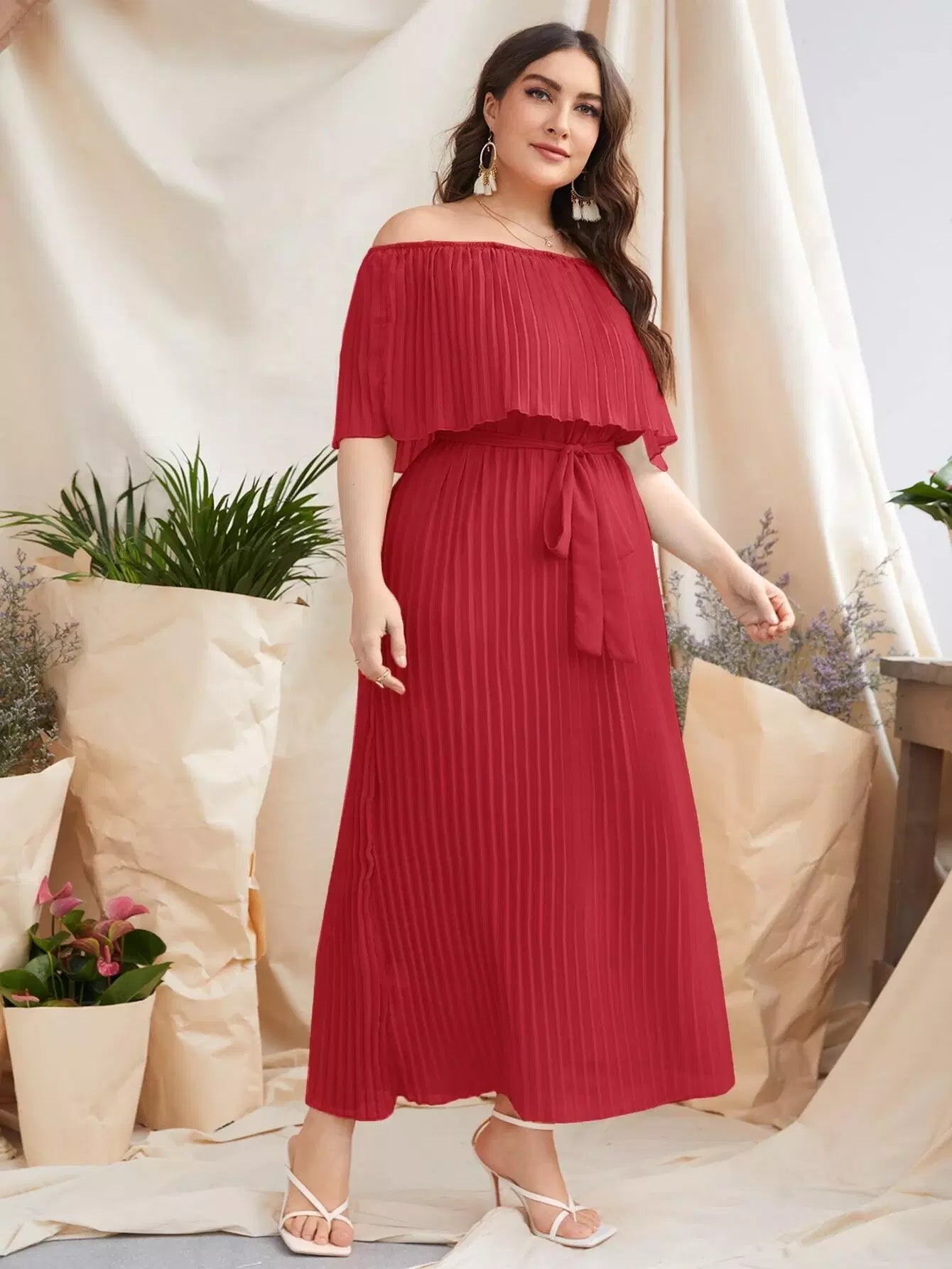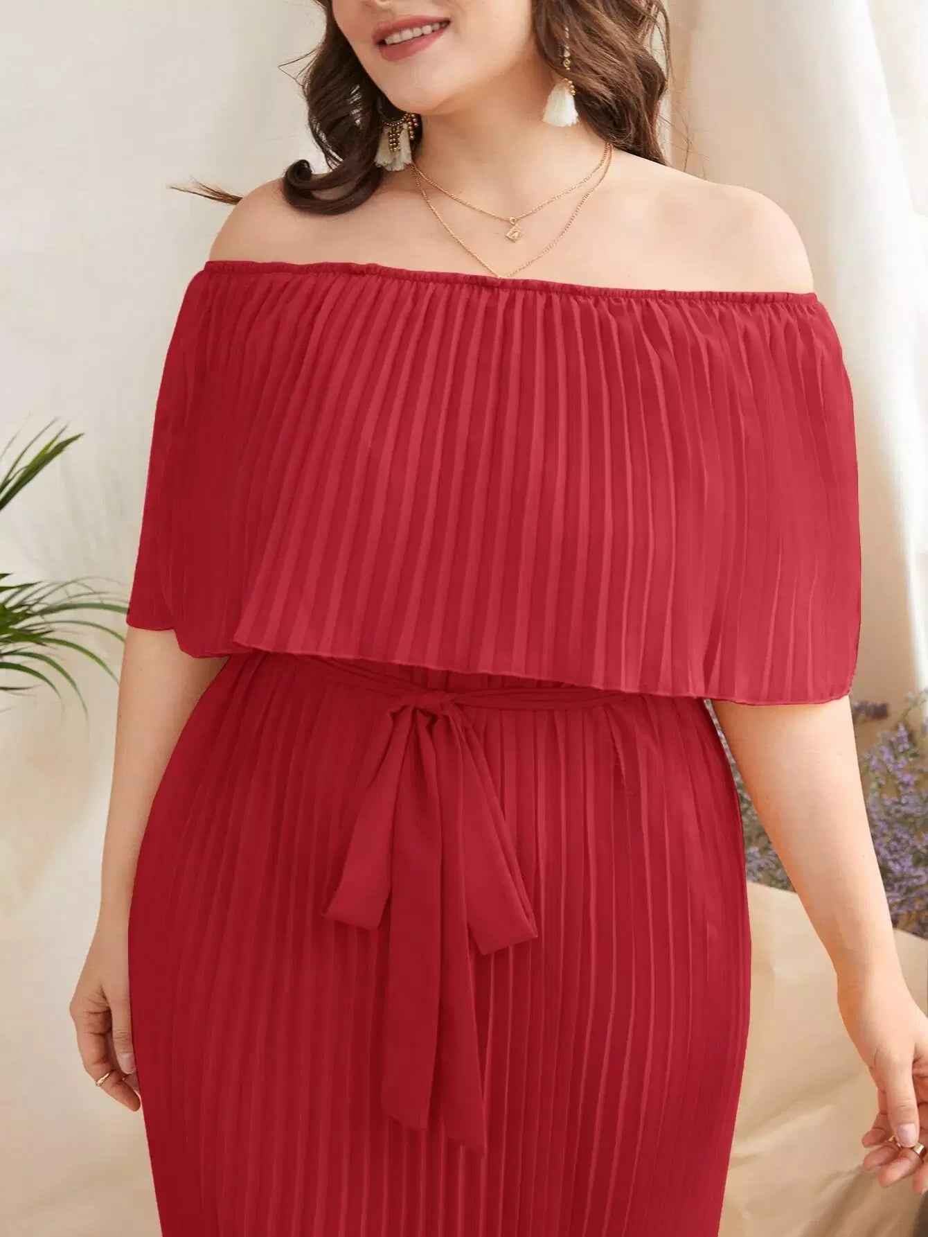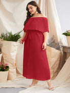 Plus Off-shoulder Pleated Dress Without Belt