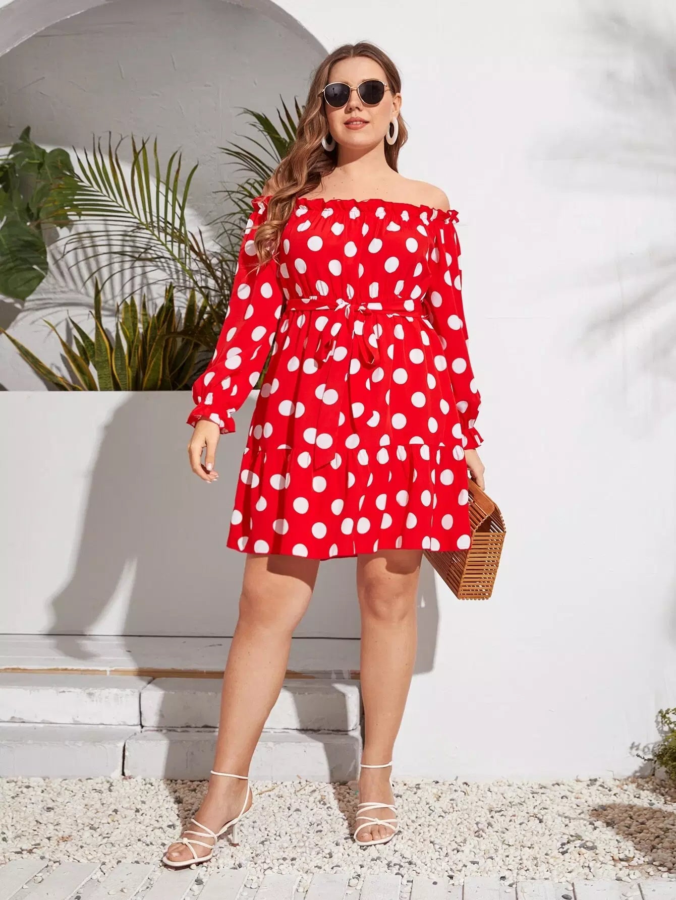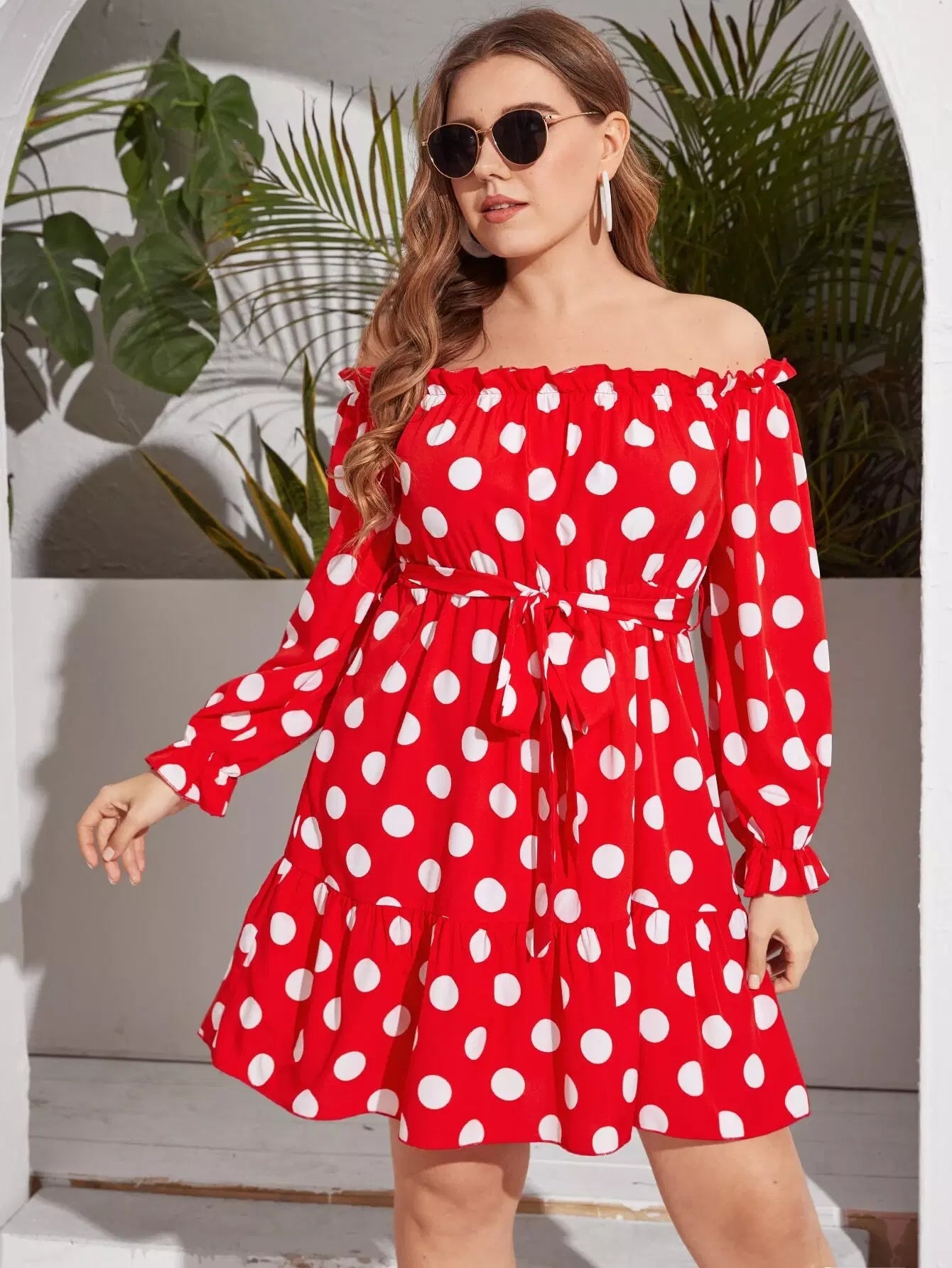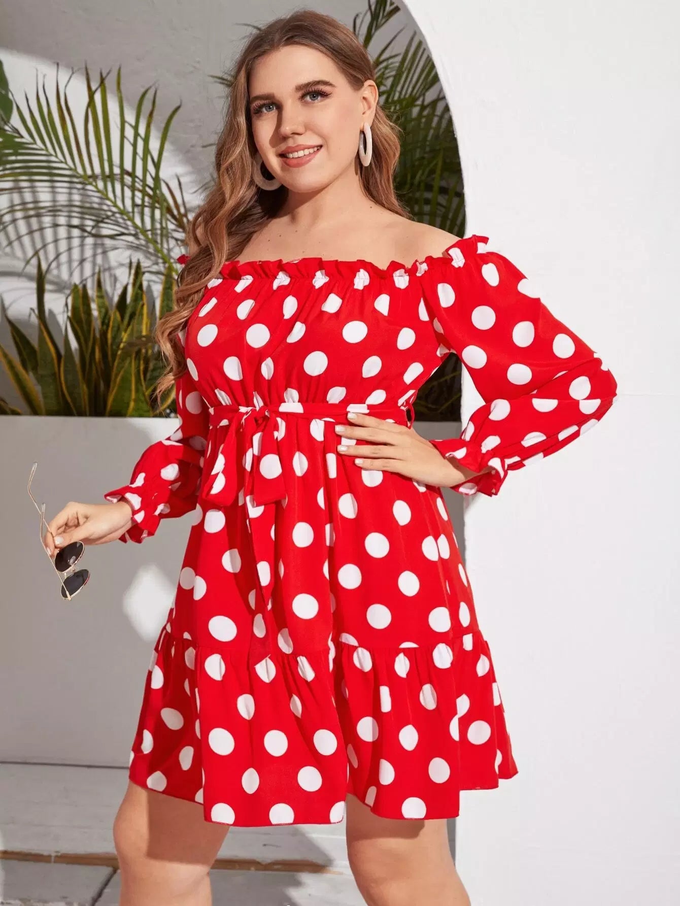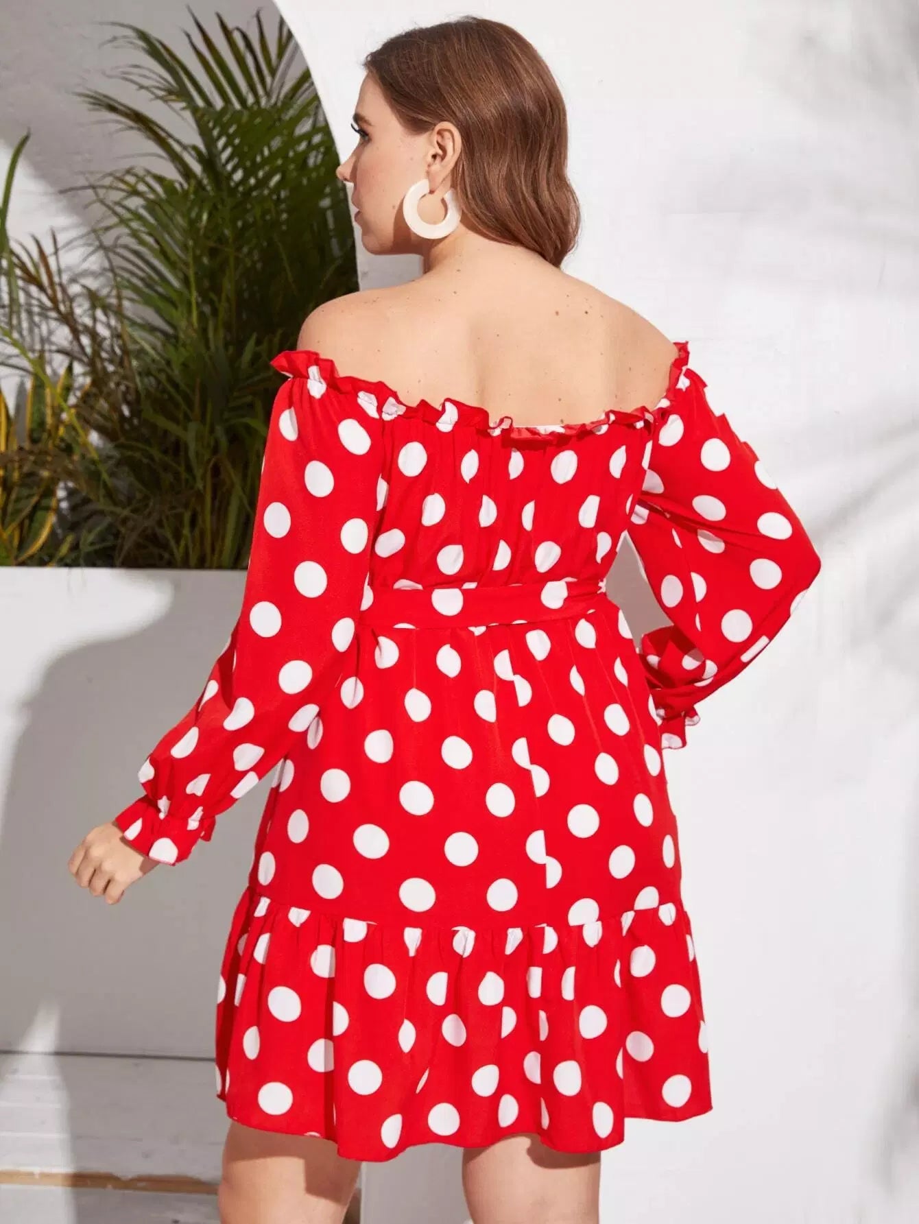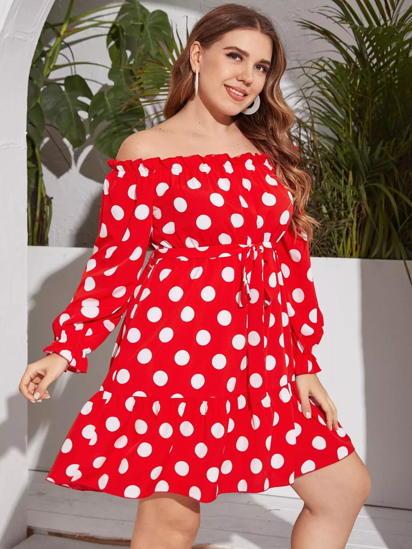Plus Off Shoulder Polka Dot Dress Without Belt