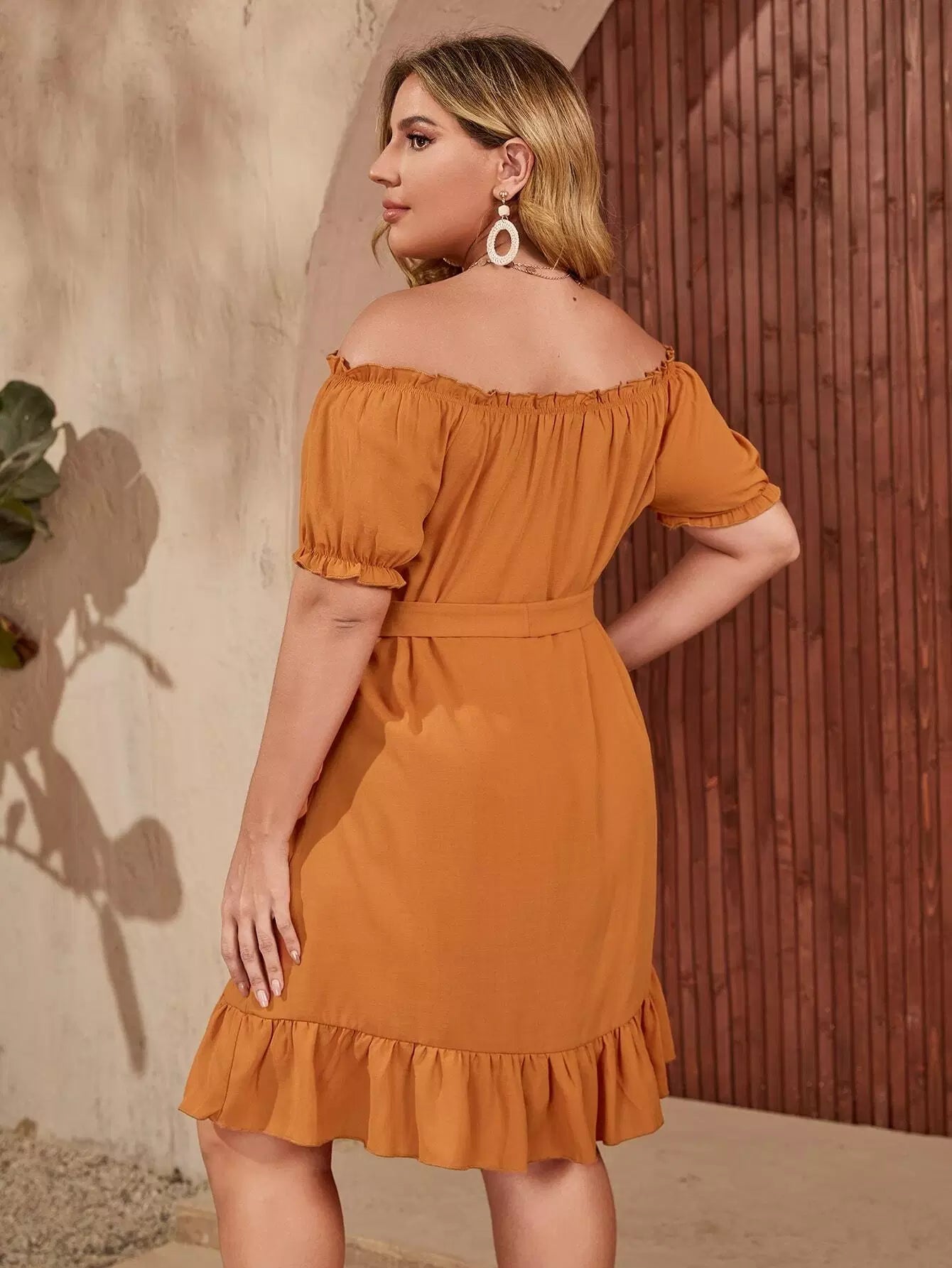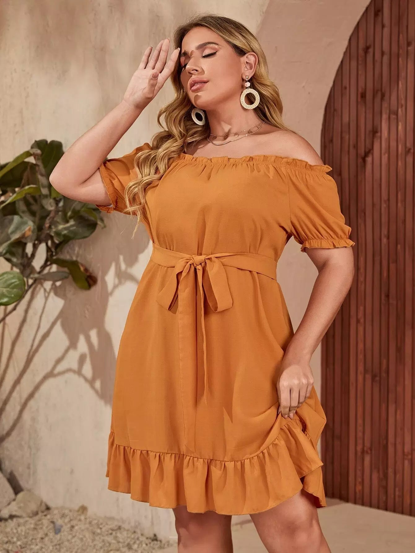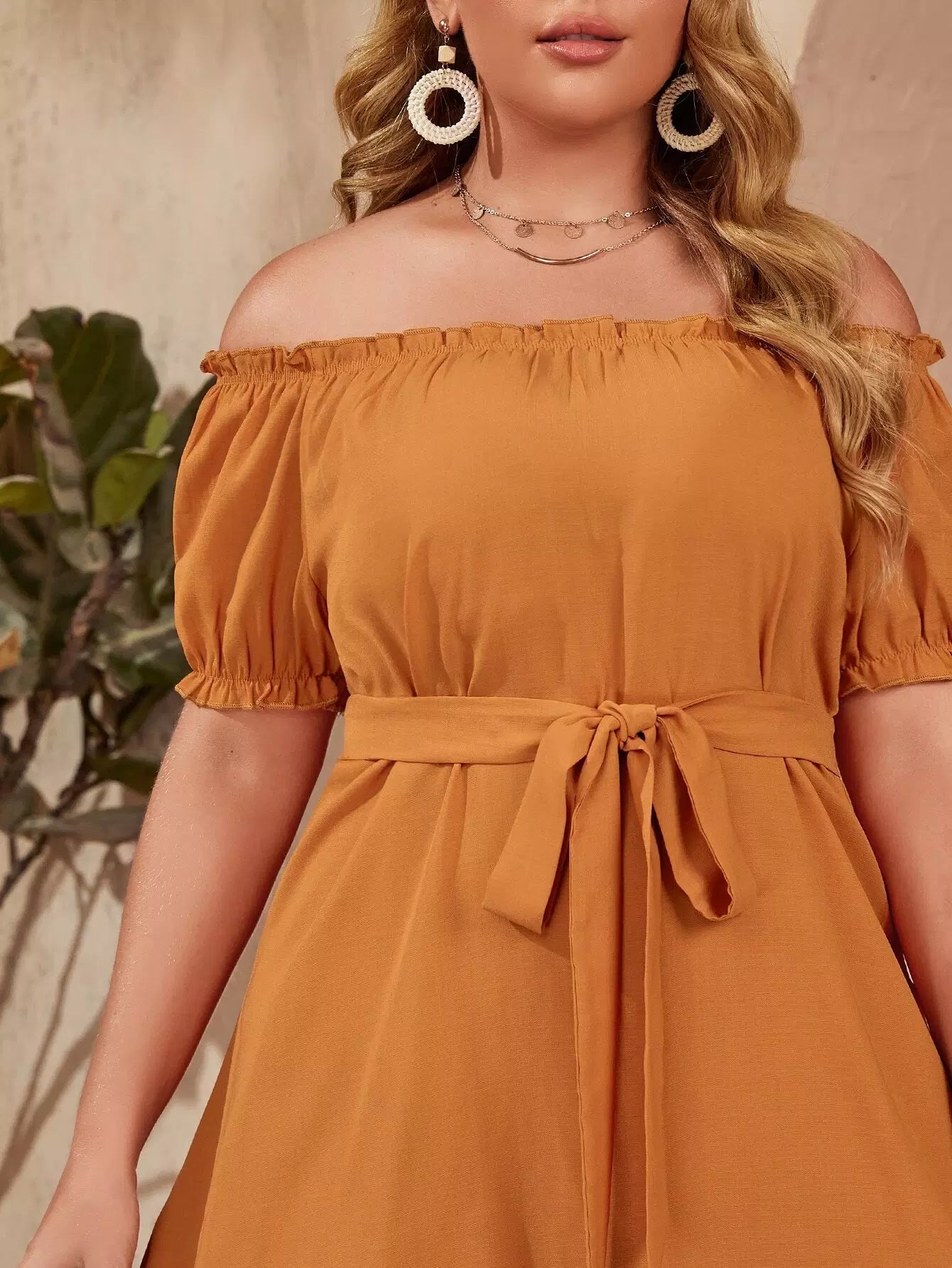 Plus Off Shoulder Puff Sleeve Ruffle Hem Dress Without Belt