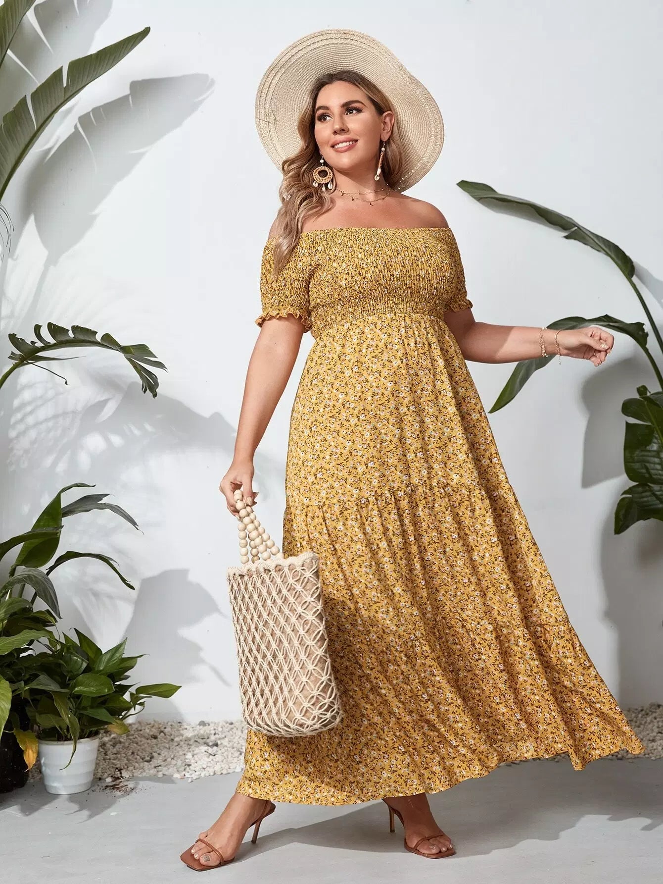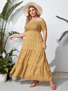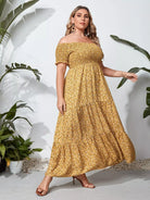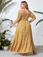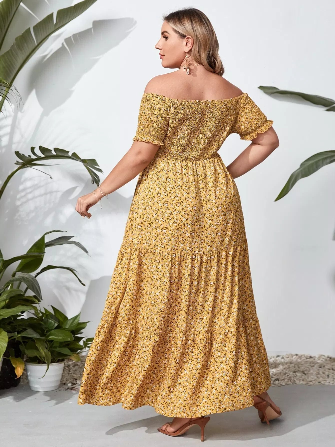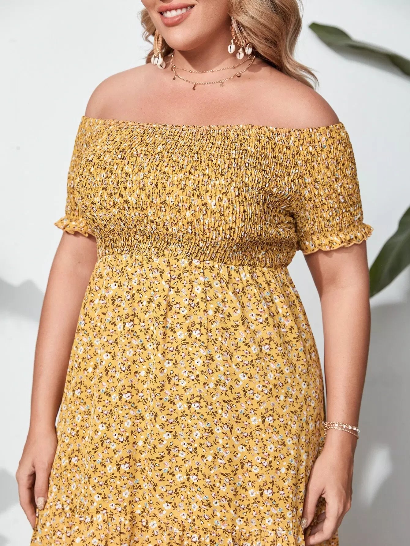 Plus Off Shoulder Shirred Waist Ditsy Floral Dress