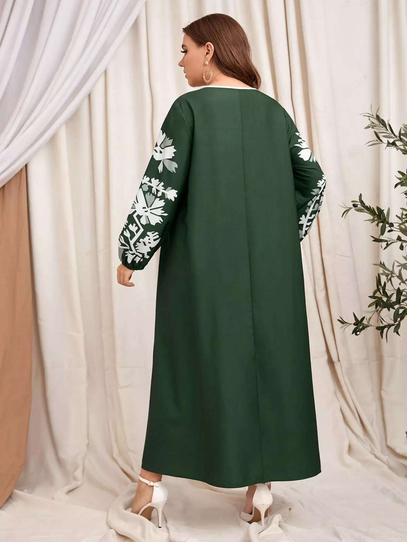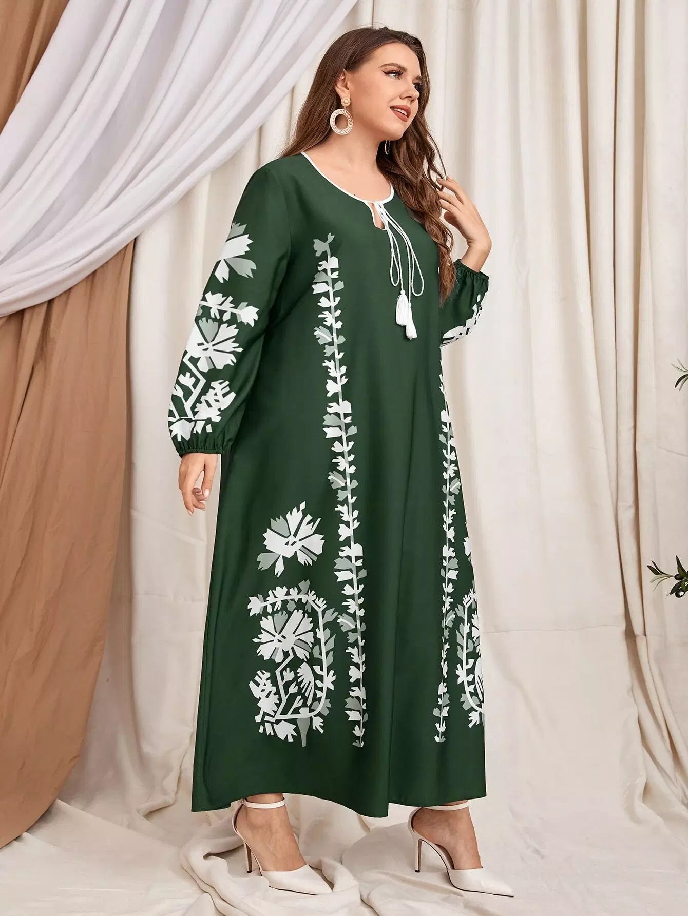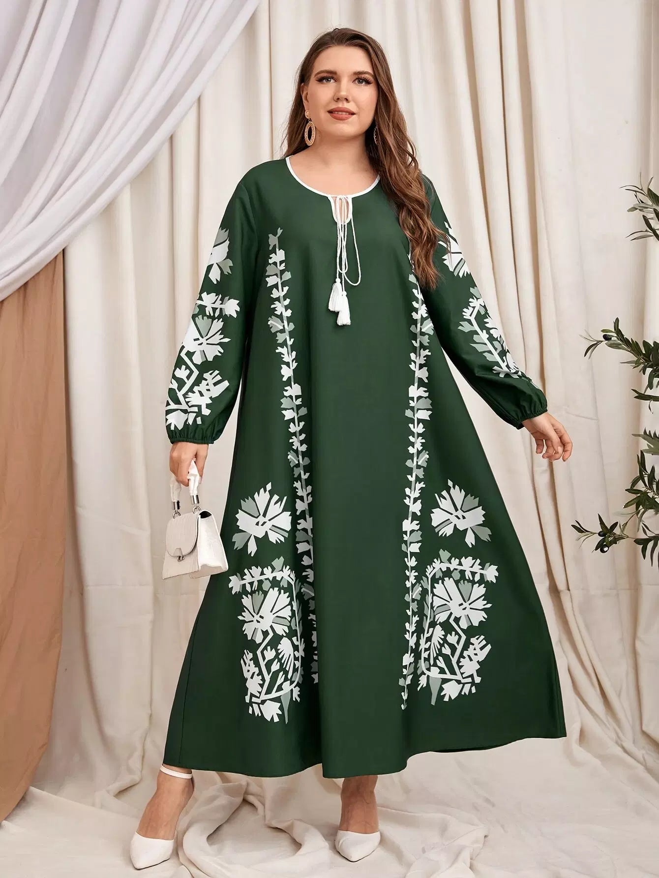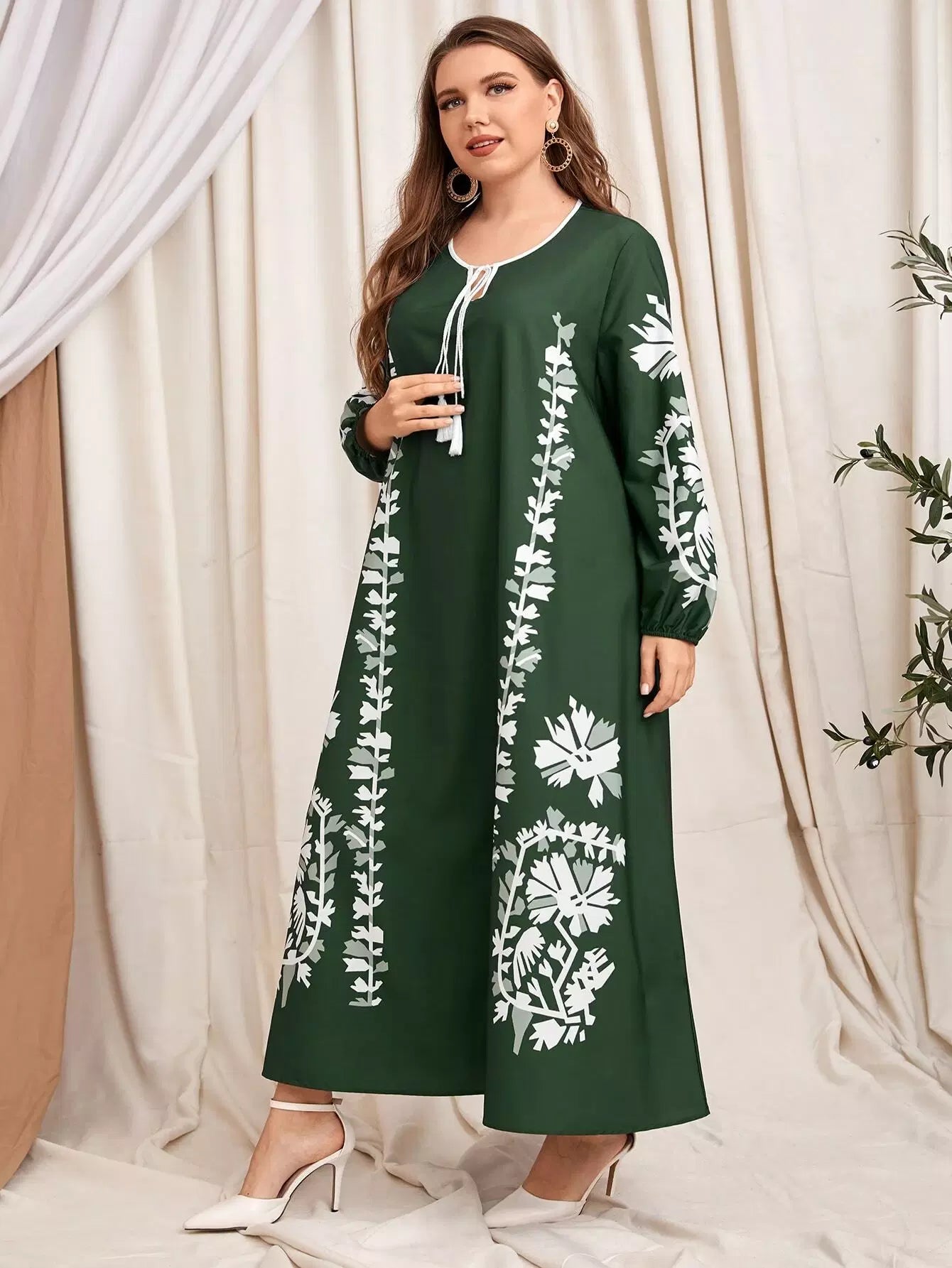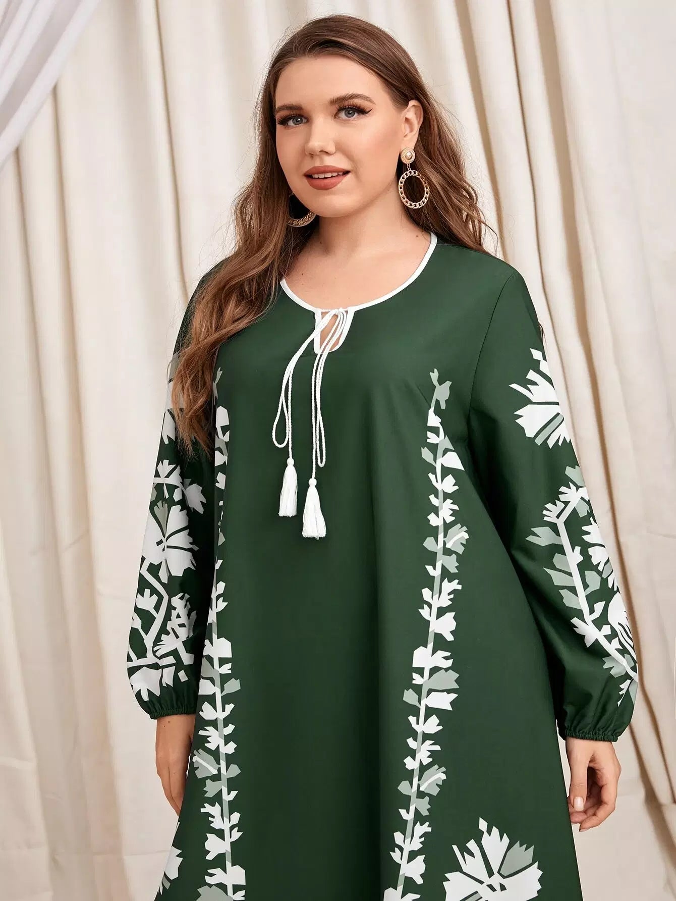 Plus Plants Print Tassel Tie Neck Tunic Dress