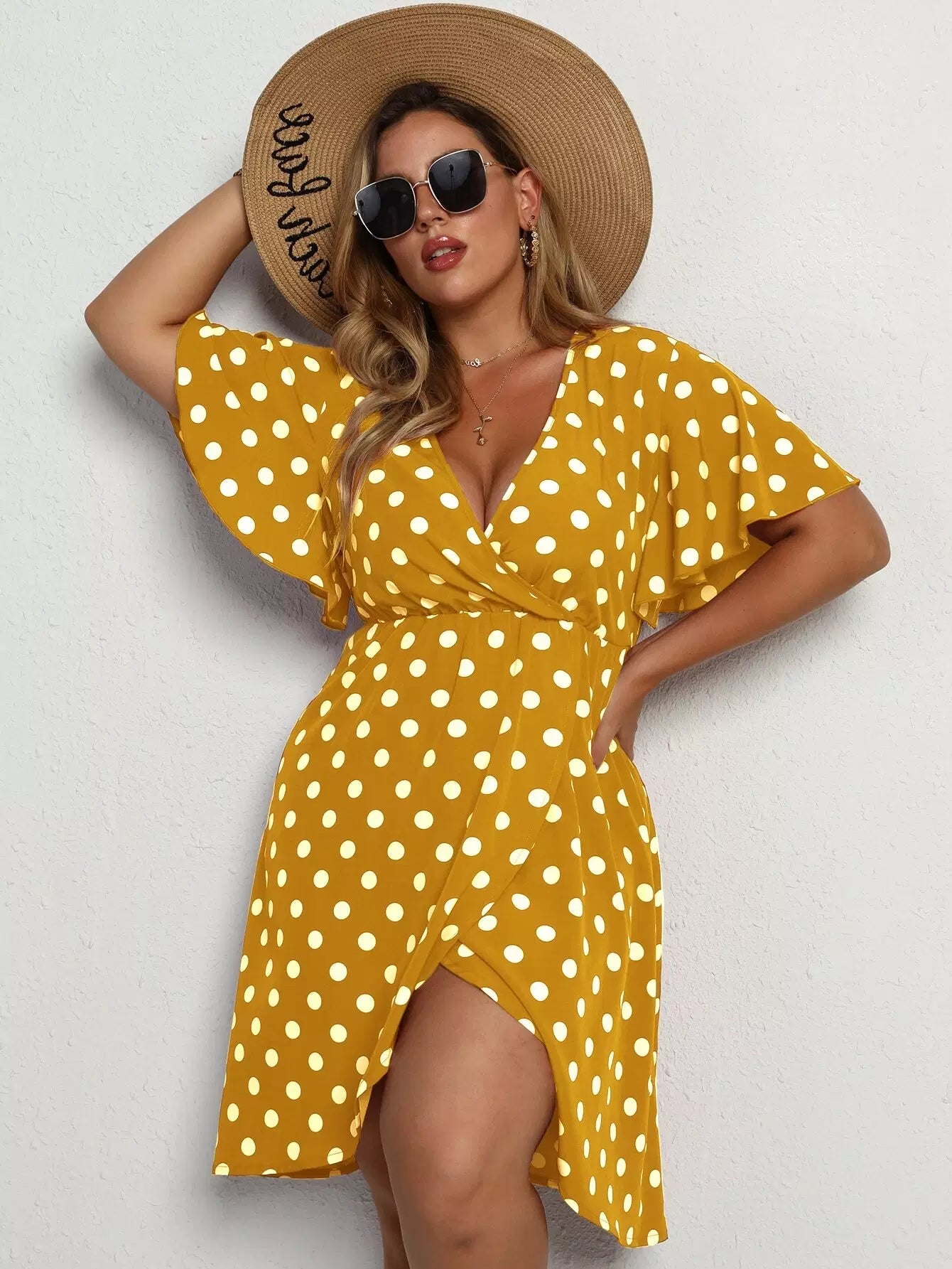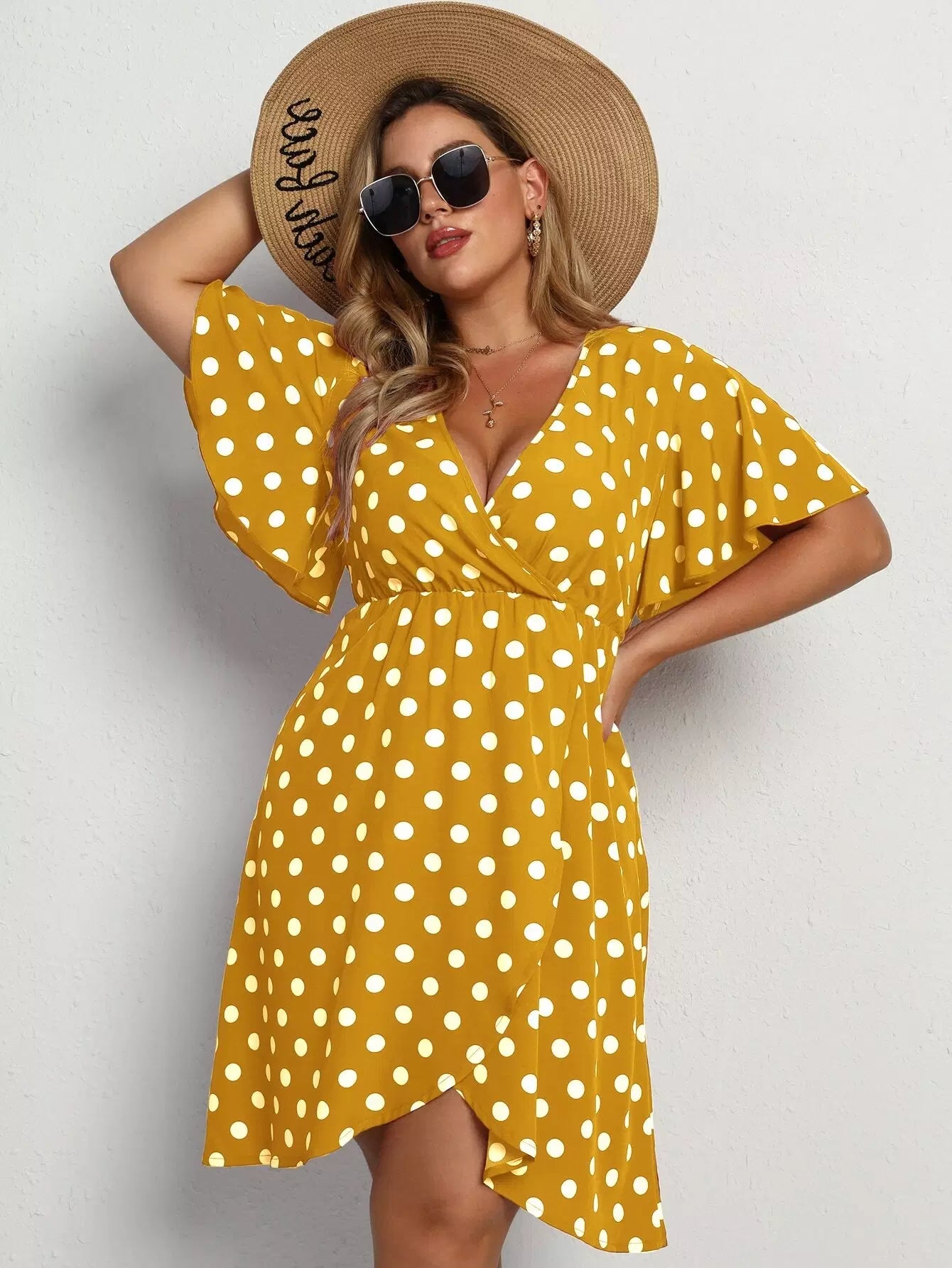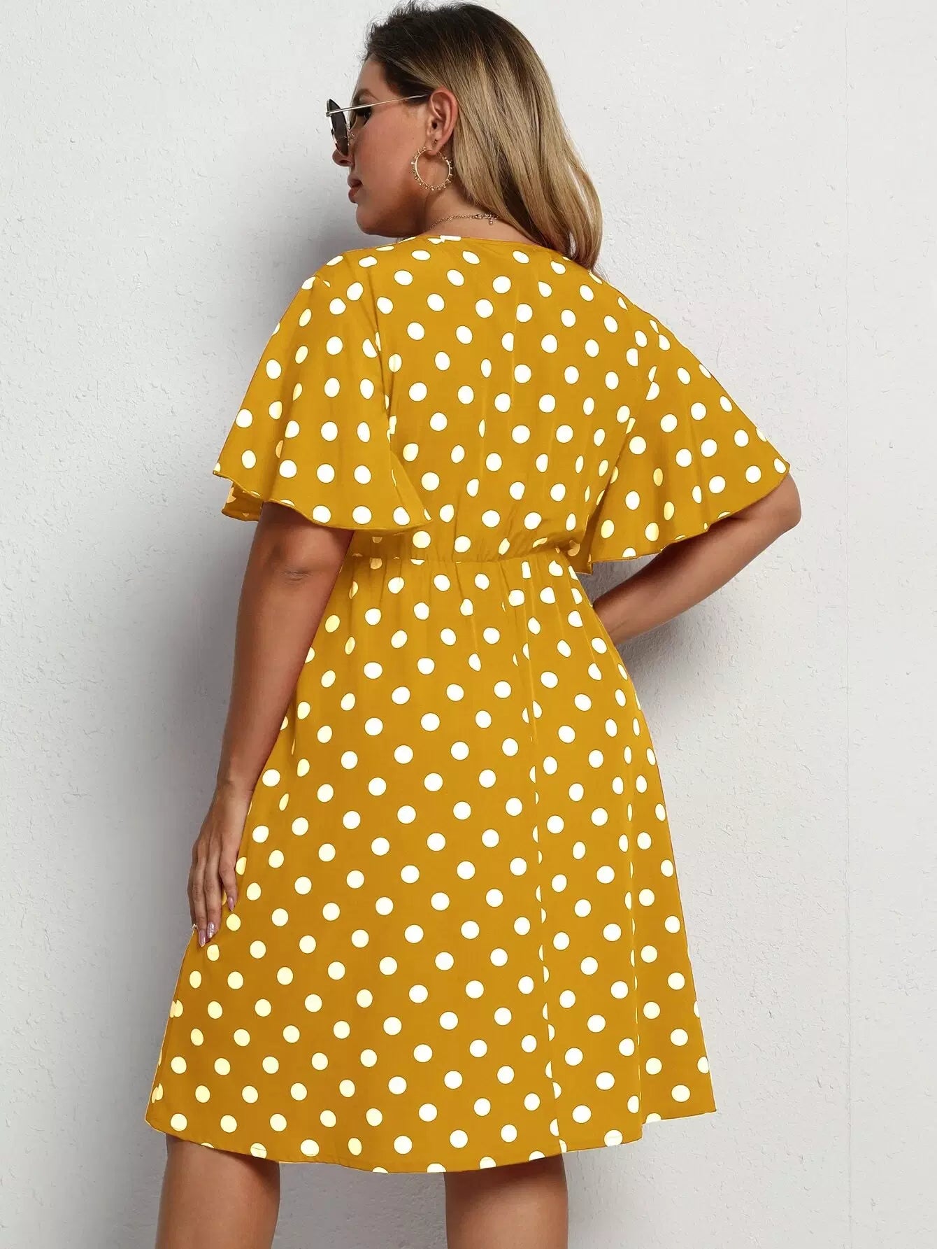 Plus Polka Dot Butterfly Sleeve Plunging Neck Dress