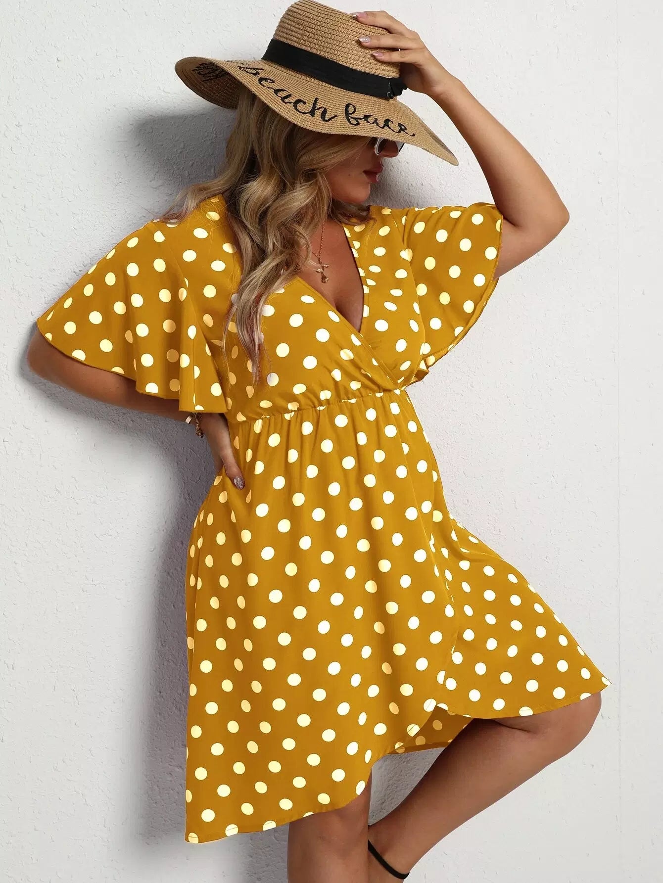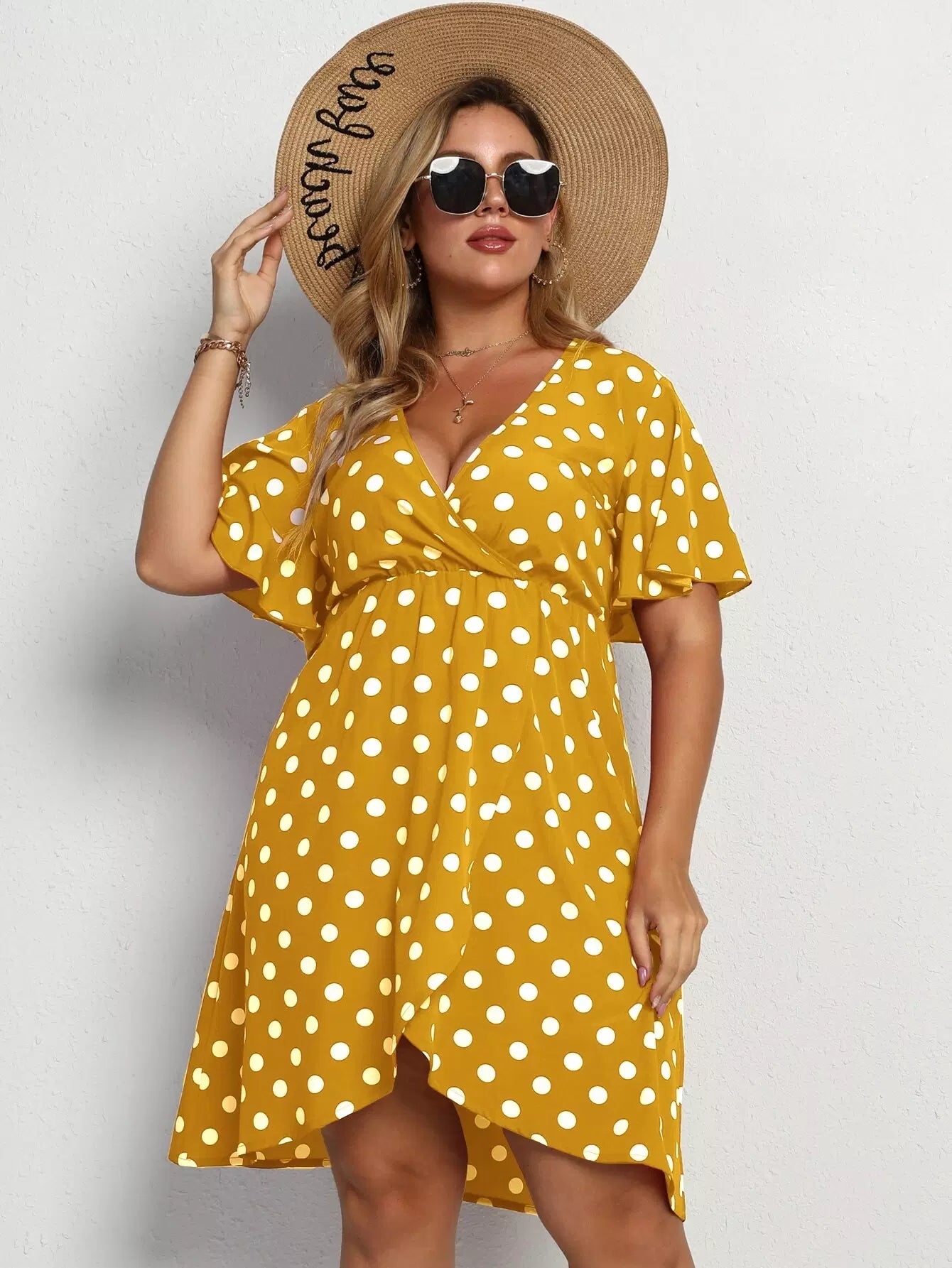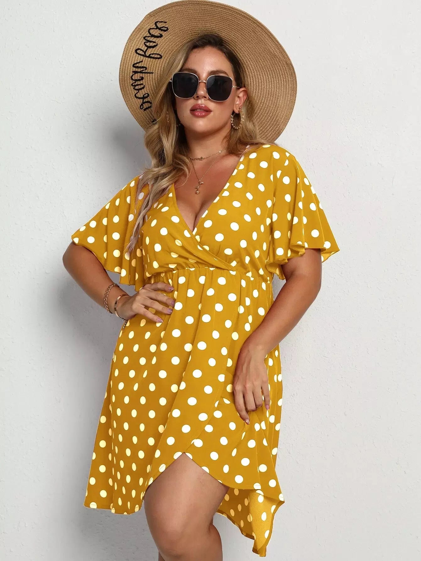 Plus Polka Dot Butterfly Sleeve Plunging Neck Dress