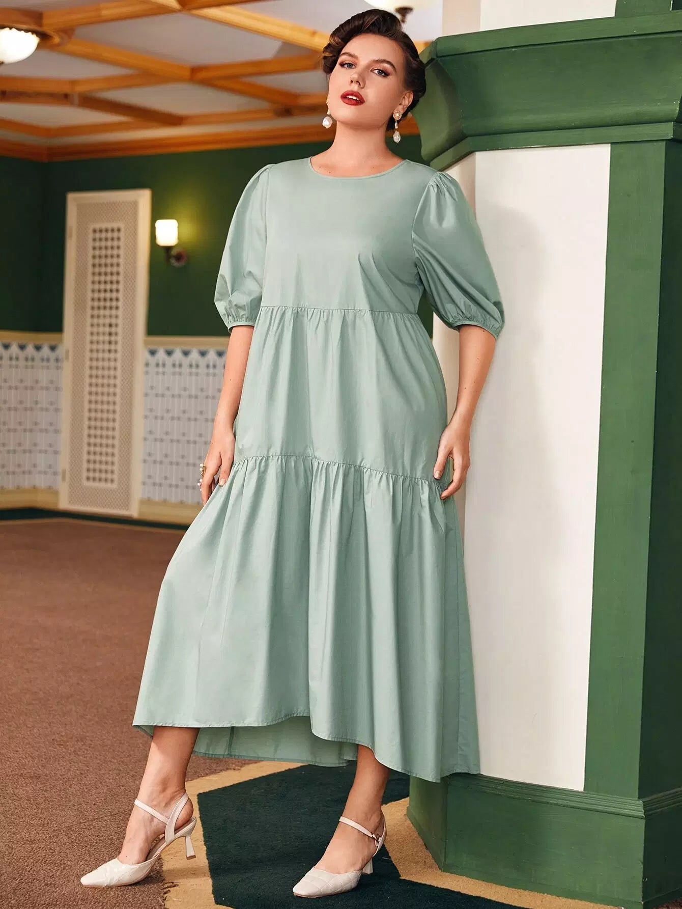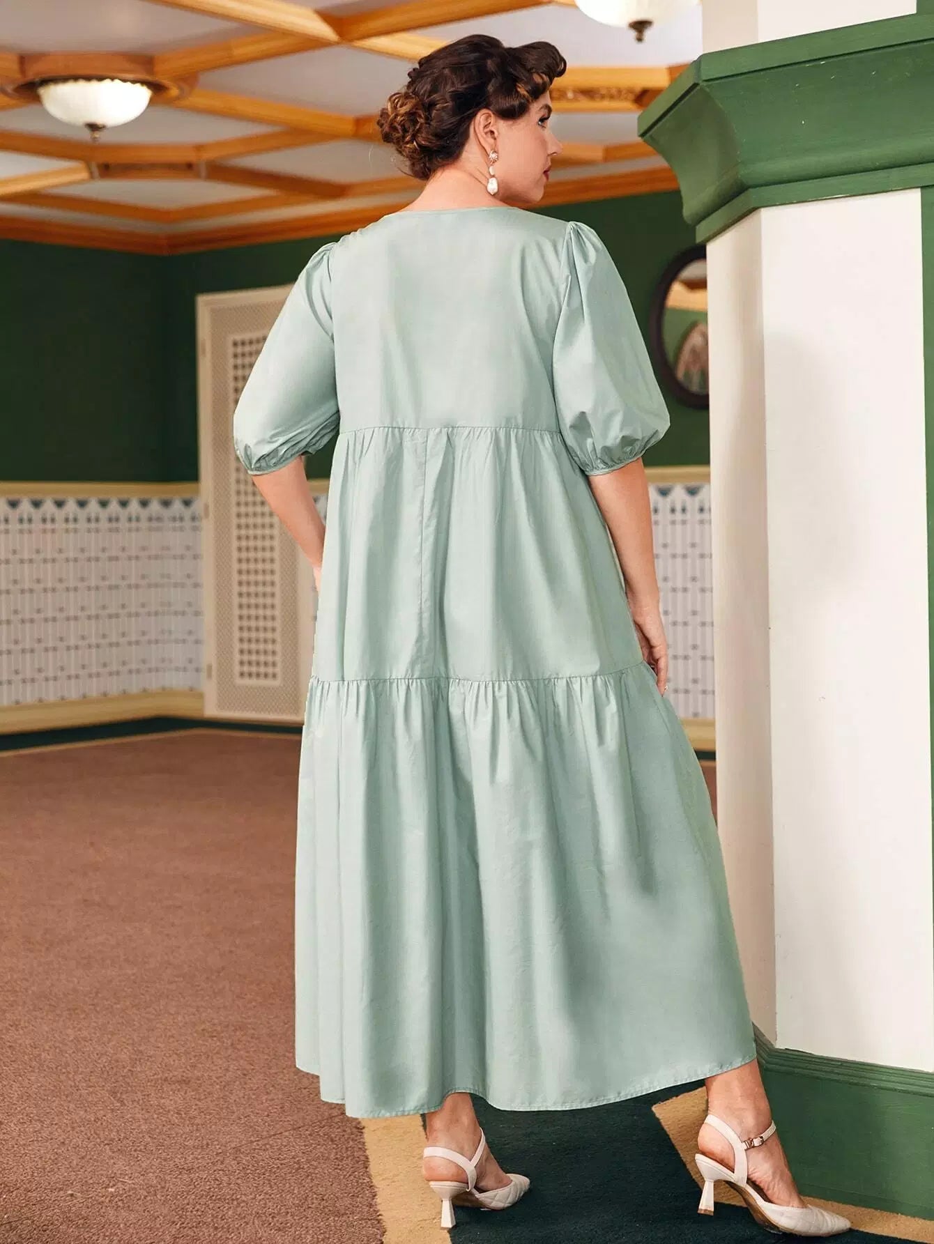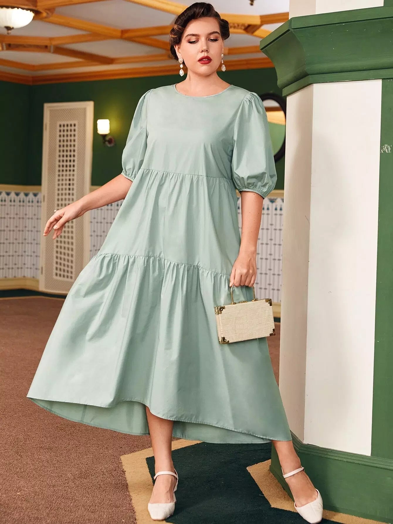 Plus Puff Sleeve Ruffle Hem Smock Dress