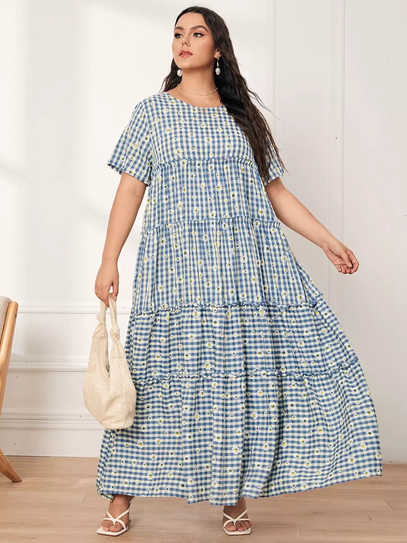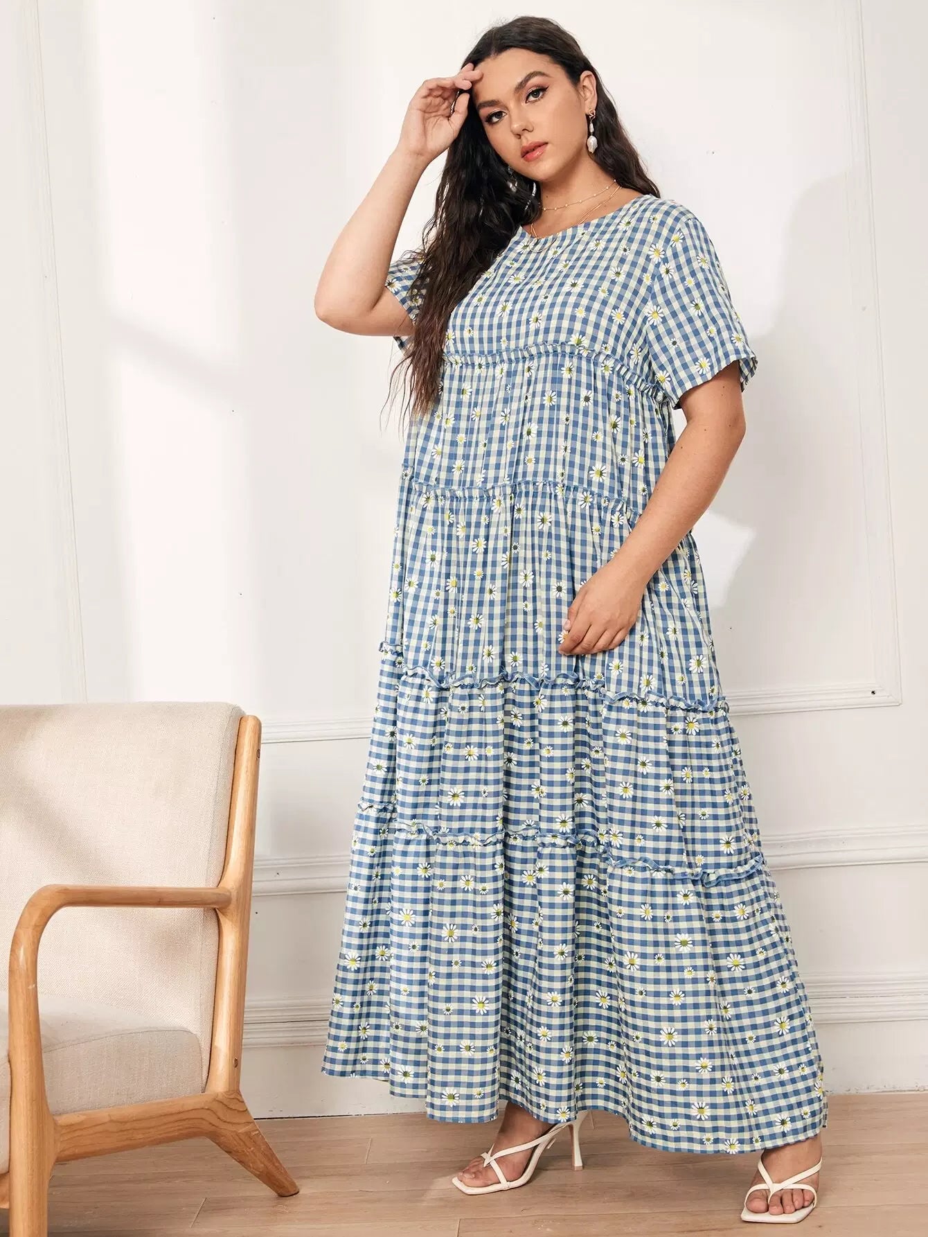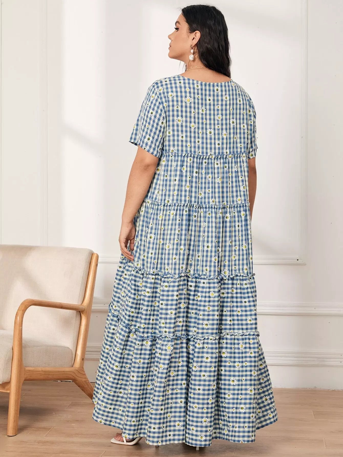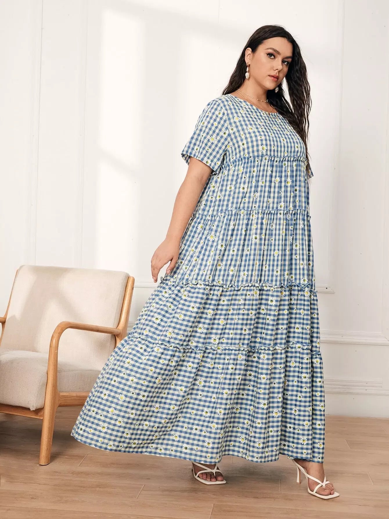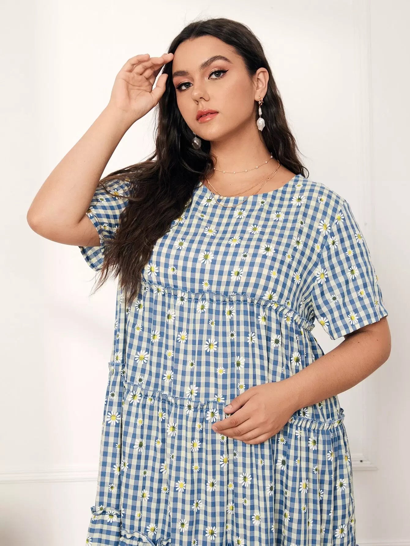 Plus Ruffle Hem Gingham & Daisy Floral Smock Dress
