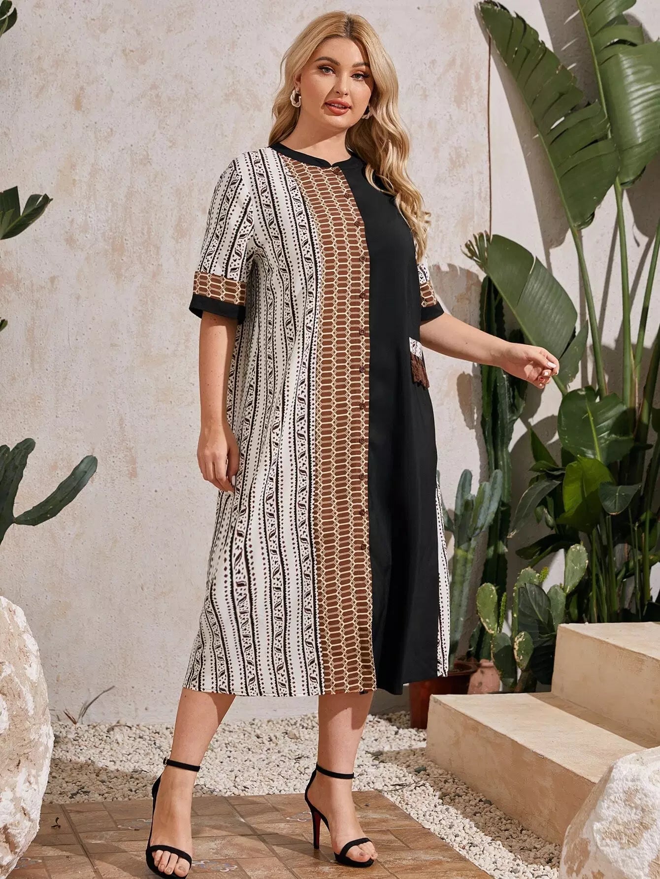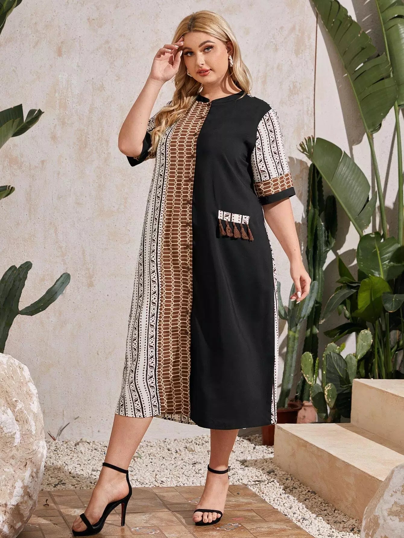 Women - Plus Single Breasted Fringe Detail Geo and Graphic Print Dress