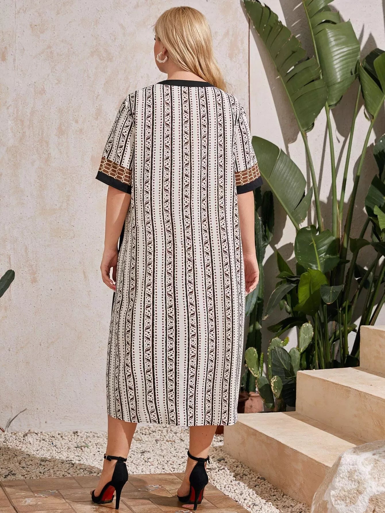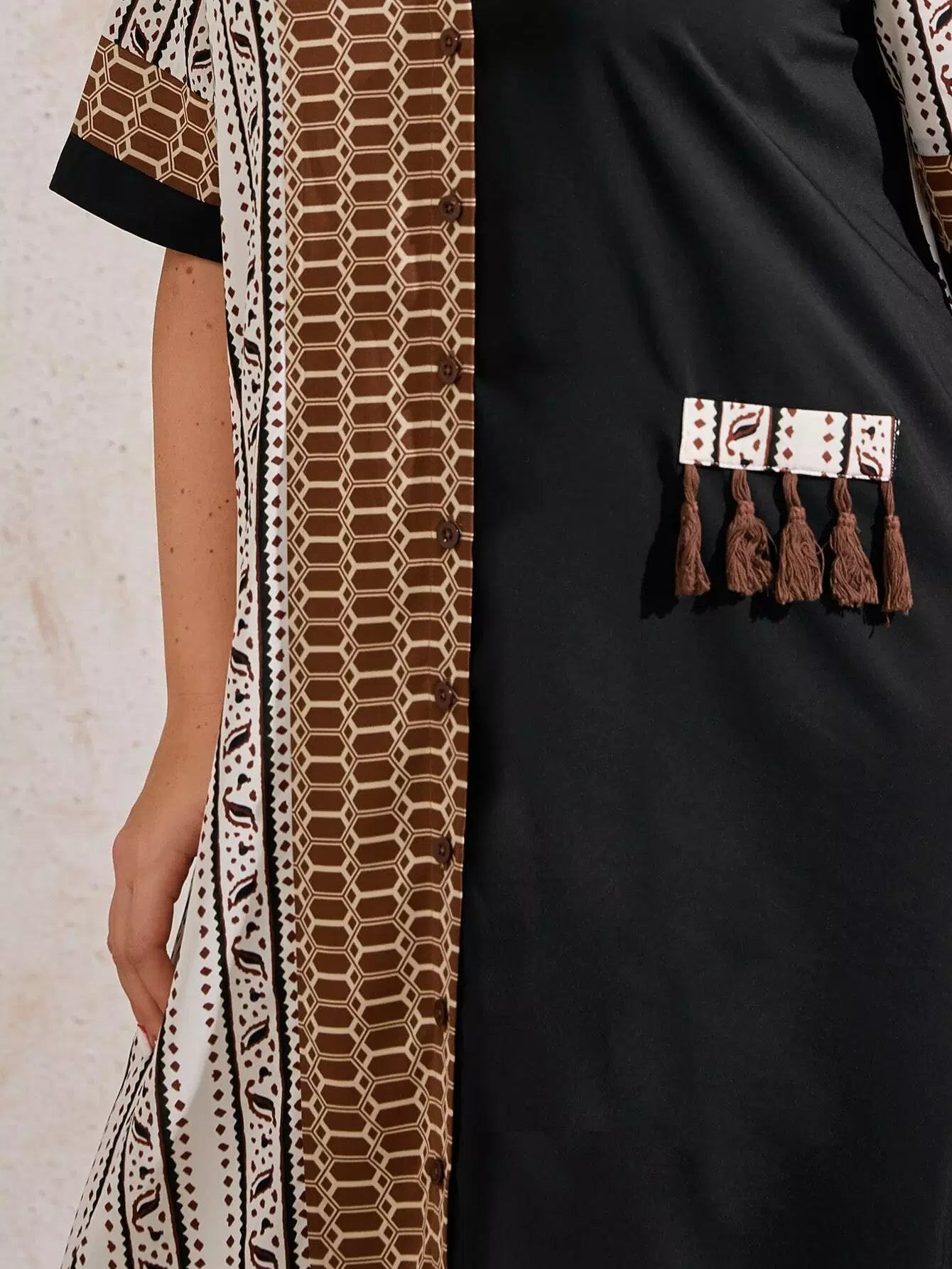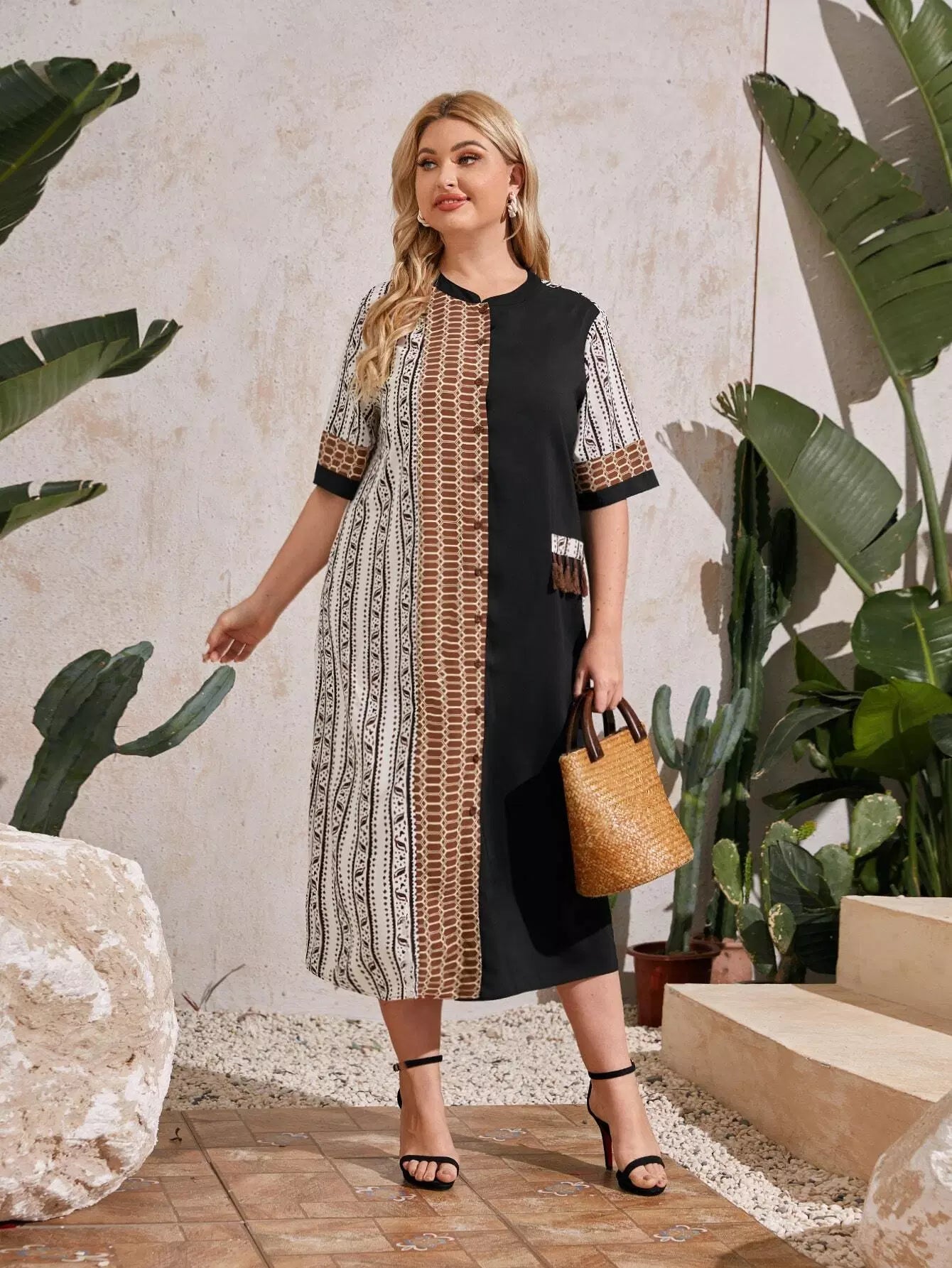 Plus Single Breasted Fringe Detail Geo and Graphic Print Dress