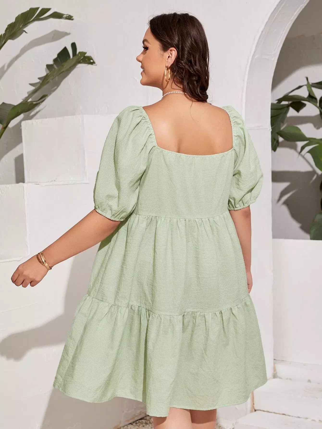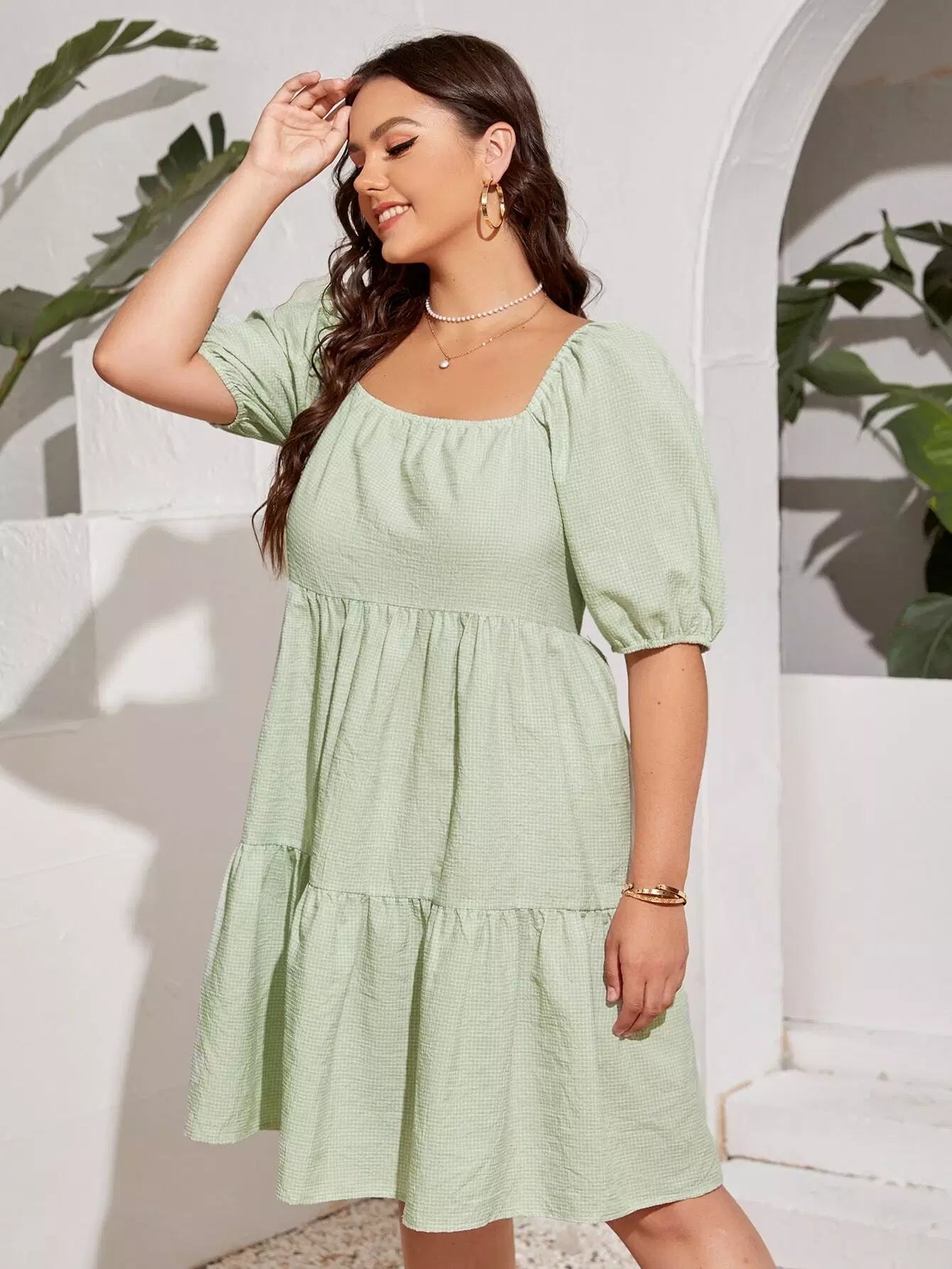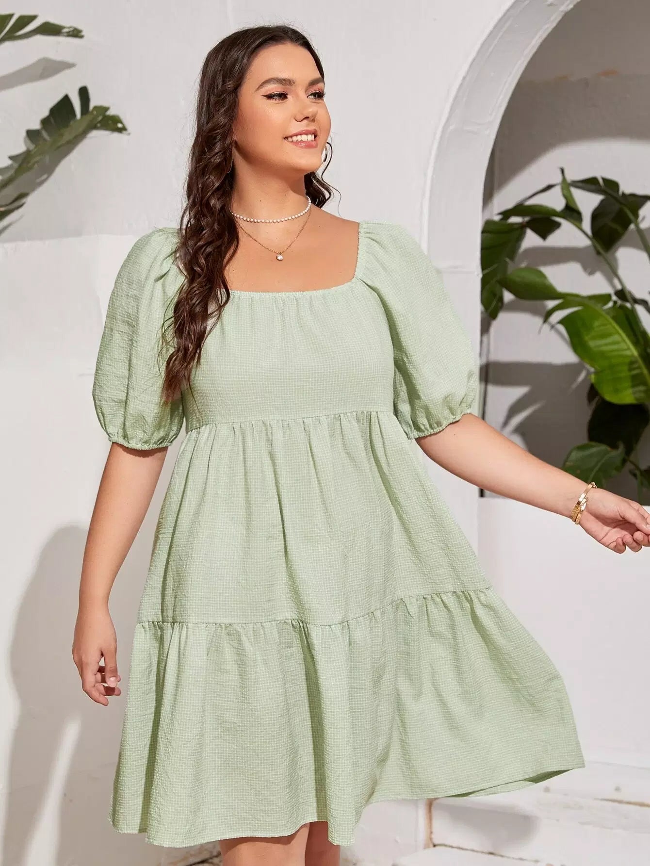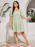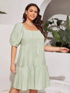 Plus Solid Square Neck Puff Sleeve Smock Dress