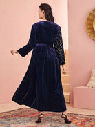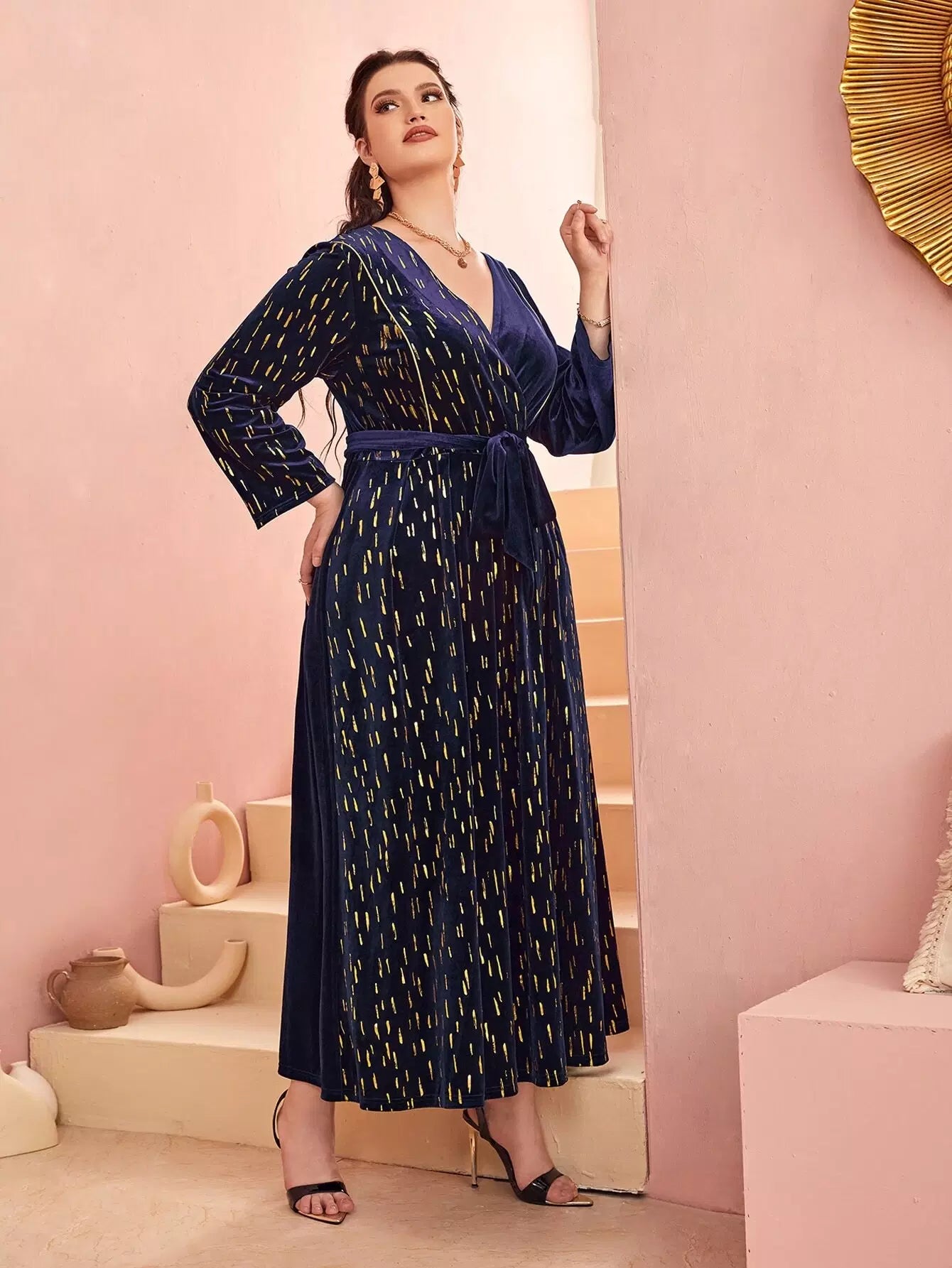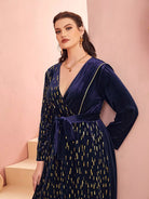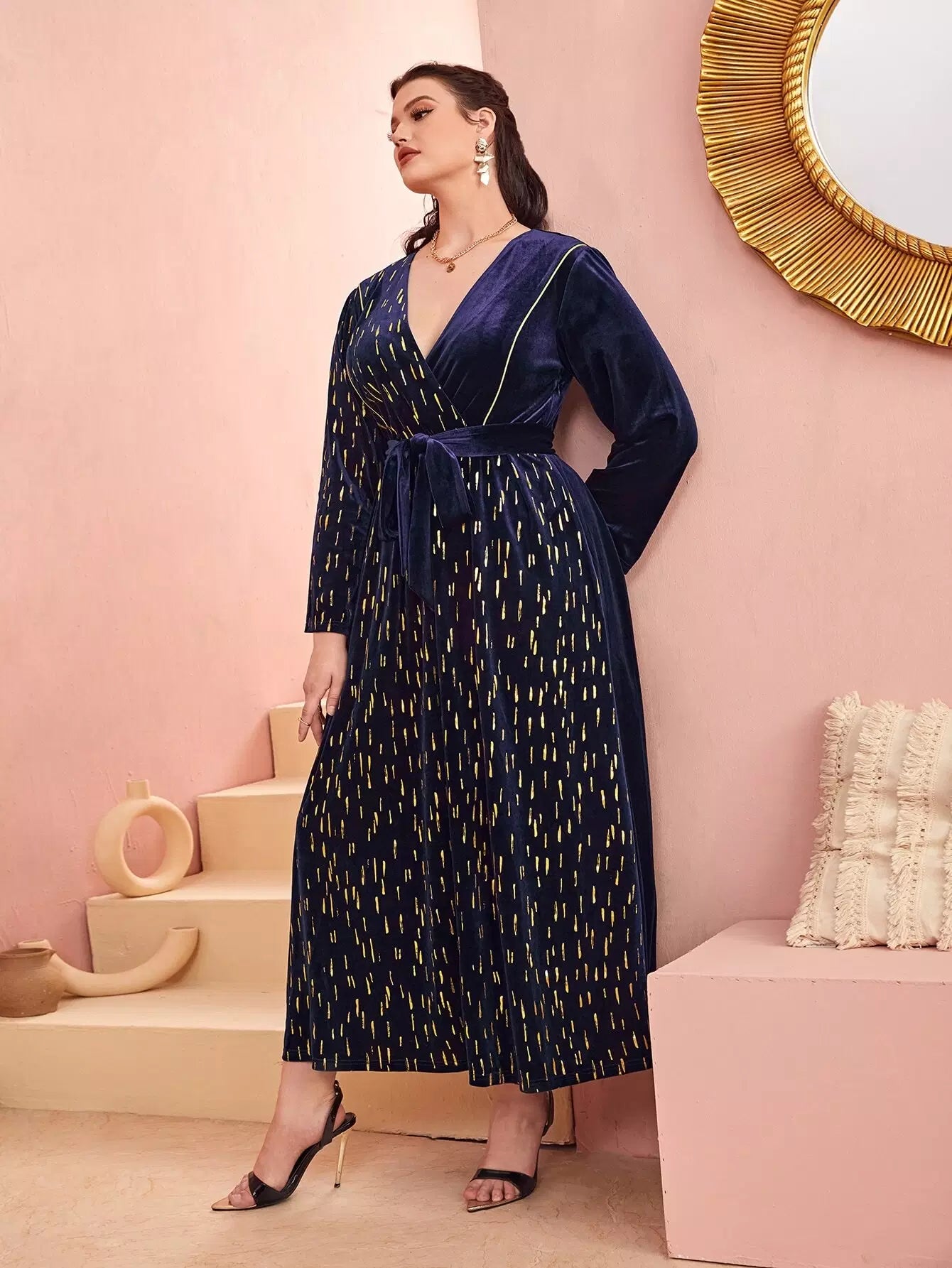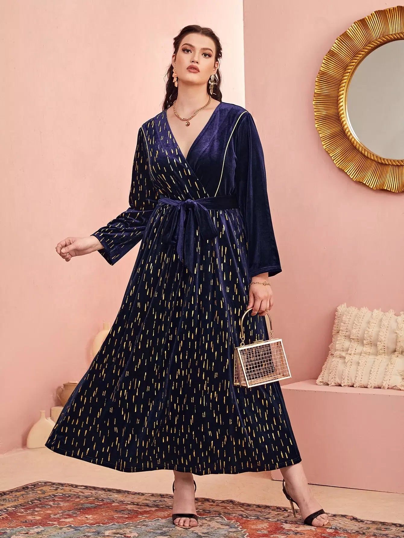 Plus Surplice Neck Graphic Print Velvet Dress Without Belt