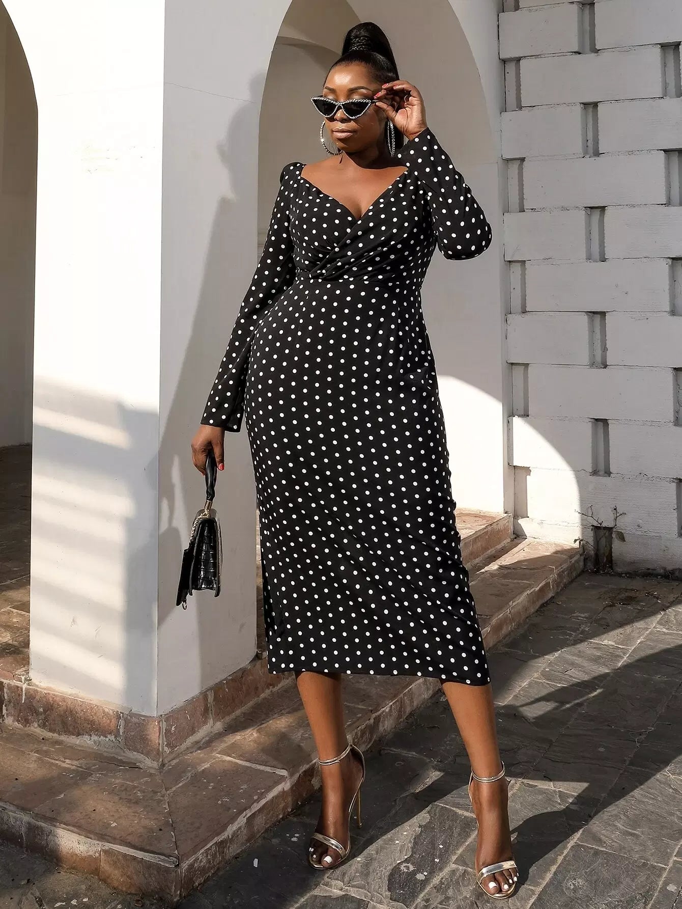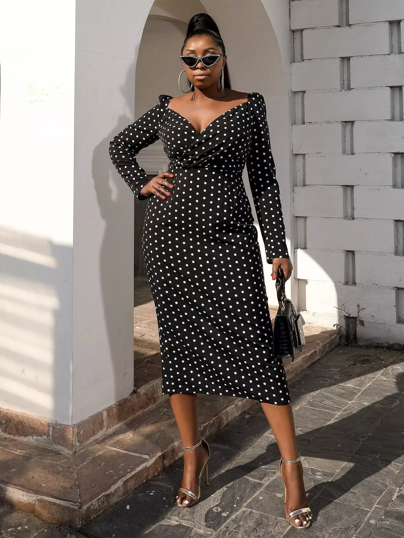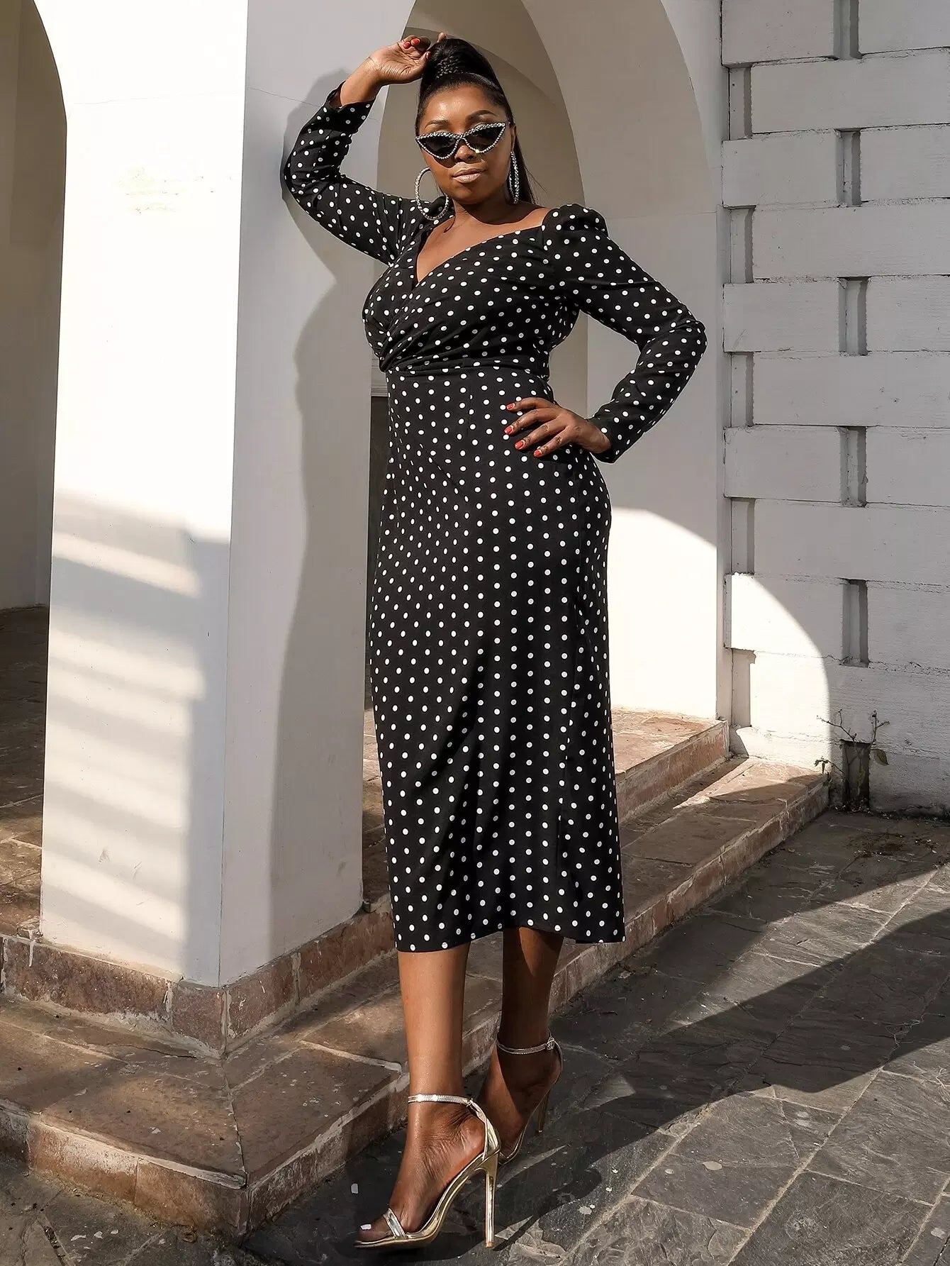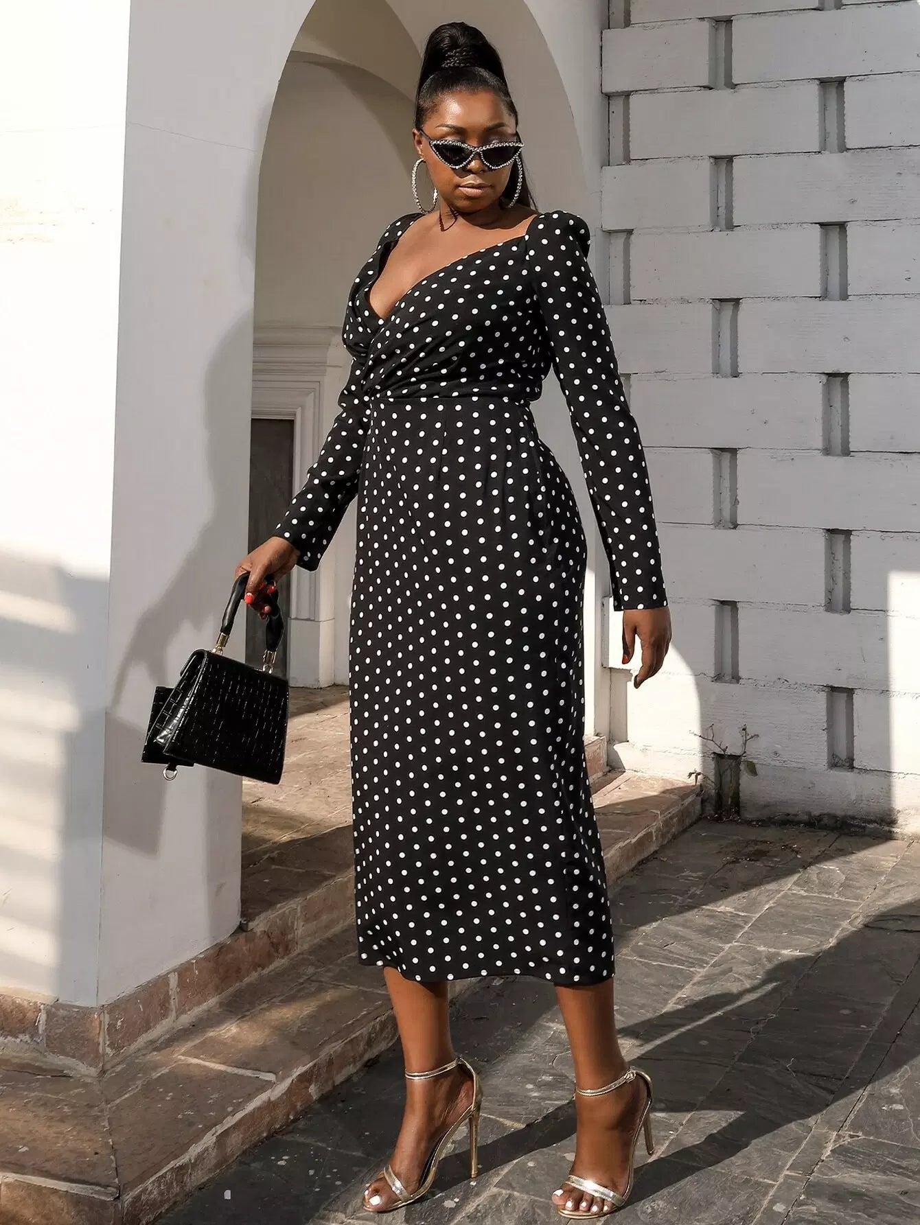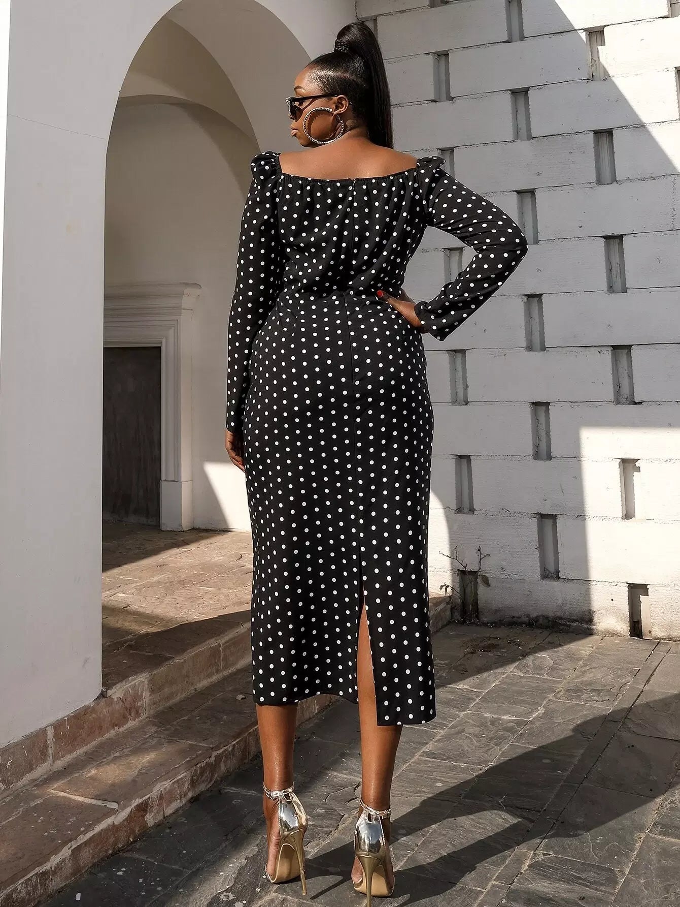 Plus Surplice Neck Split Hem Polka Dot Dress
