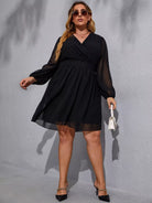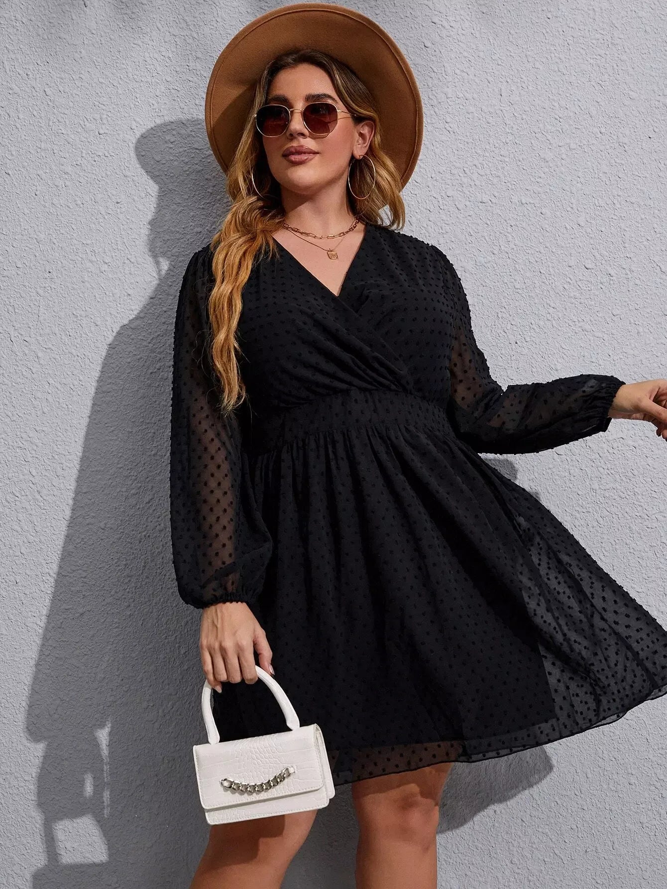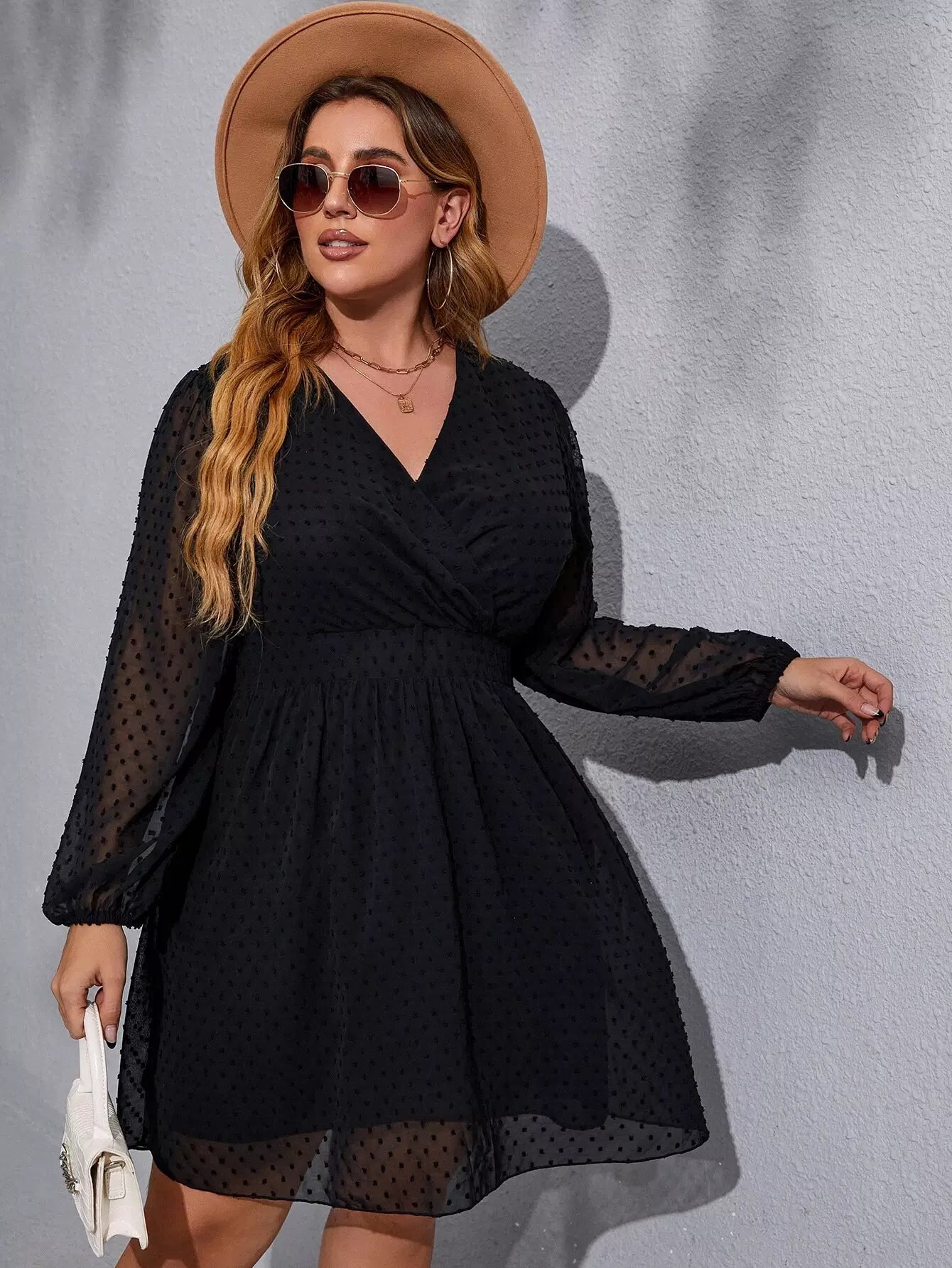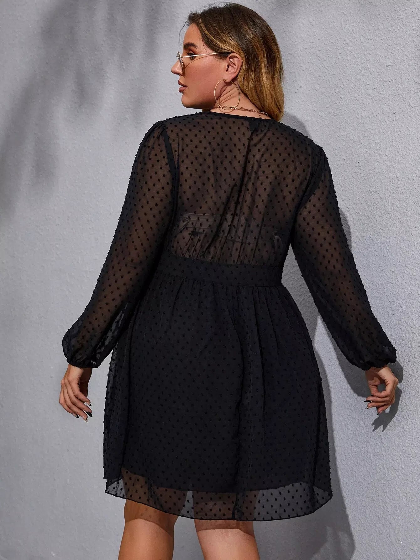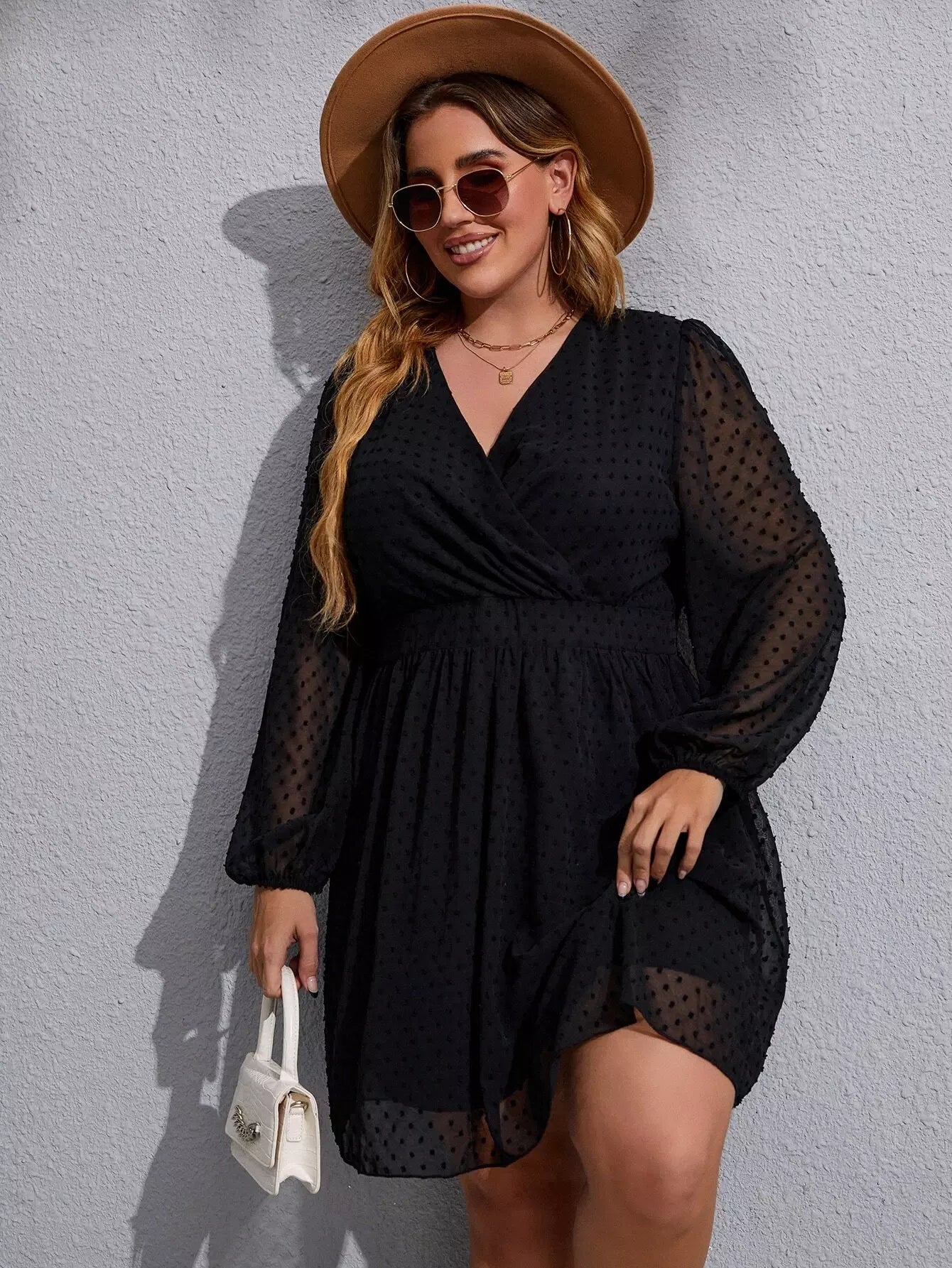 Plus Swiss Dot Overlap Collar Lantern Sleeve Dress
