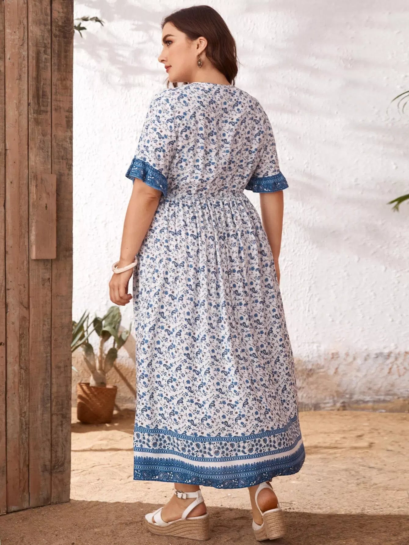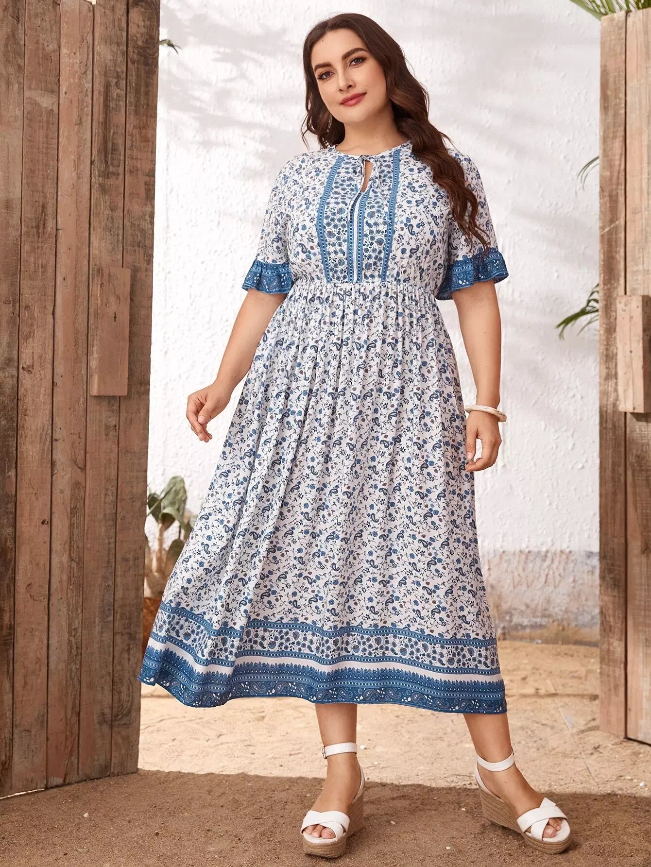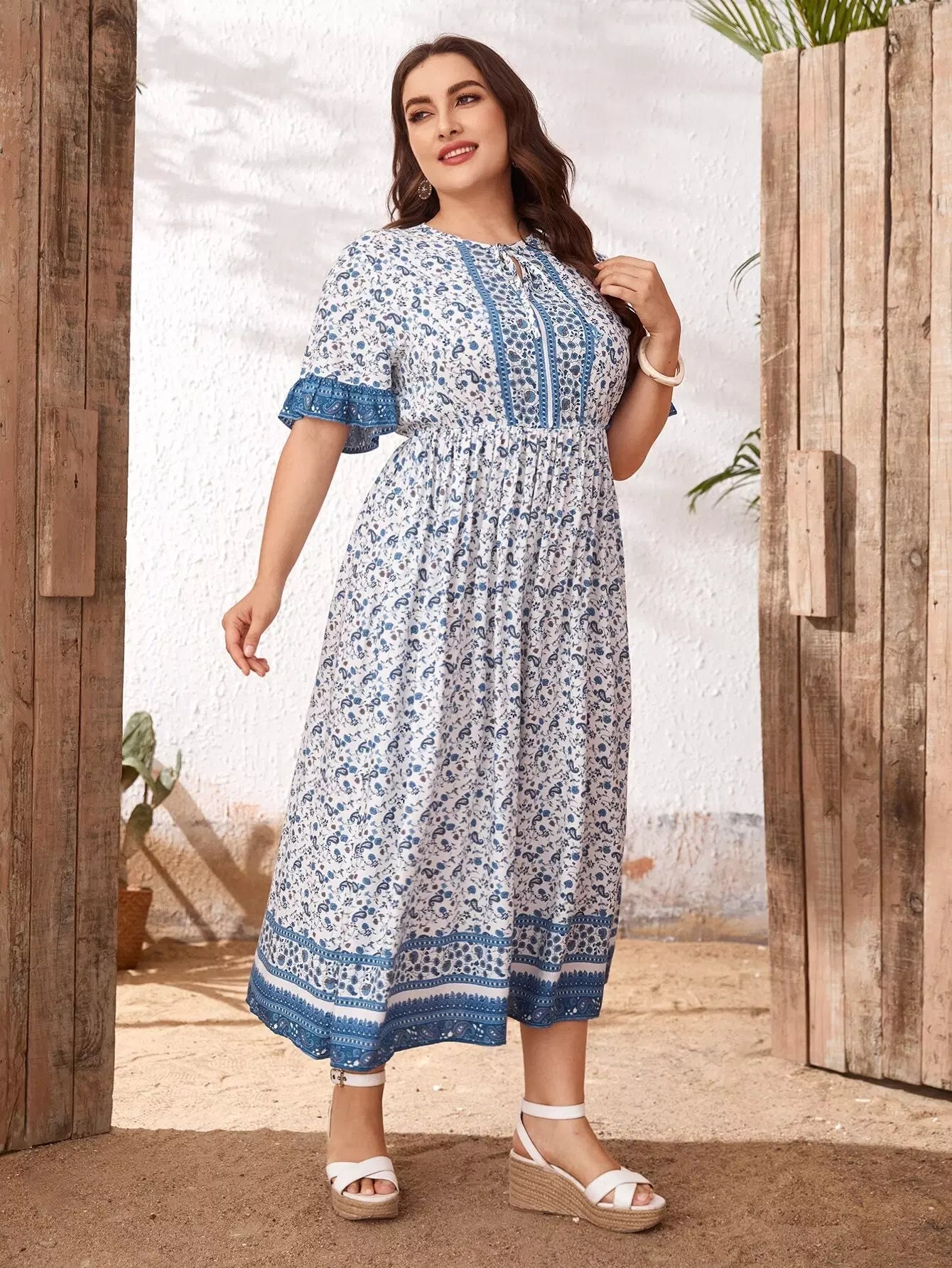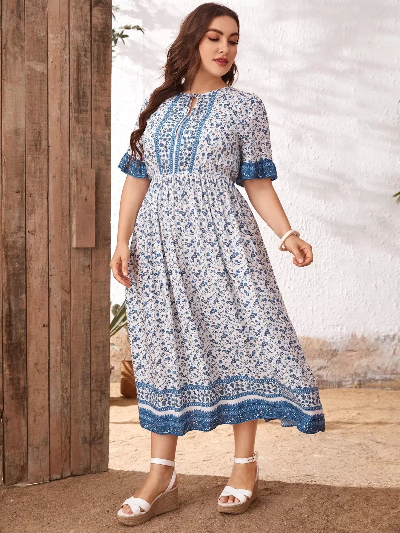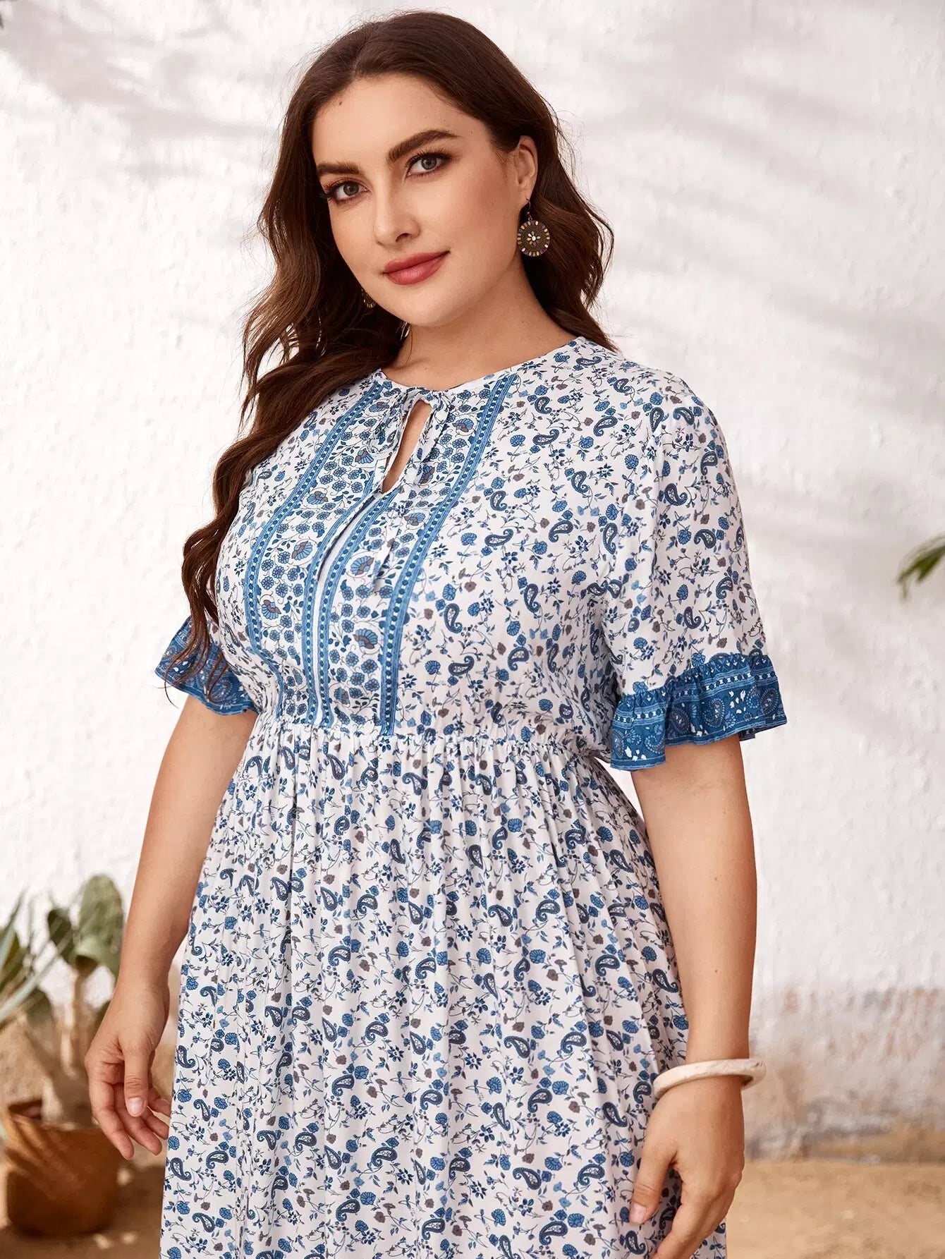 Plus Tie Neck Flounce Sleeve Floral Dress