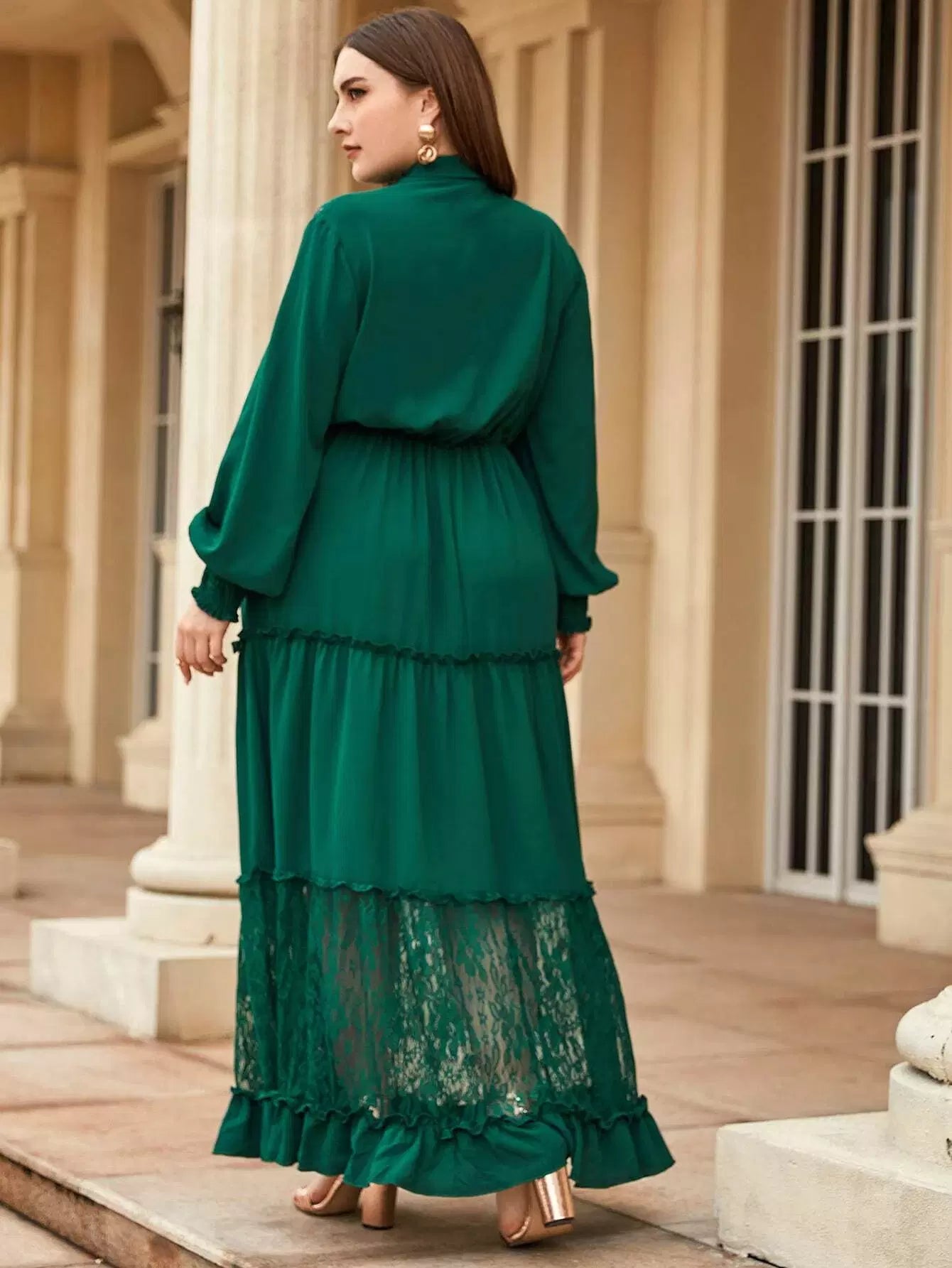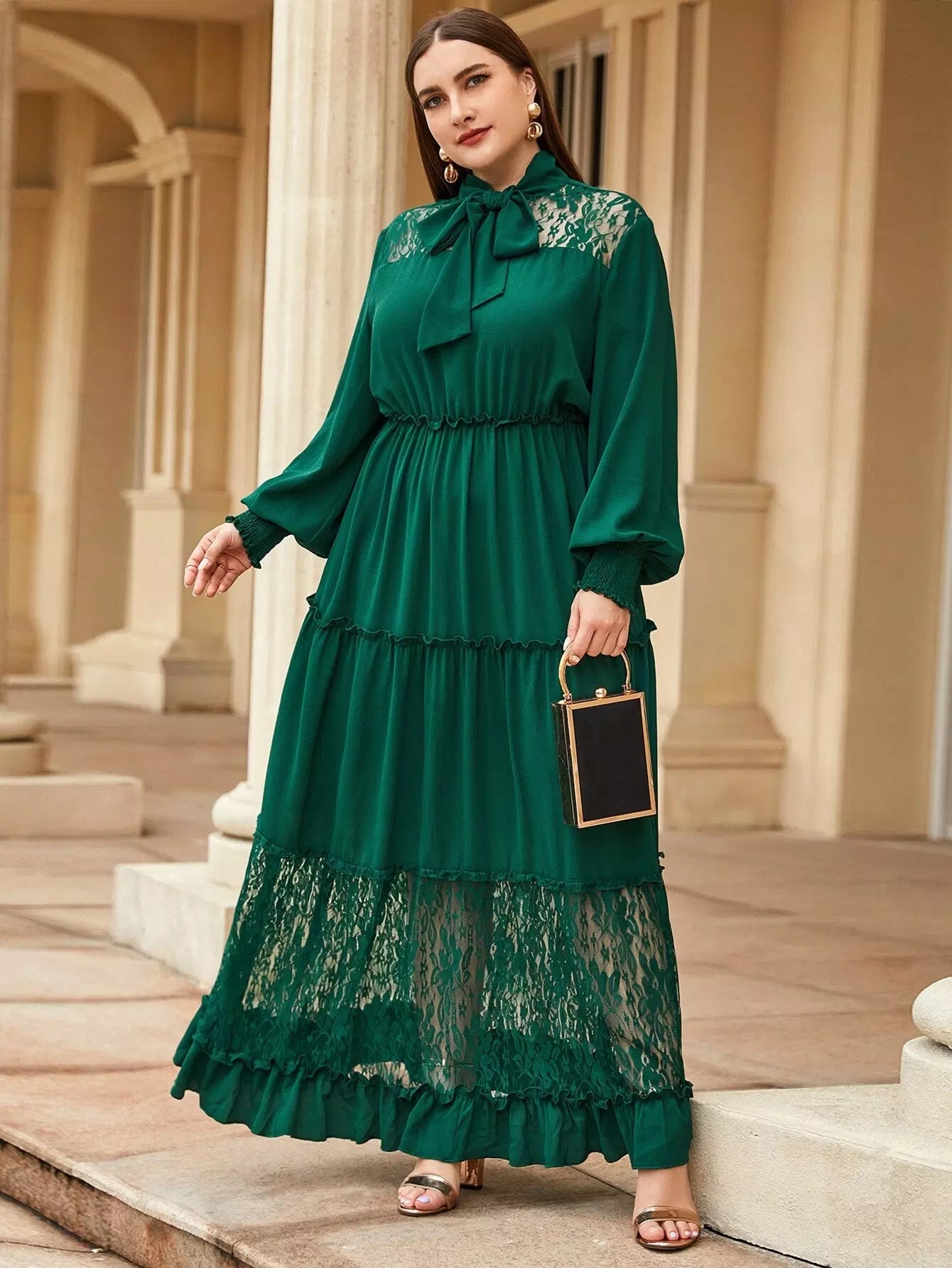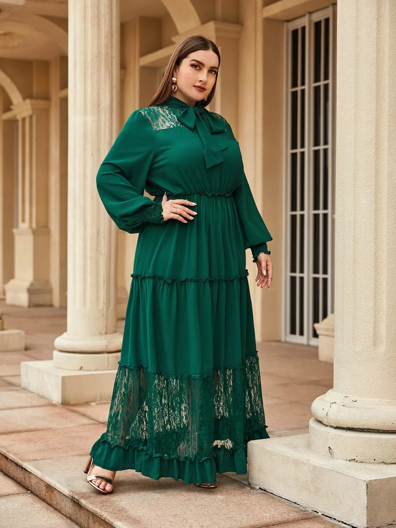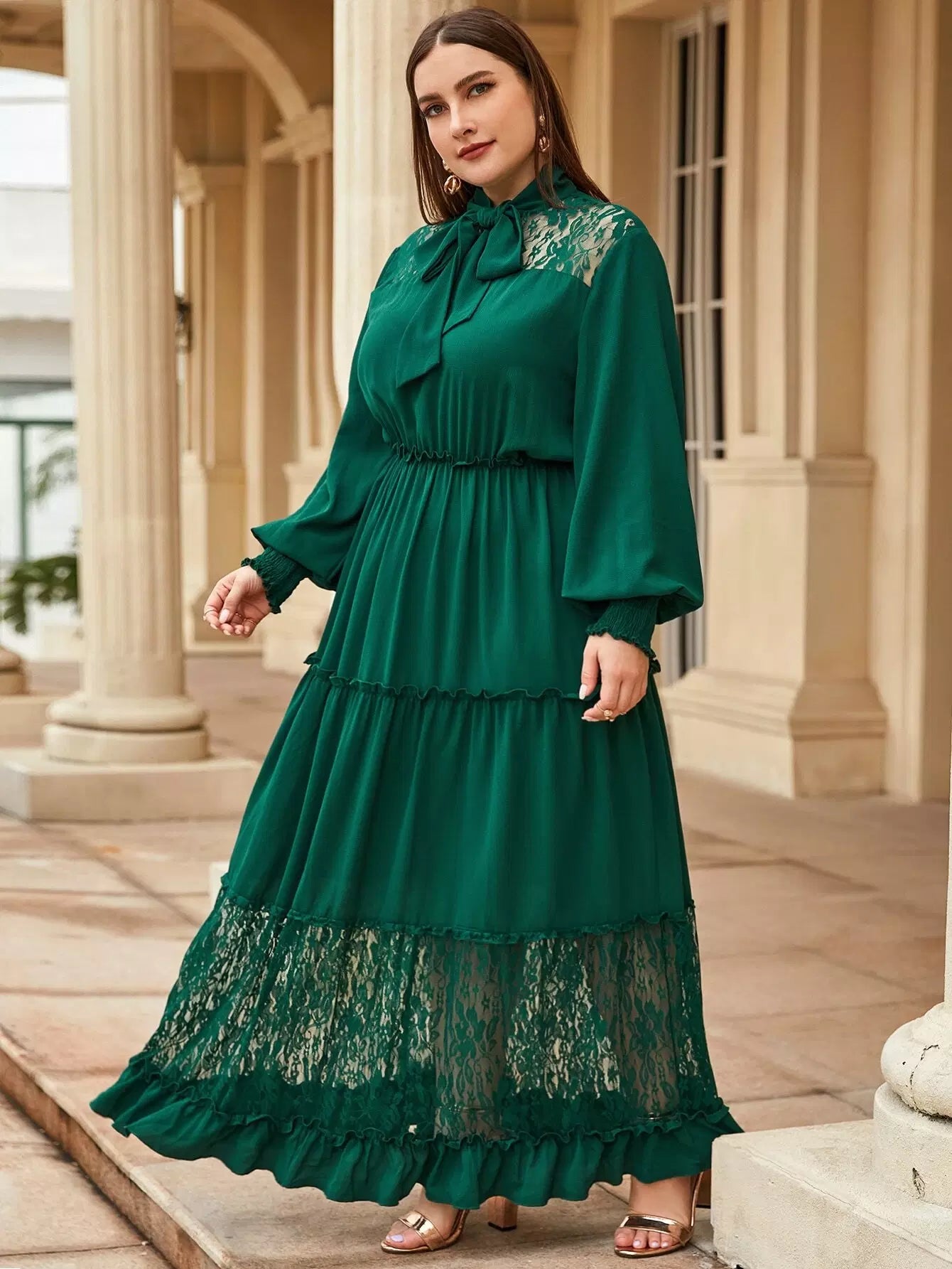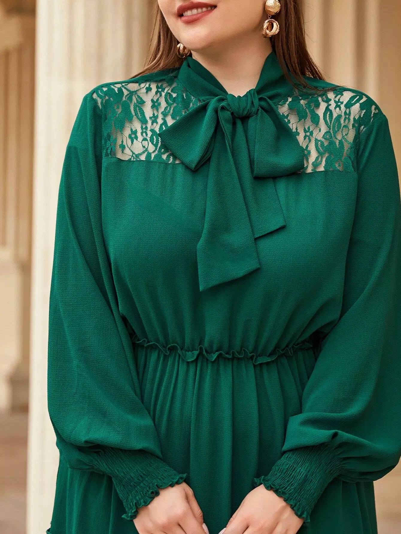 Plus Tie Neck Lace Insert Frill Detail Flounce Hem Dress
