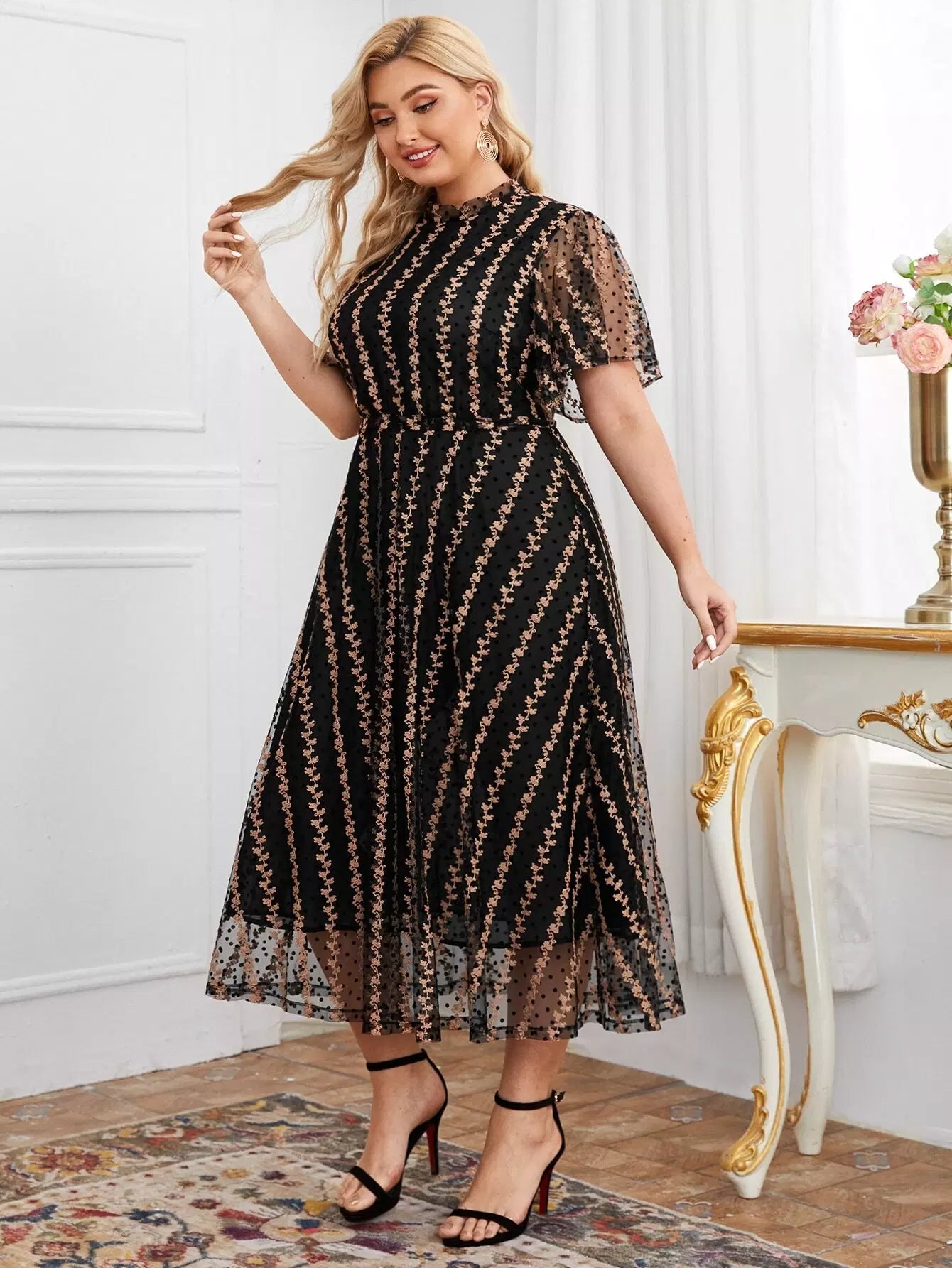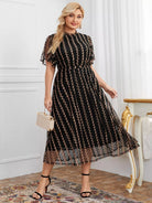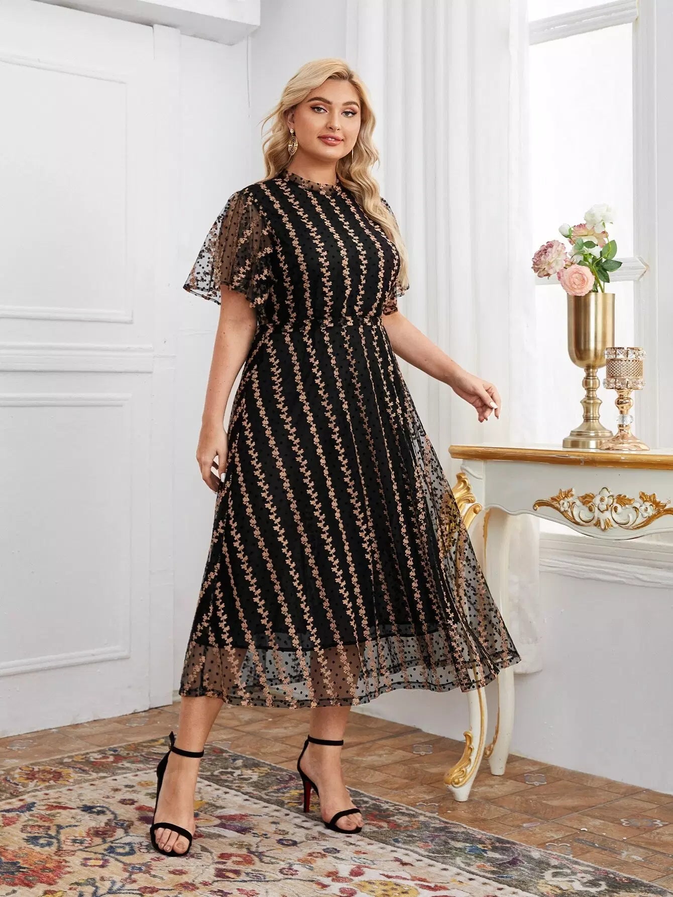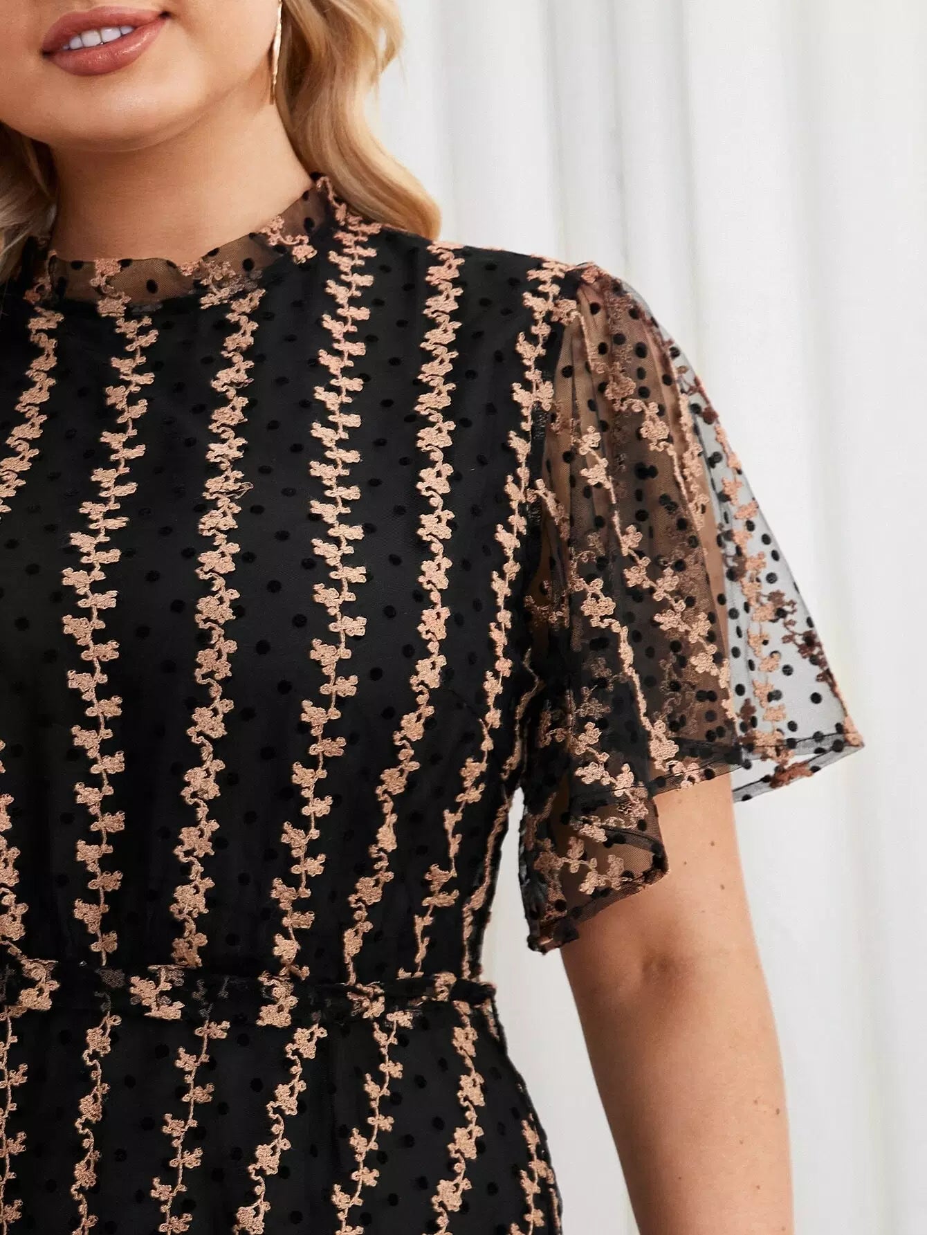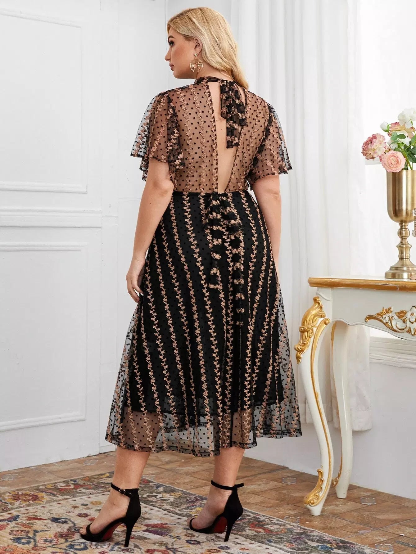 Plus Tied Backless Floral Embroidery Mesh Dress